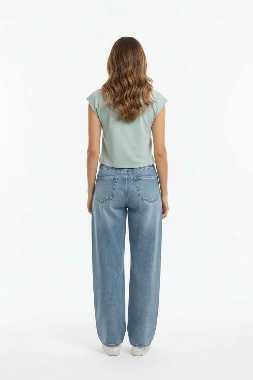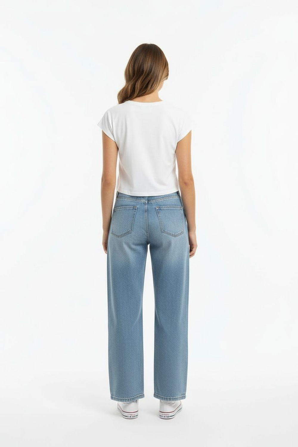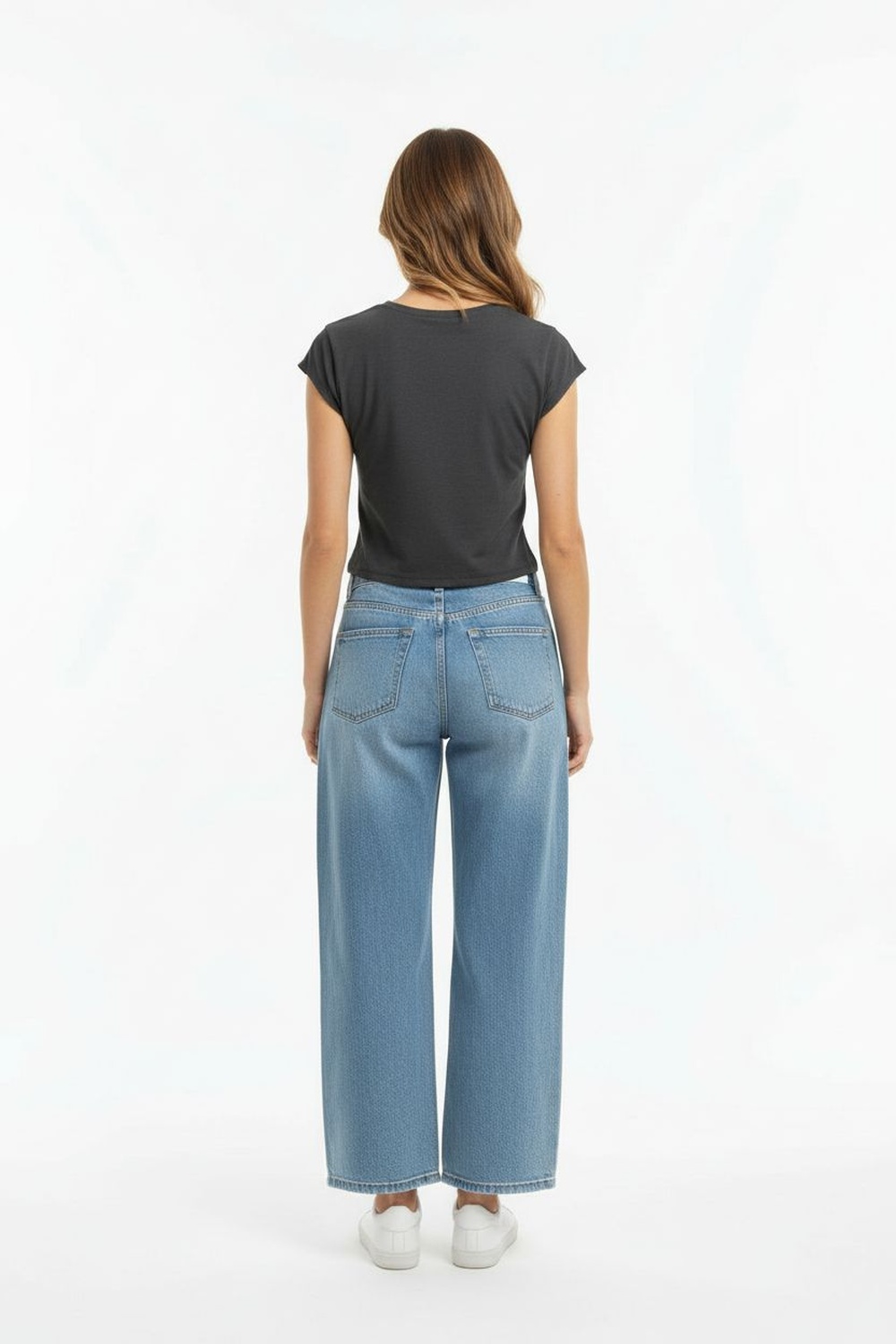 Jeans de pretina alta con cierre frontal de botones, trabillas funcionales, bolsillos delanteros y traseros, ajuste ceñido al cuerpo, estructura firme con terminados definidos