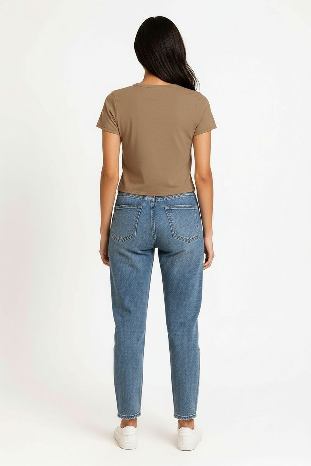 Jeans de tiro alto con pretina ajustable mediante cinta del mismo tejido, corte recto y bolsillos funcionales que combinan practicidad y estilo contemporáneo