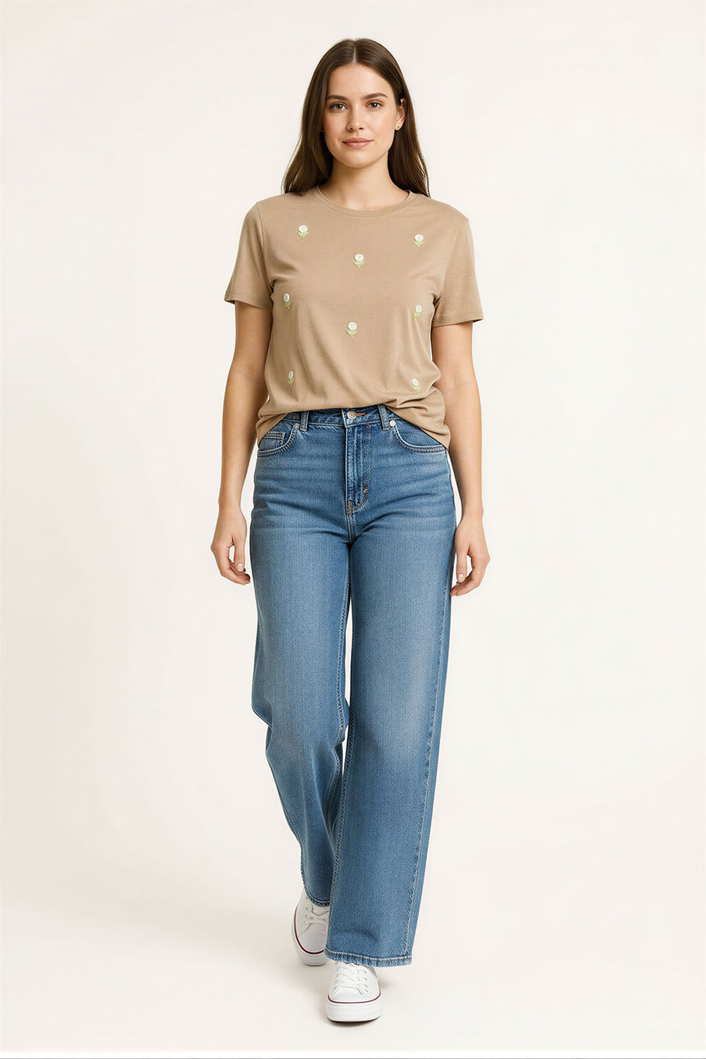 Playera de algodón con cuello redondo y manga corta, detalle bordado distribuido al frente que aporta textura y diseño, corte recto que permite libertad de movimiento, confección suave y ligera ideal para uso prolongado, acabado cómodo que favorece el uso diario
