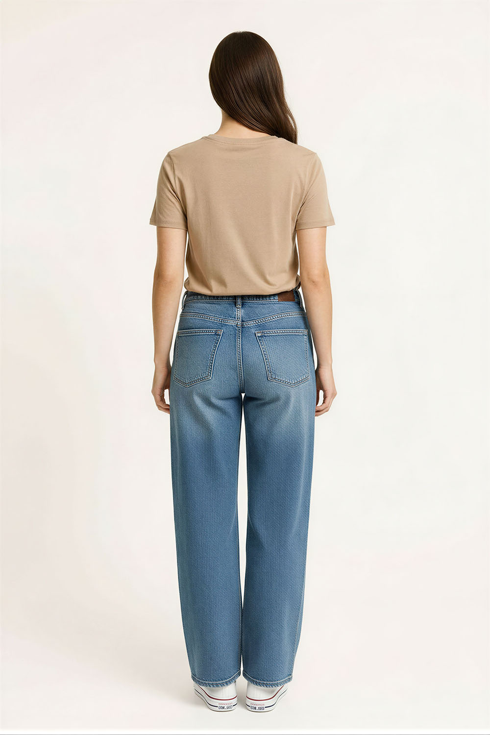 Playera manga corta, cuello redondo, tejido con textura acanalada, estructura suelta en cuerpo, terminación redondeada en bajo