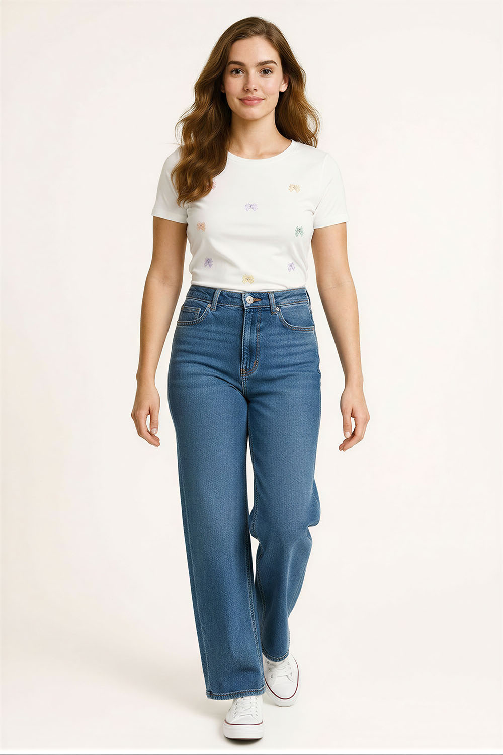 Playera manga corta con escote redondo, aplicación en contorno de cuello con lazos decorativos, terminación en mangas con detalle en contraste, silueta recta, caída ligera