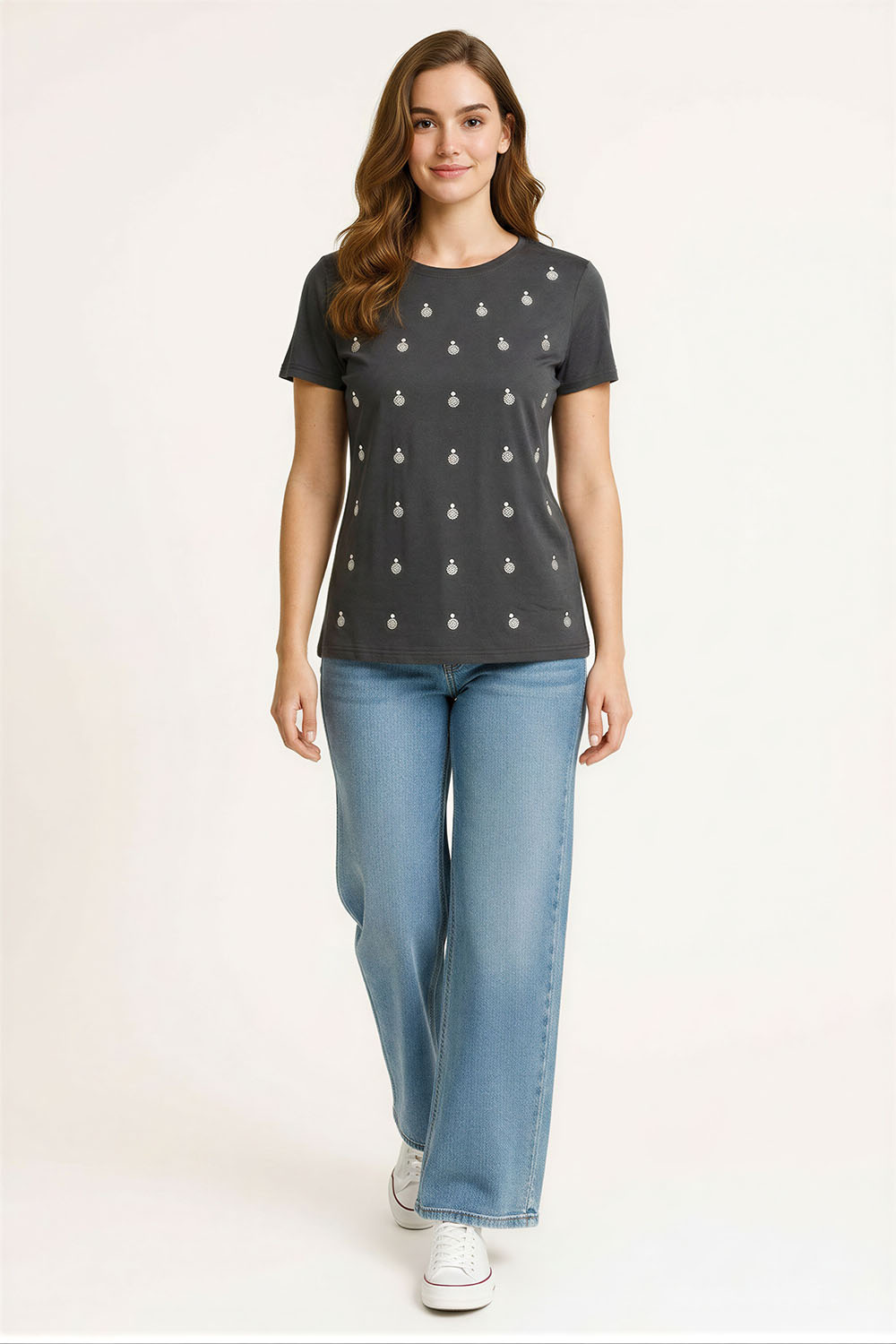 Playera de manga corta con escote redondo fruncido que aporta mejor ajuste, detalle de aplicación en la parte frontal que añade diseño, corte recto que permite comodidad en el uso diario, confección ligera que brinda frescura, acabado suave que mejora la sensación al contacto con la piel