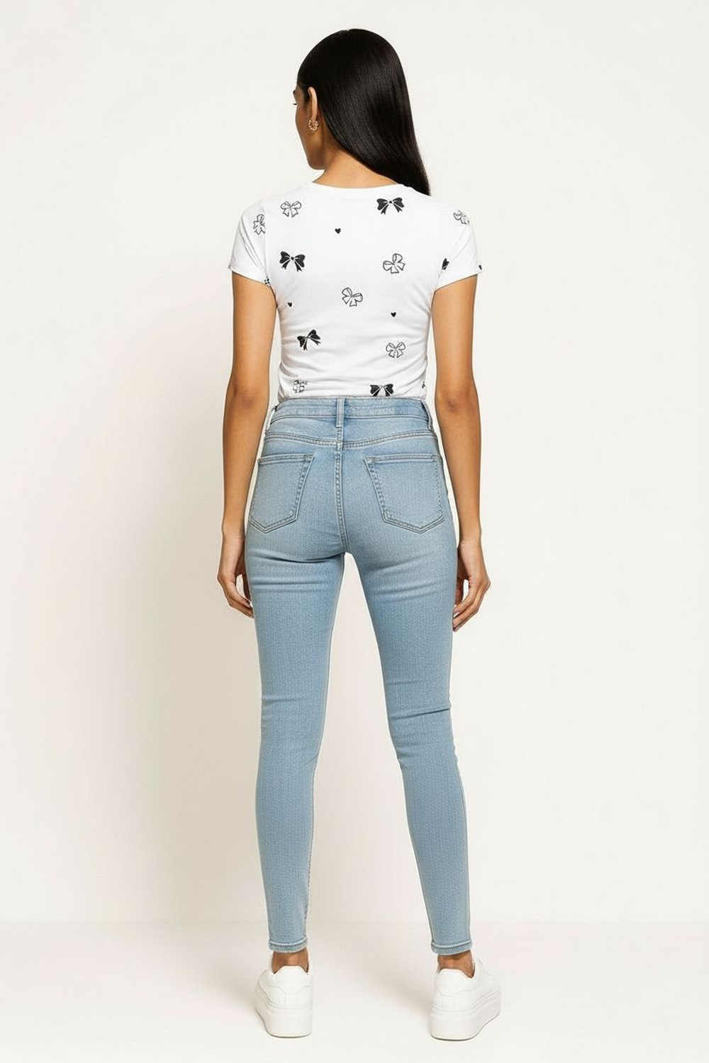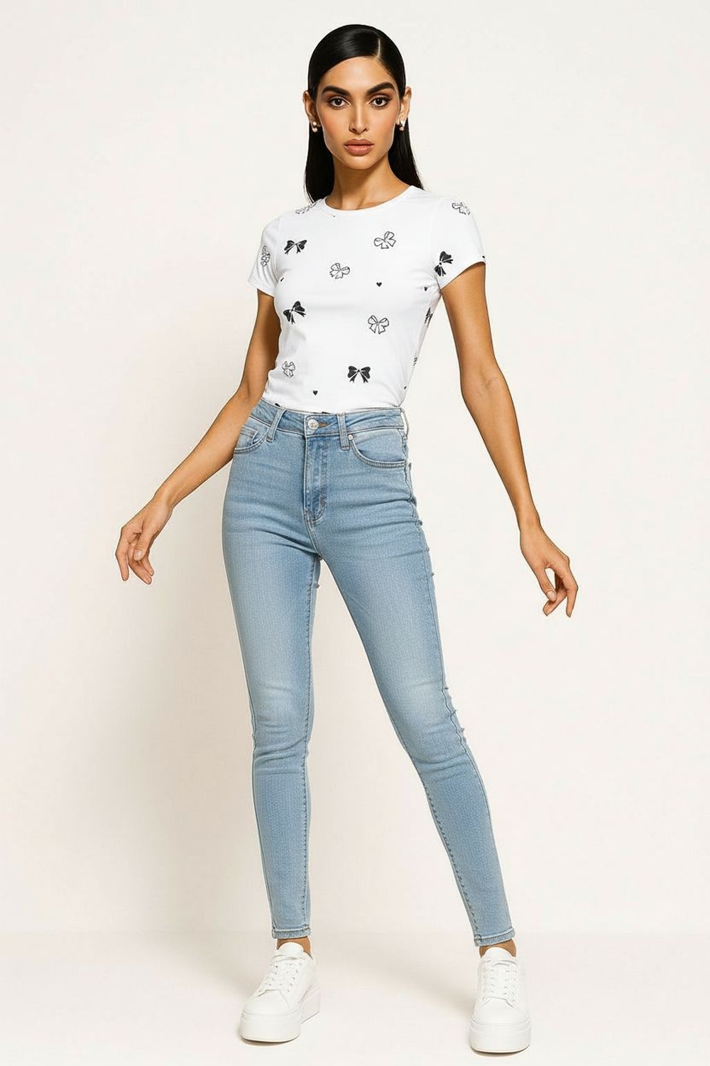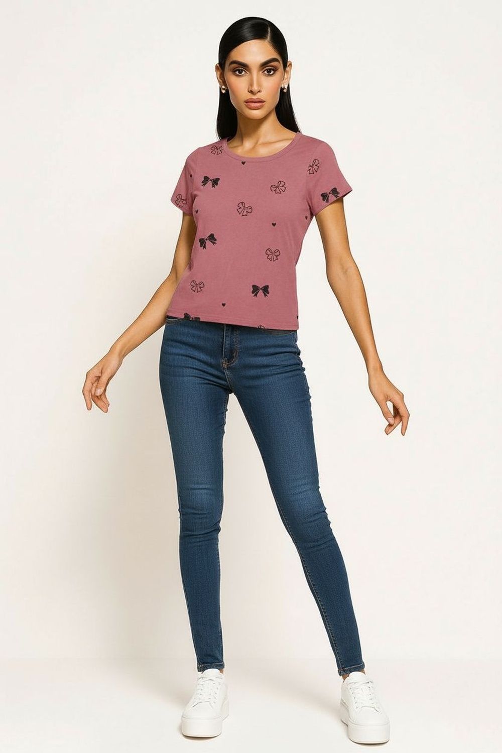 Playera de manga corta con cuello redondo y corte ajustado que define la silueta, confección en tejido flexible que se adapta al cuerpo, aplicación decorativa distribuida de forma equilibrada que aporta atractivo visual, terminación recta en bajo que mantiene una caída uniforme