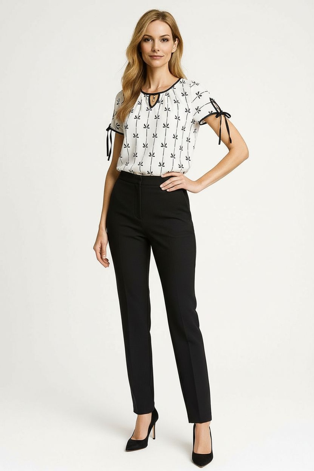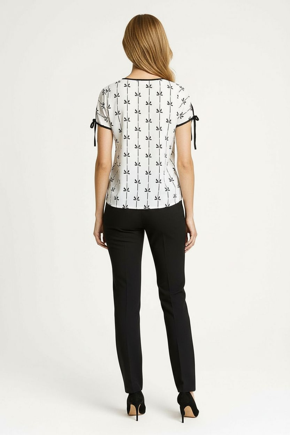 Playera de manga corta con cuello redondo y abertura frontal, aplicación decorativa central que aporta detalle distintivo, ajuste recto en torso, mangas con amarre lateral funcional, largo a la cadera con terminación limpia, confección en tejido suave y transpirable