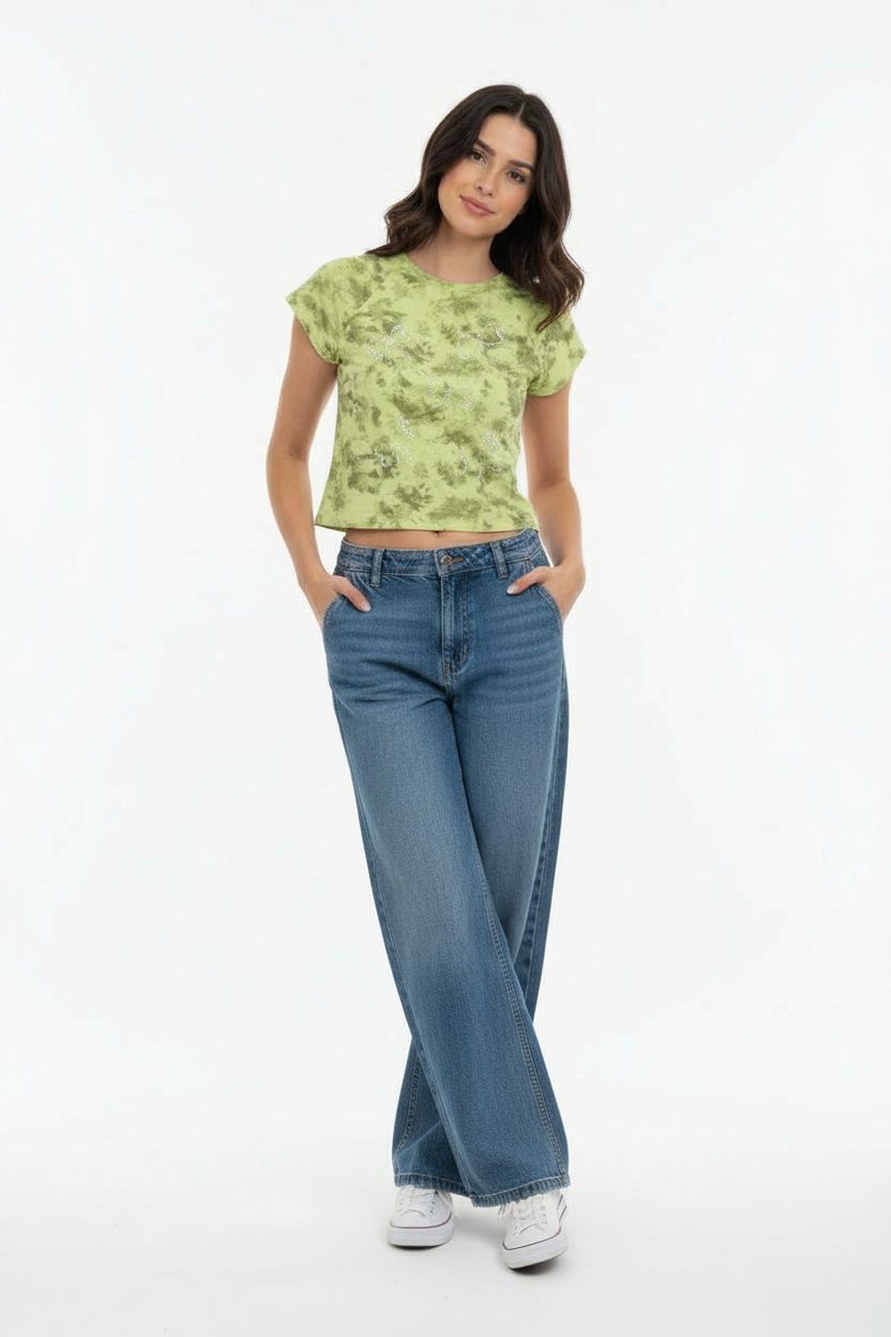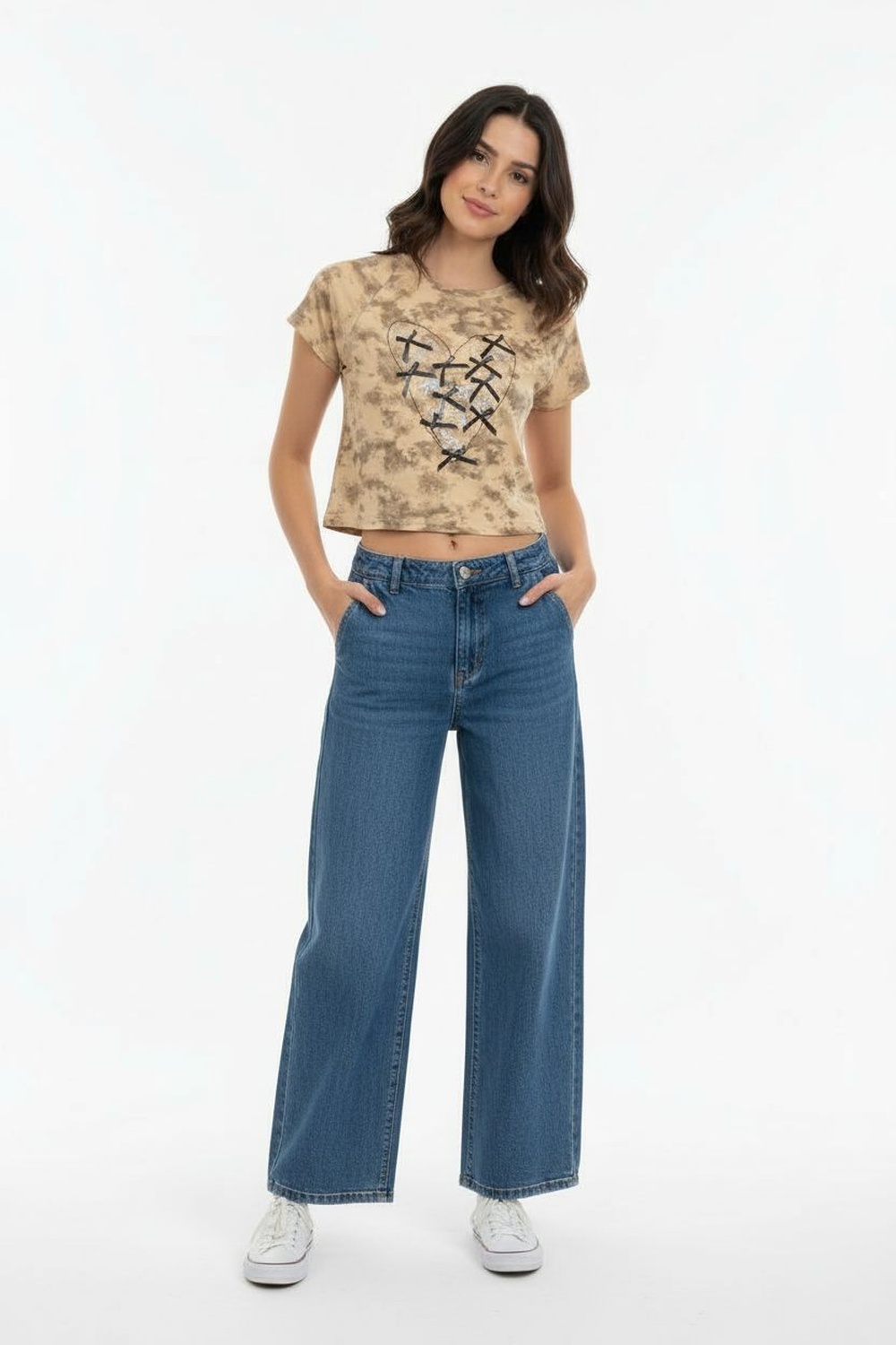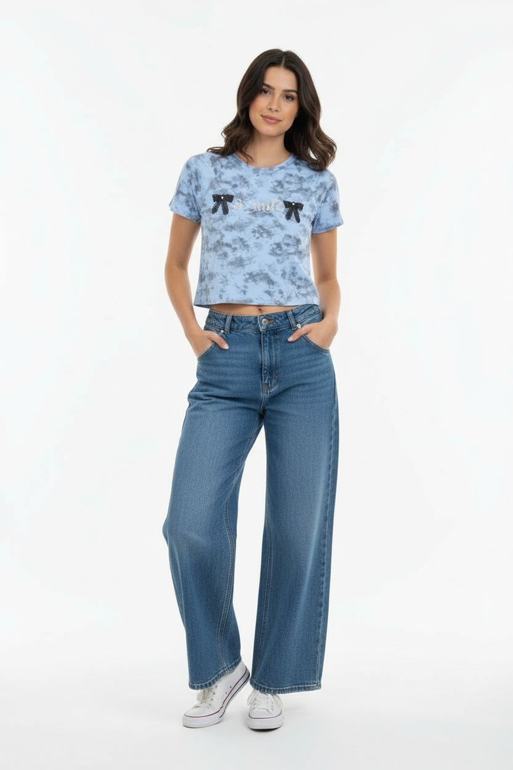 Playera manga corta con aplicación de perlas al frente cuello redondo textura suave ajuste cómodo