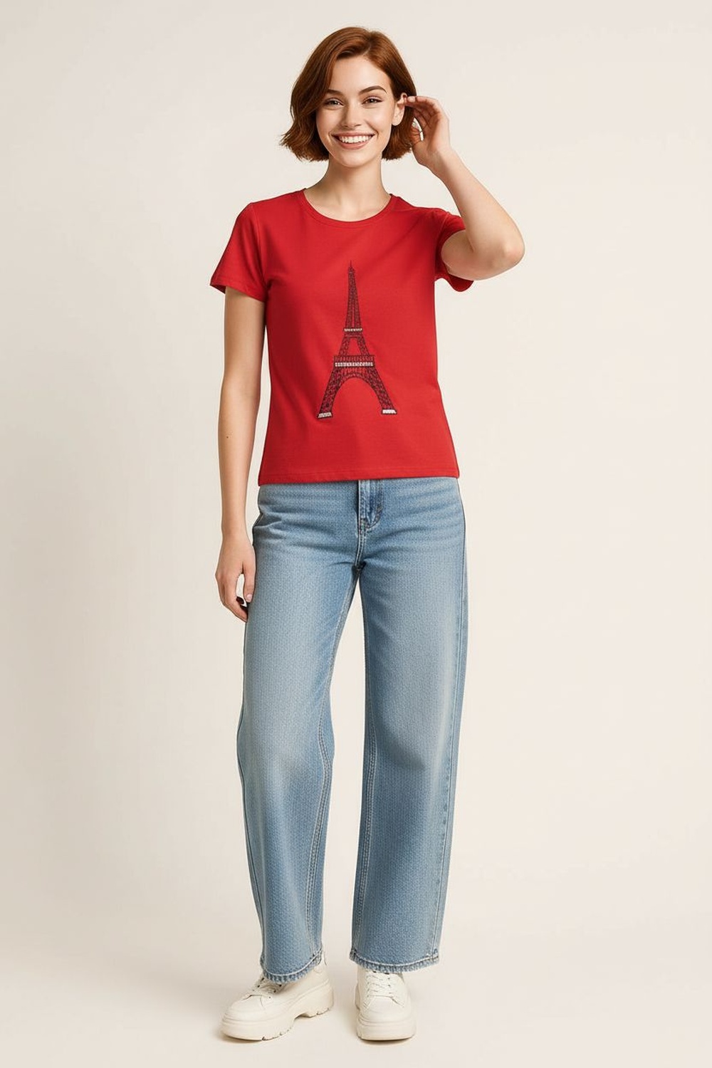 Playera de manga corta con escote redondo, aplicación gráfica al frente, silueta recta al torso, terminación limpia en mangas y ruedo