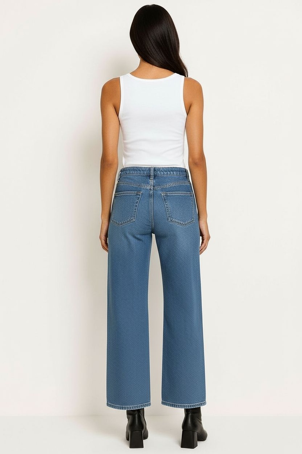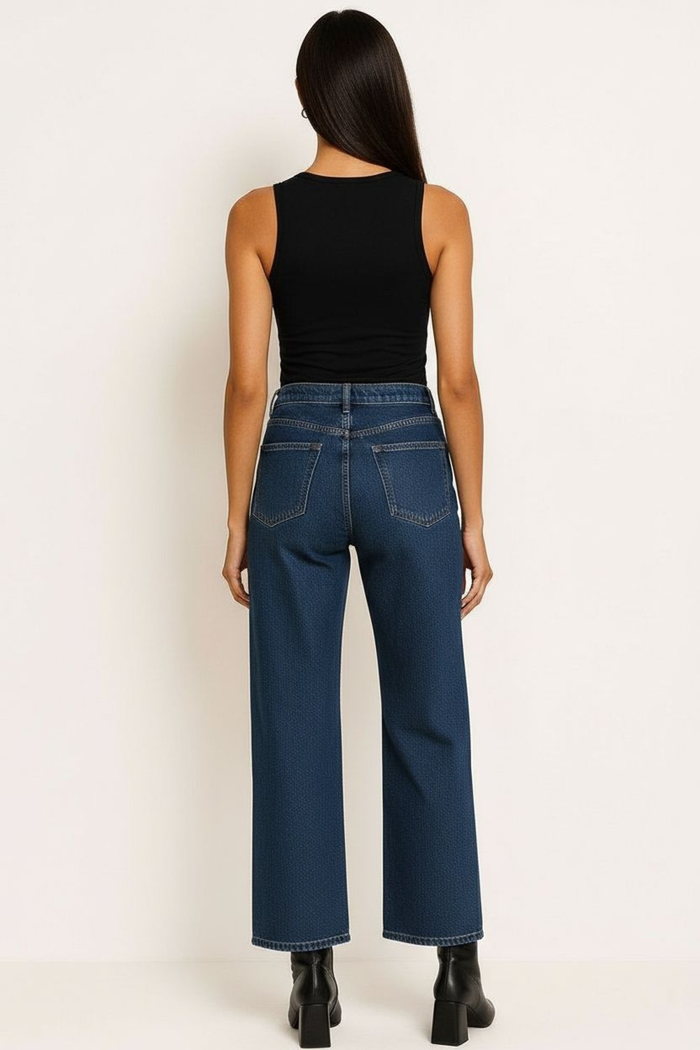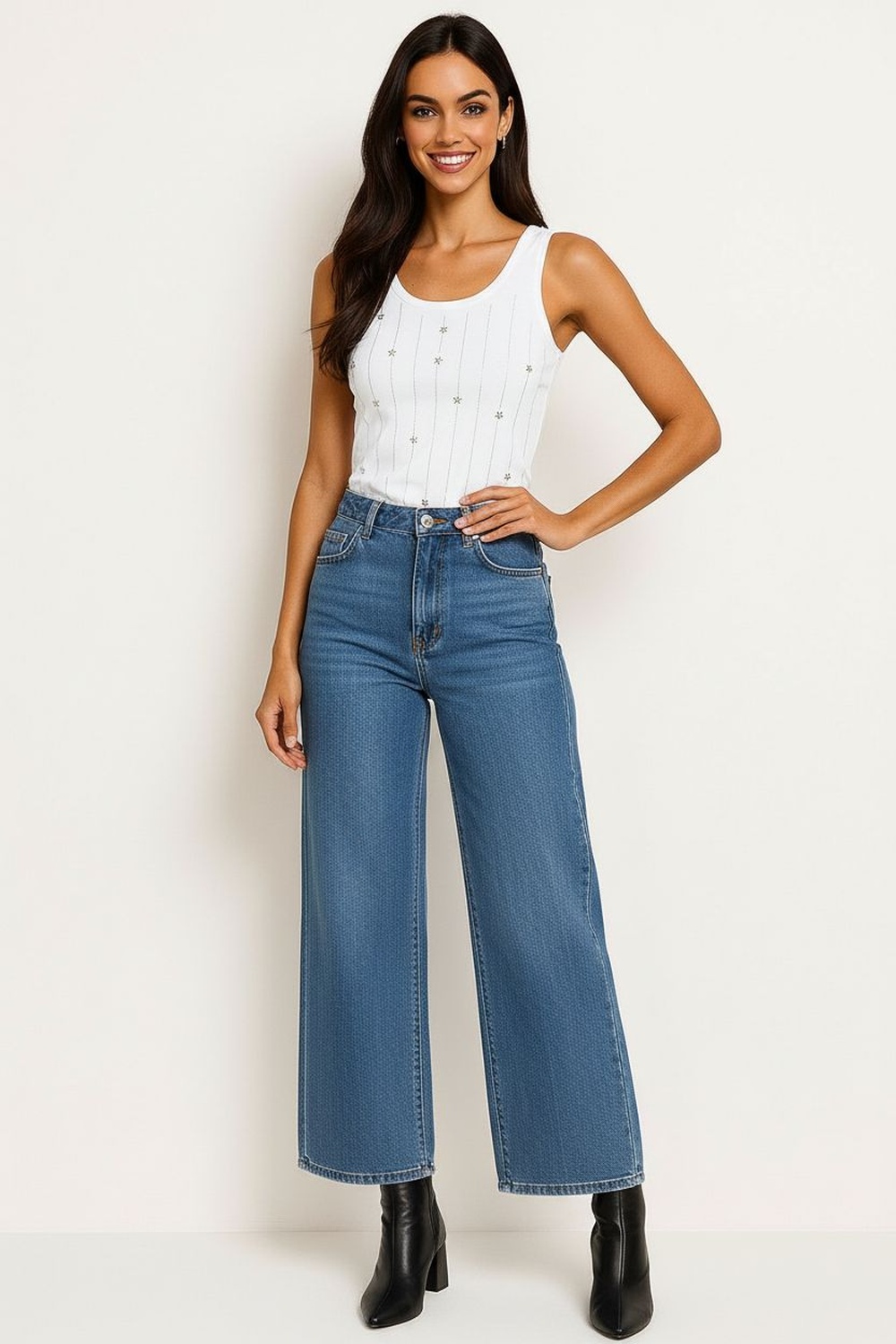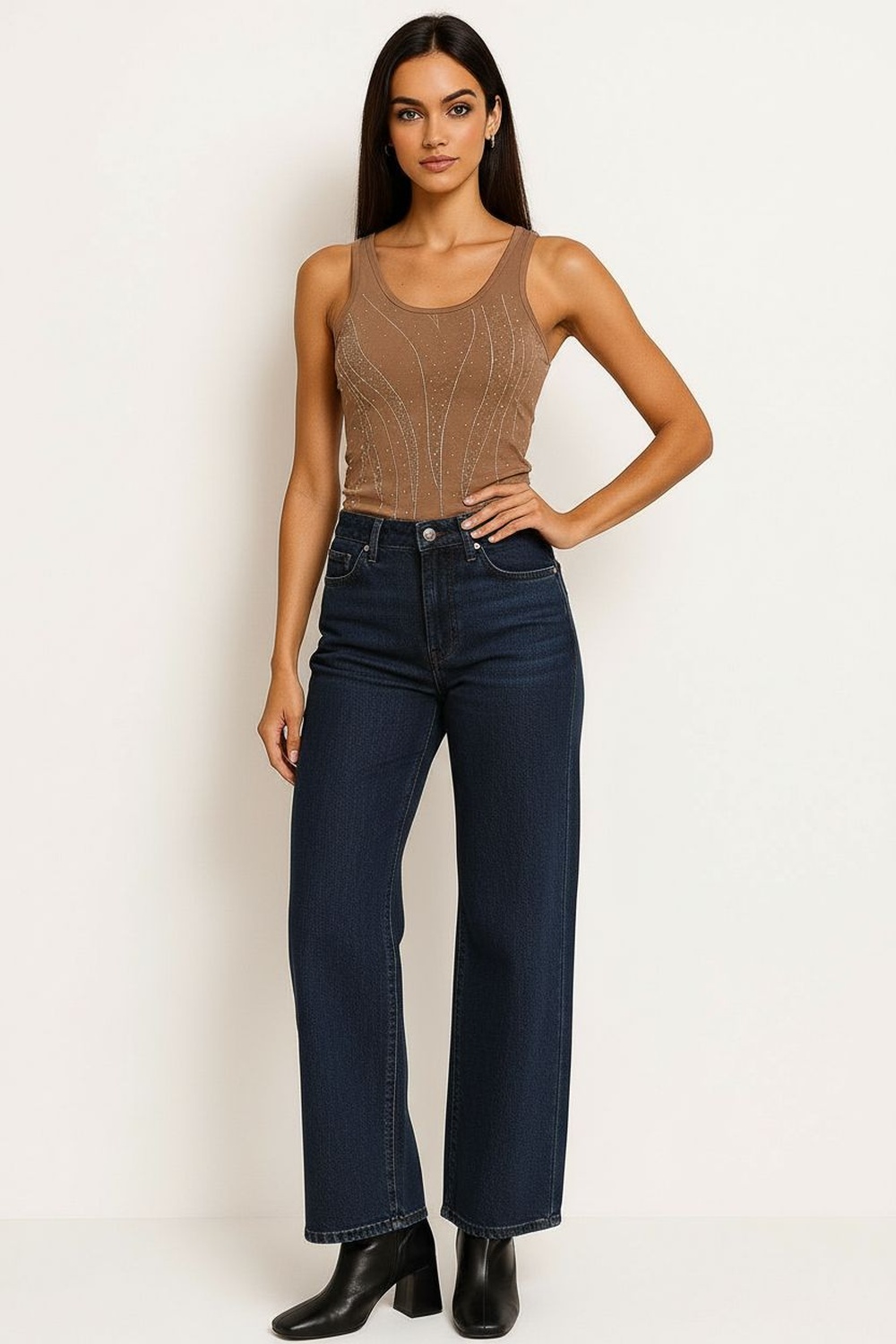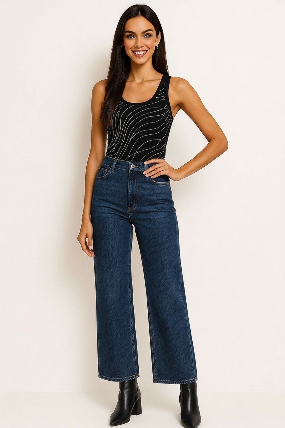 Playera sin mangas con cuello redondo amplio que permite comodidad, silueta recta que se ajusta de manera natural, confección en tejido suave con aplicaciones brillantes distribuidas verticalmente, estructura ligera que mantiene la forma, terminaciones cuidadas en cuello y sisas