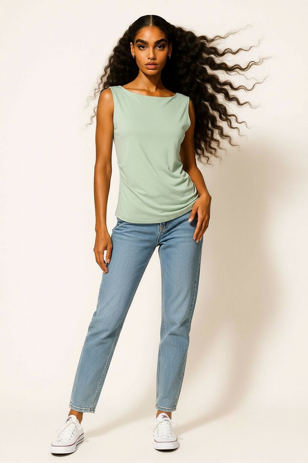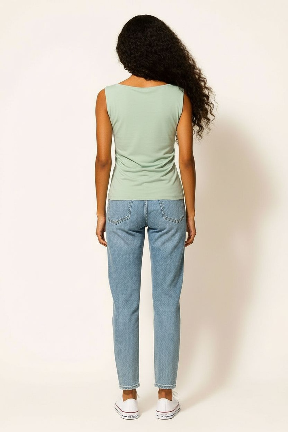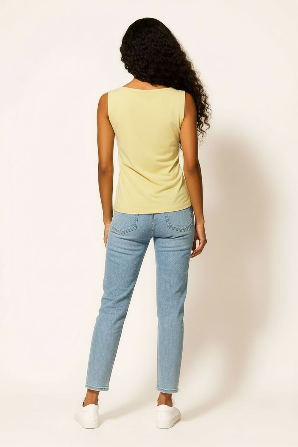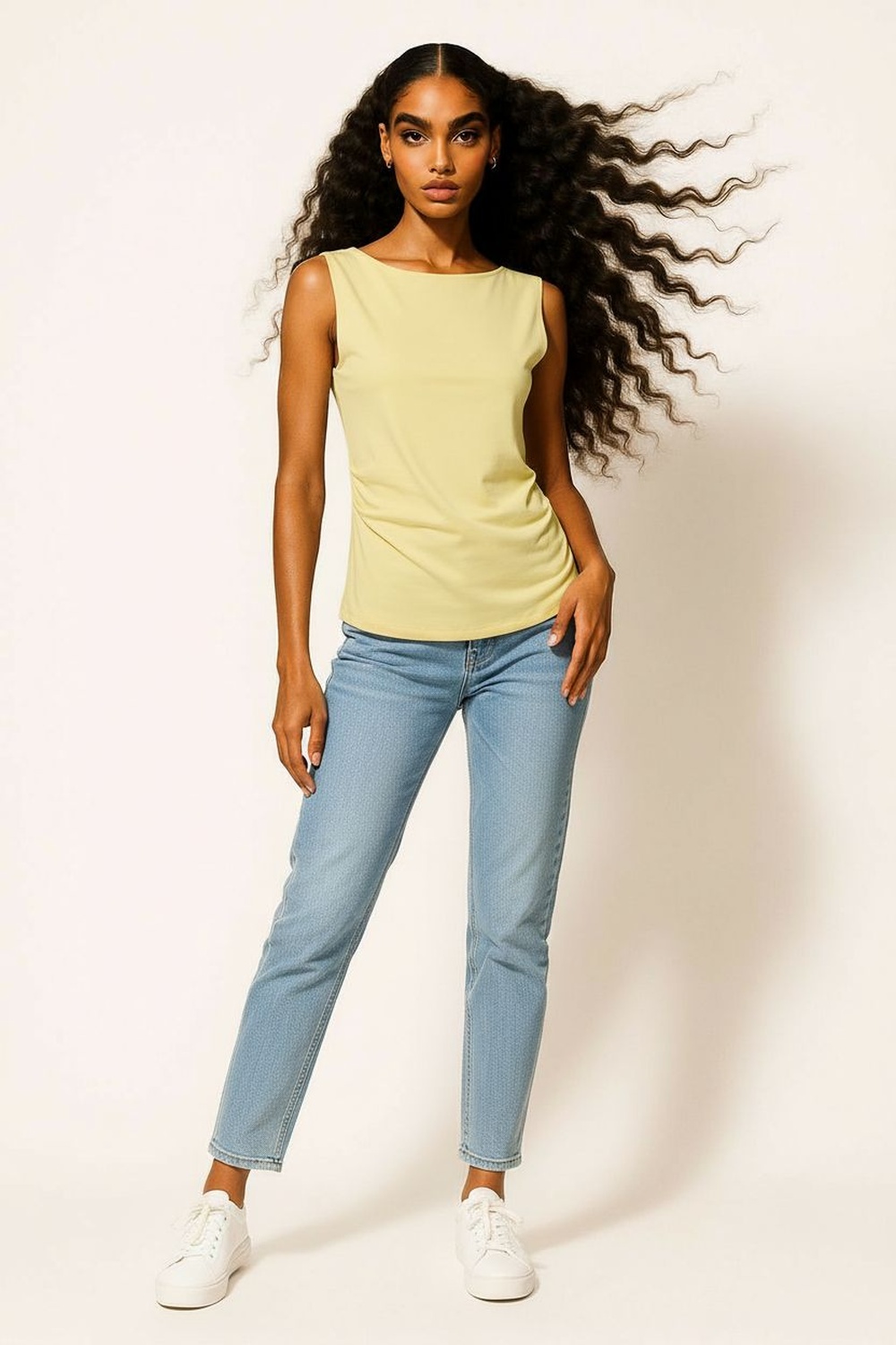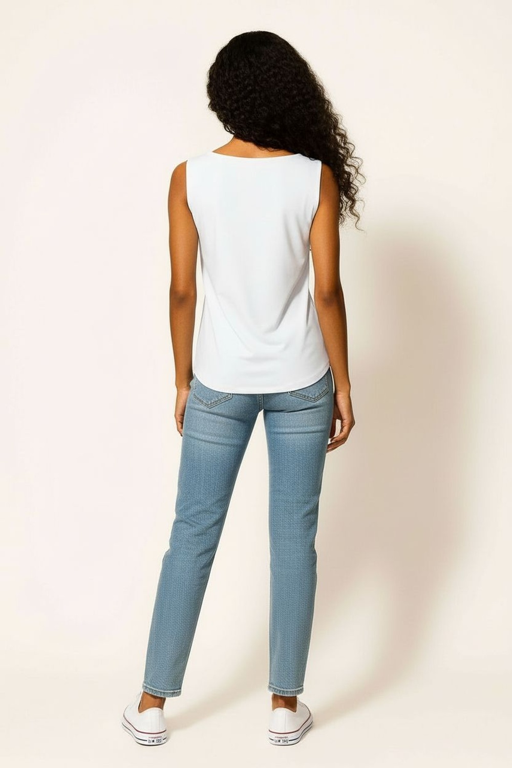 Playera sin mangas con diseño asimétrico en el largo que aporta dinamismo a la prenda, cuello cerrado con terminación pulida, ajuste semi entallado que se adapta al cuerpo, confección en tejido ligero de tacto suave, costados con caída natural que mantienen una silueta definida