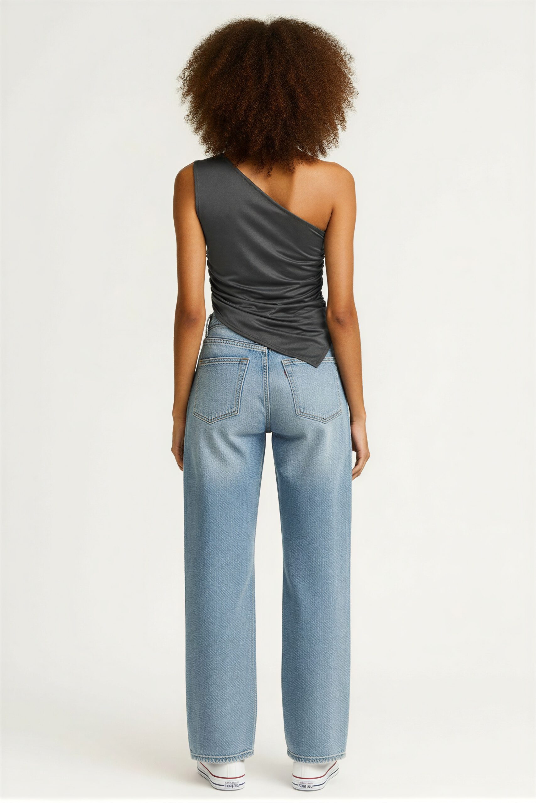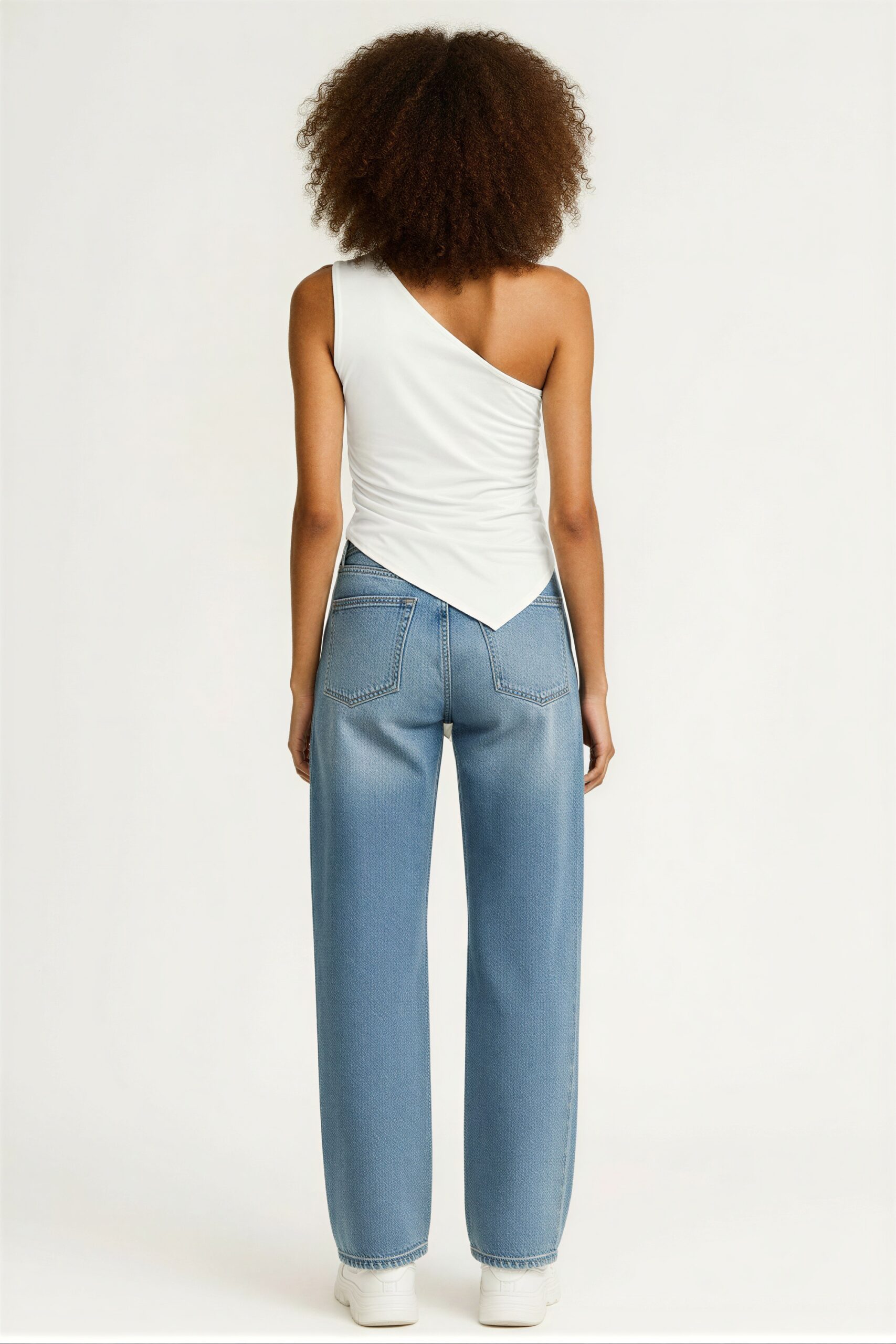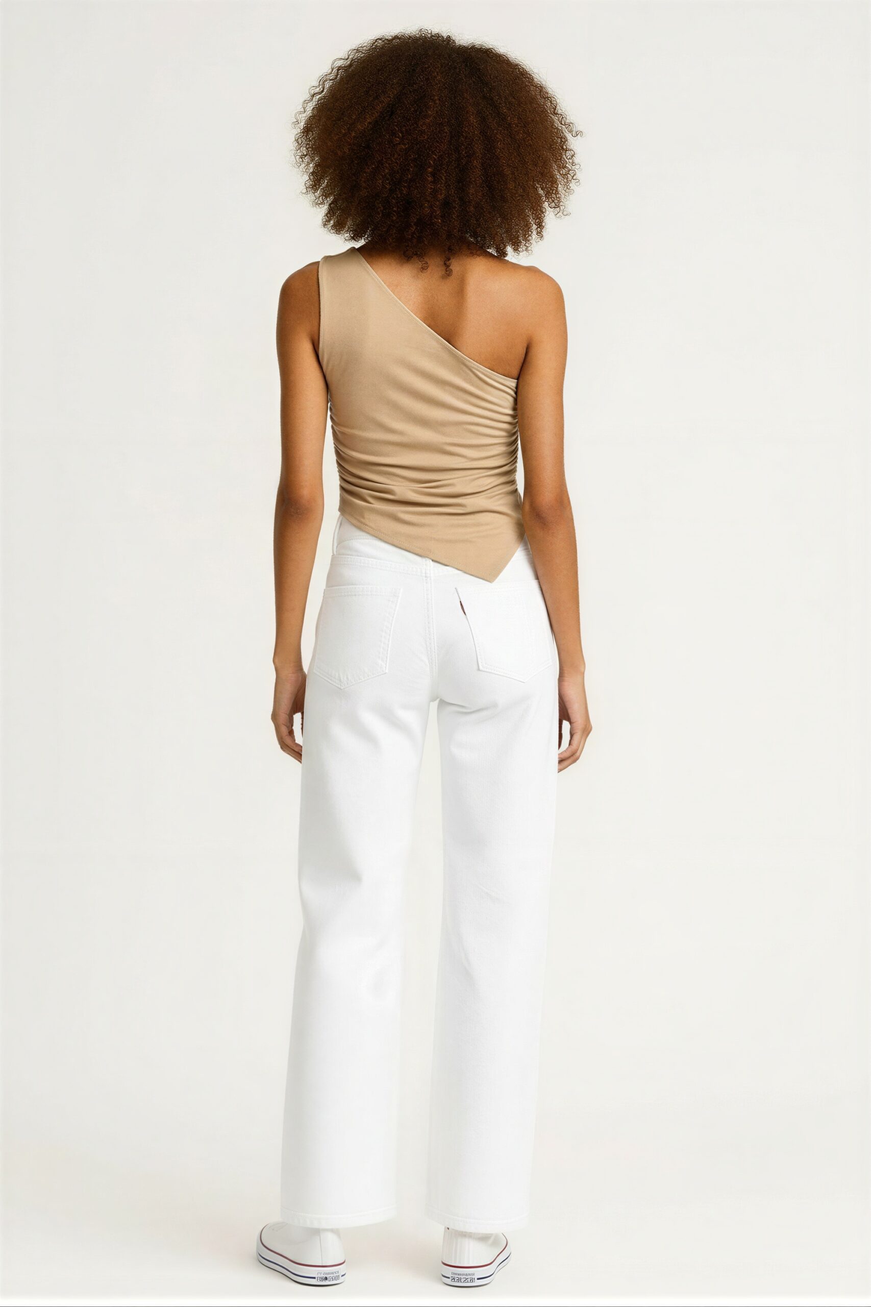 Playera con diseño asimétrico de un hombro, ajuste al cuerpo, tela suave con caída ligera, terminación irregular en parte inferior, confección ligera y cómoda
