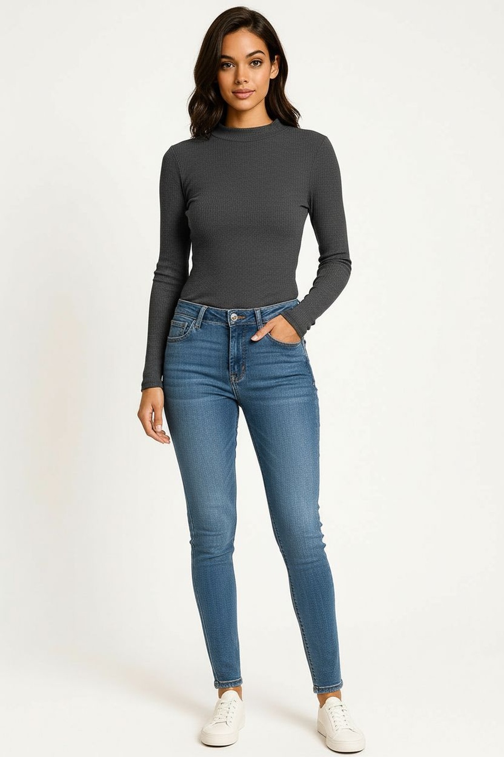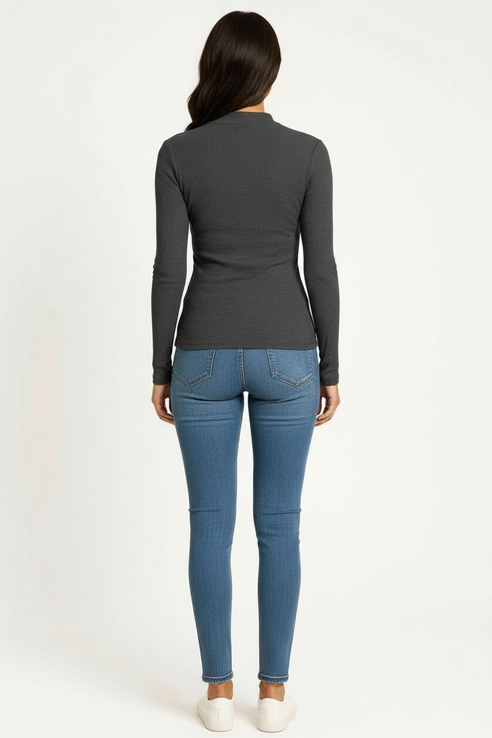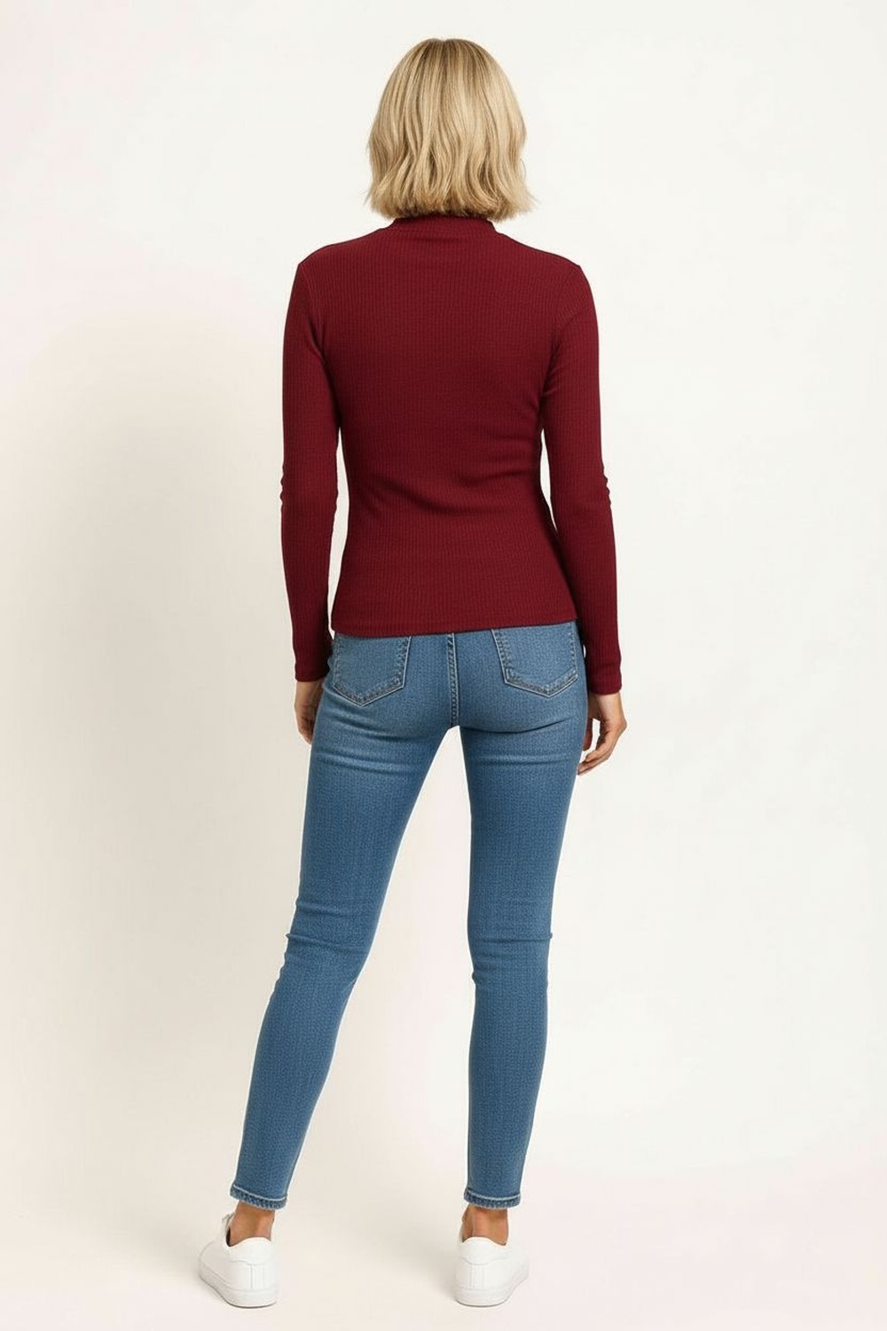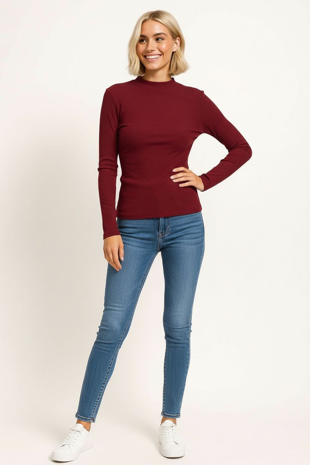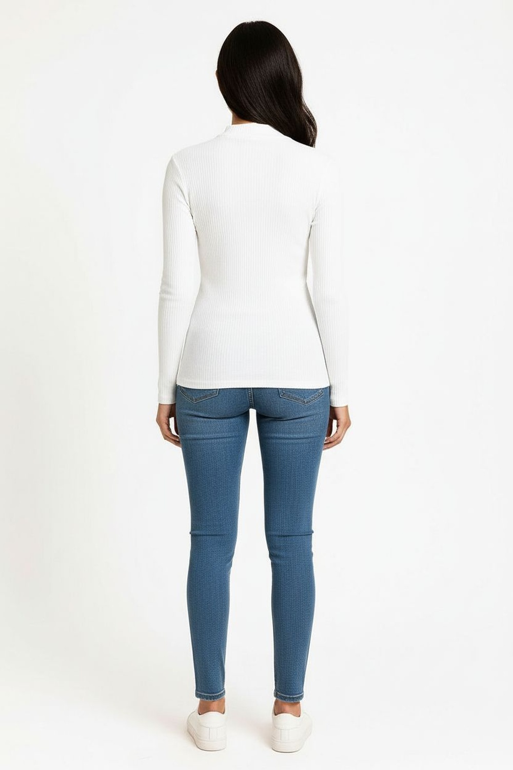 Playera de manga larga con cuello alto que aporta un estilo moderno y versátil, diseño básico ideal como prenda de fondo de armario, confección en tejido acanalado que brinda suavidad y comodidad, ajuste al cuerpo que favorece la silueta, perfecta para combinar con diferentes prendas de temporada