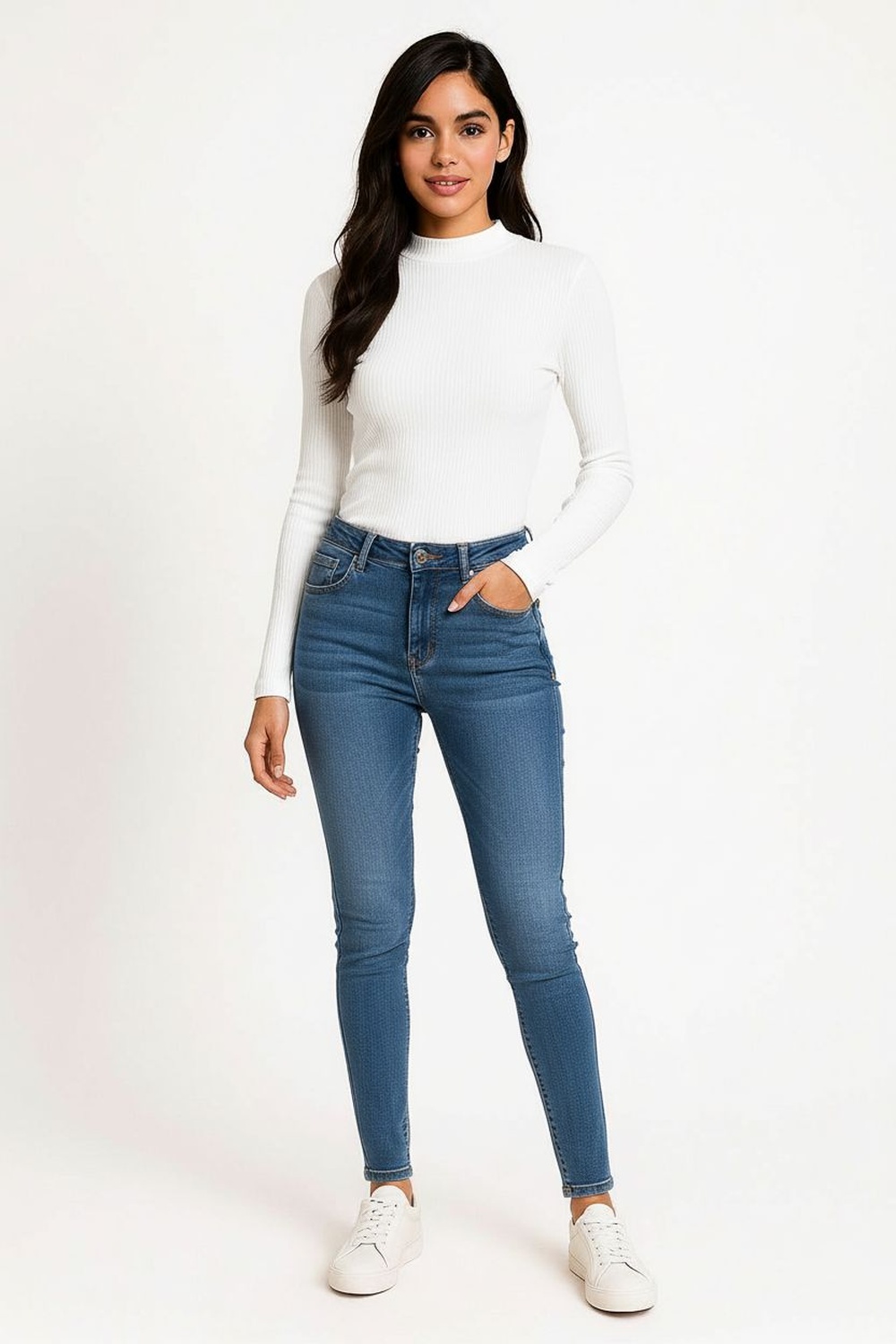 Suéter de manga larga con cuello alto que ofrece un diseño moderno y elegante, cierre frontal completo que permite un ajuste versátil y práctico, confección en tejido acanalado que brinda comodidad y suavidad al contacto con la piel, ajuste en puños y cintura que favorece la silueta, ideal para looks casuales y combinaciones de temporada