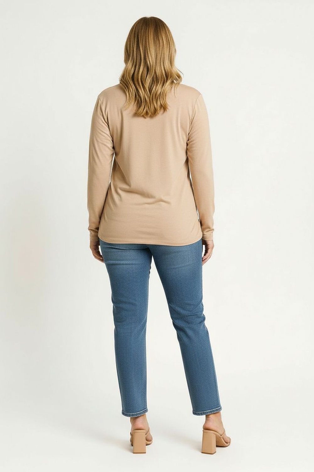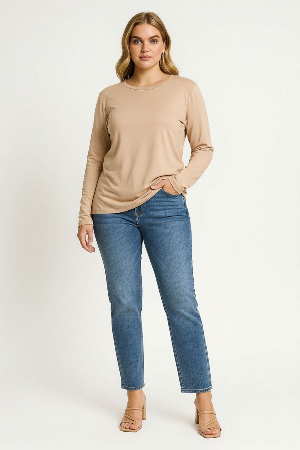 Playera de manga larga con cuello redondo clásico que brinda comodidad, confección en tela suave y ligera que asegura frescura, ajuste regular que favorece la silueta, prenda esencial que se adapta a distintas combinaciones, ideal como básico de temporada para crear looks casuales o de oficina