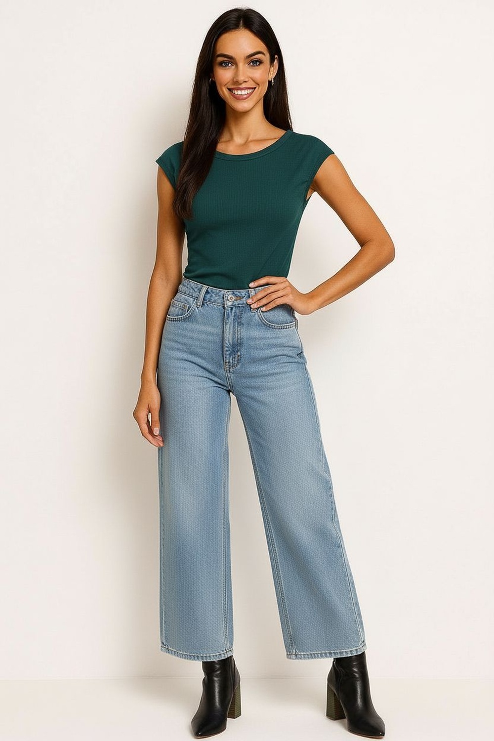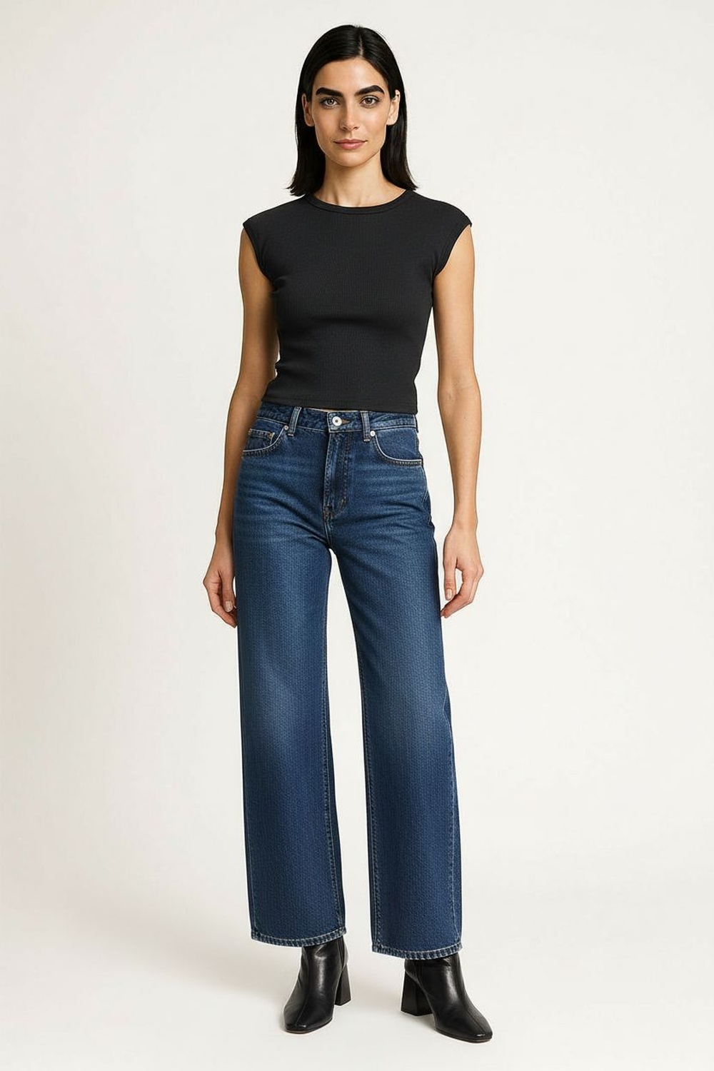 Jeans de tiro alto con pretina reforzada, bolsillos cargo laterales amplios para mayor funcionalidad, costuras visibles que estructuran la silueta, pernera recta que brinda movilidad cómoda, cierre frontal con botón metálico y zipper para mejor sujeción, confección en mezclilla resistente para uso diario