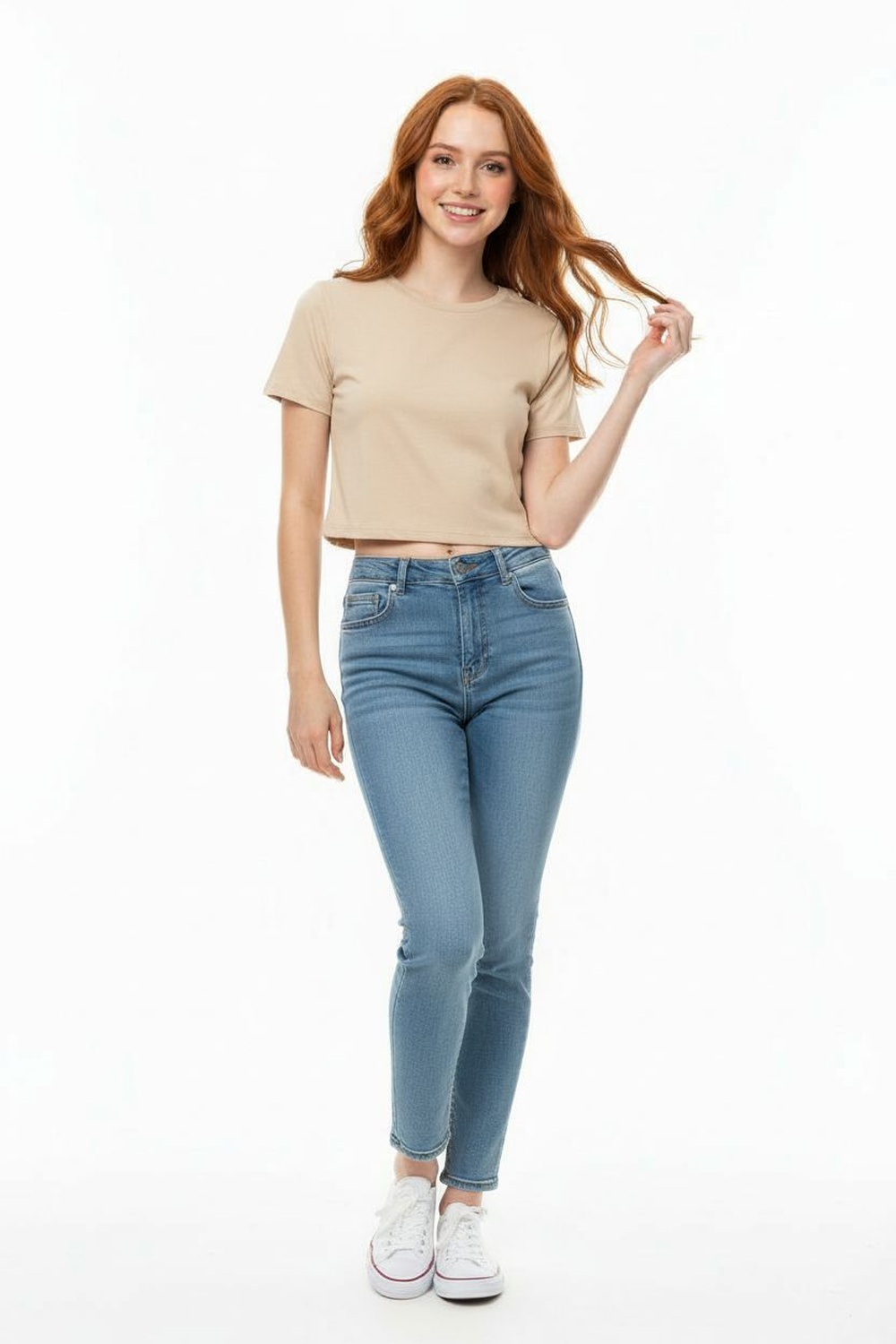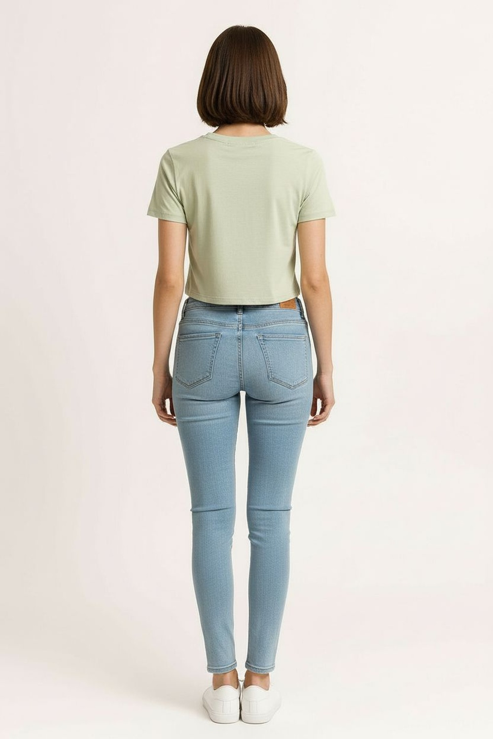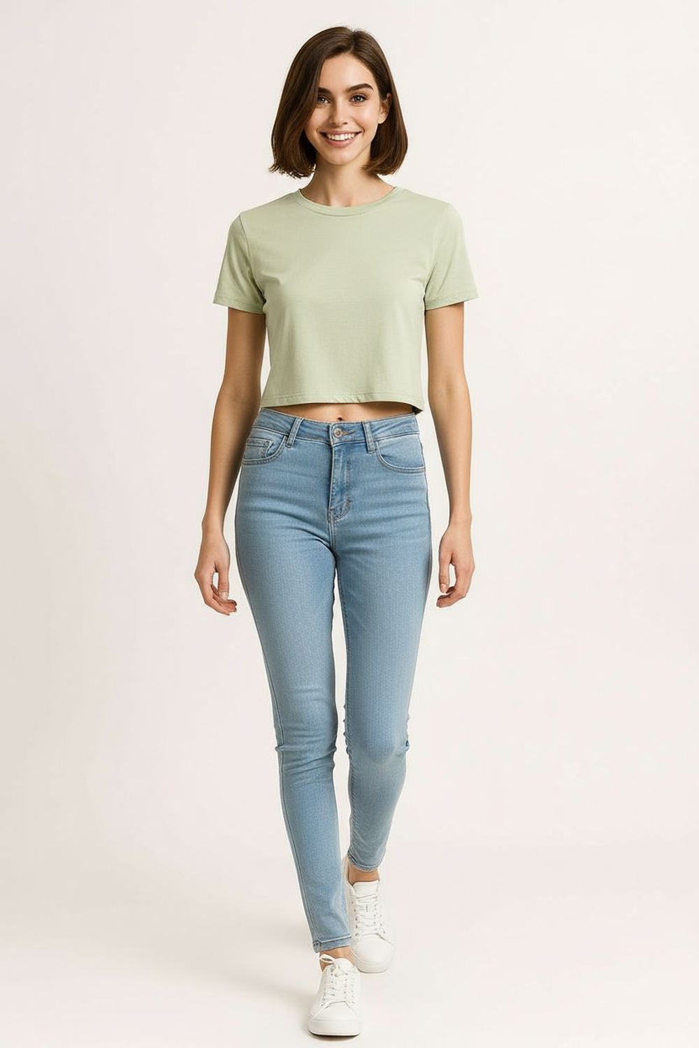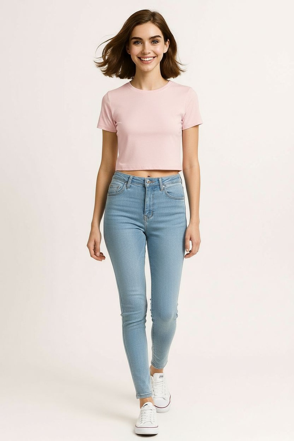 Playera básica de manga corta con cuello redondo, ajuste al cuerpo, corte recto, largo a la cintura, terminados limpios