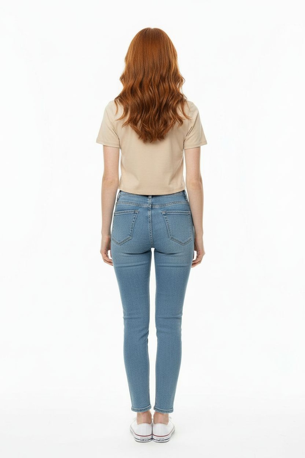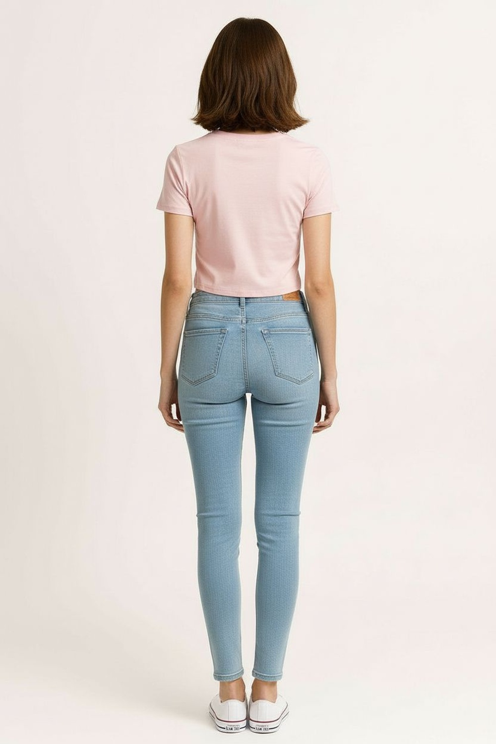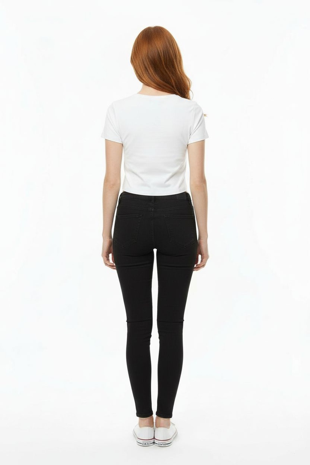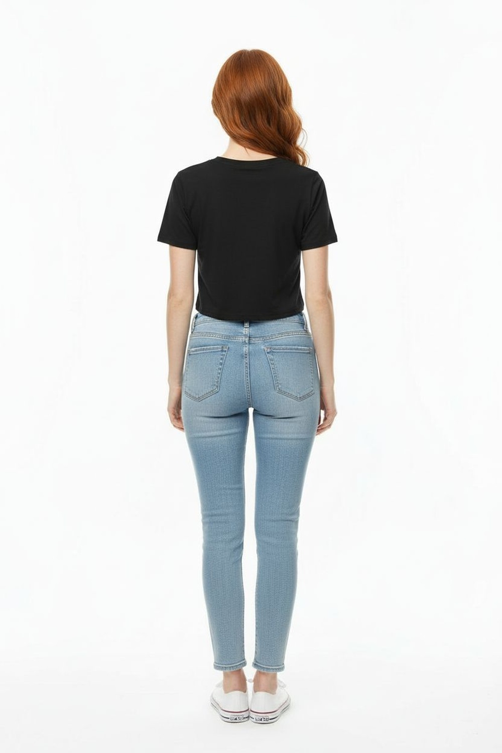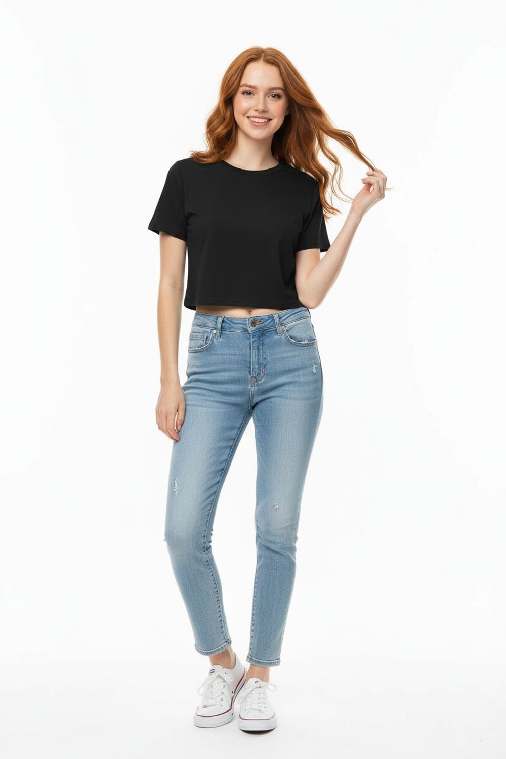 Playera básica de manga corta con cuello redondo, ajuste al cuerpo, corte recto, largo a la cintura, terminados limpios
