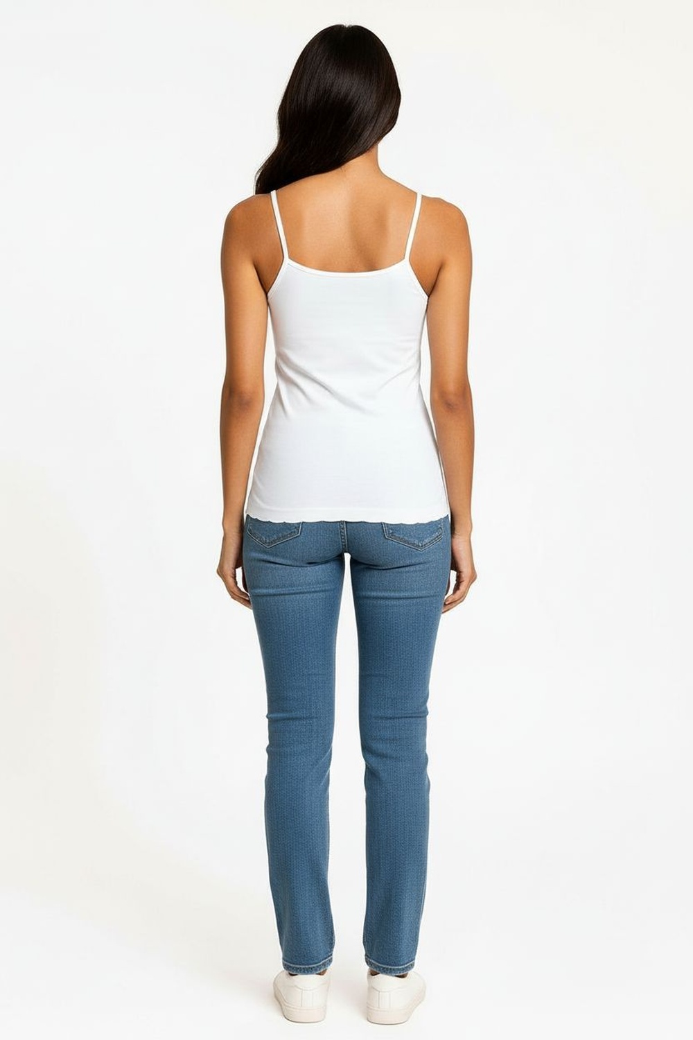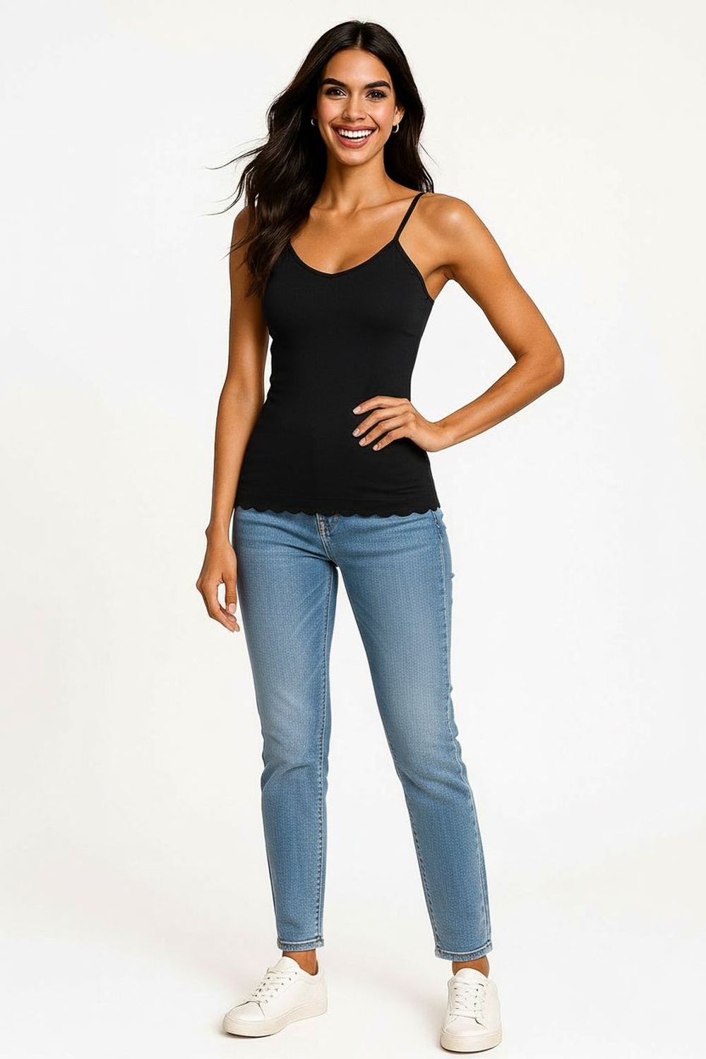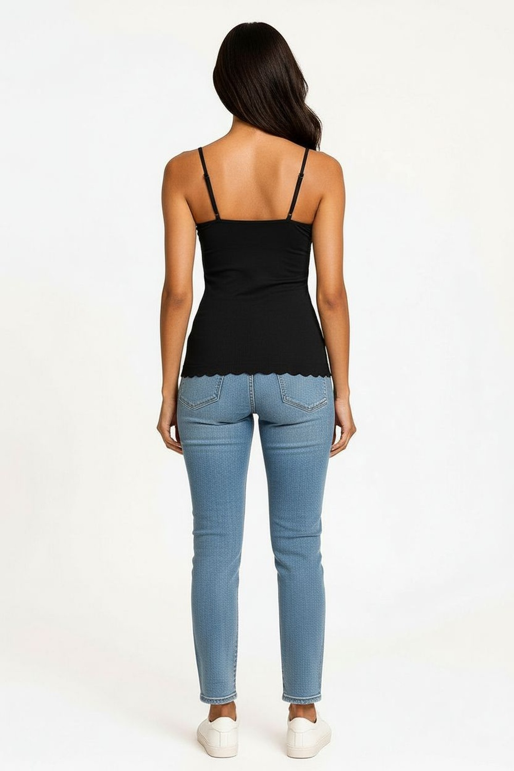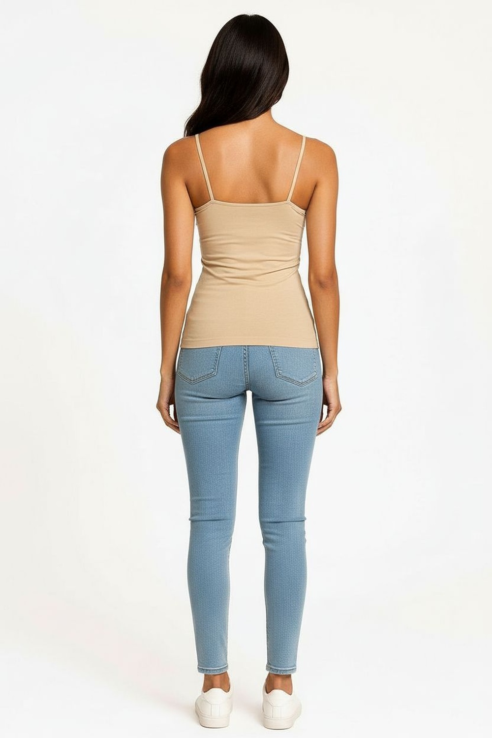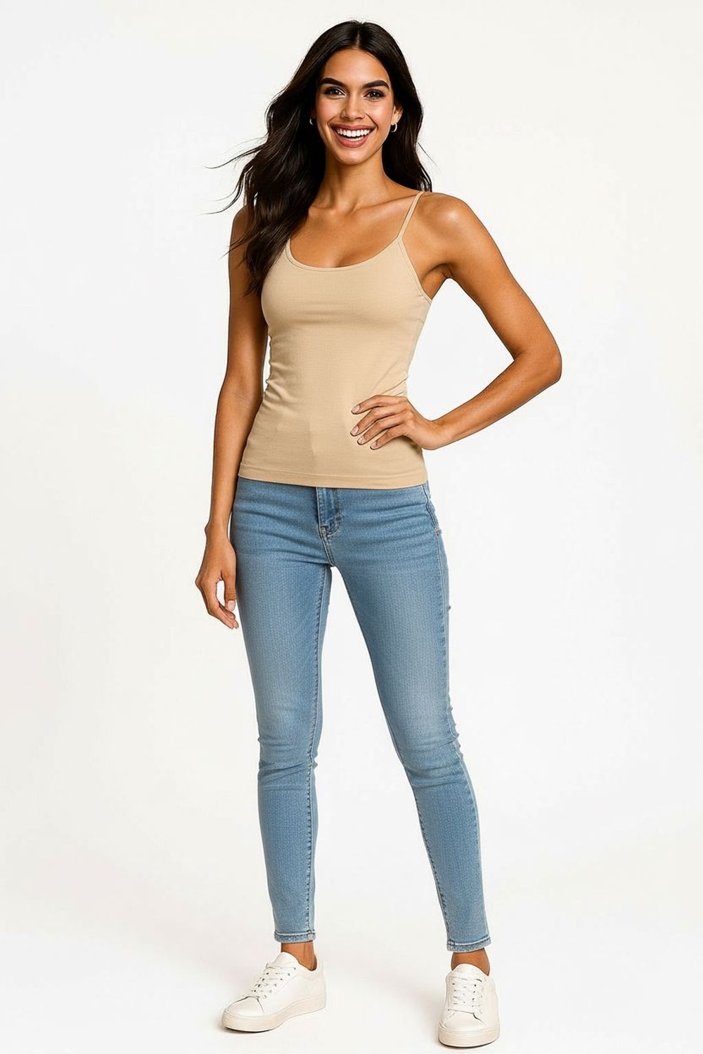 Playera de tirantes con escote redondeado que aporta un ajuste cómodo al busto, silueta recta que permite libertad de movimiento, largo a la cadera que facilita su uso diario, tirantes delgados integrados a la estructura que brindan soporte ligero, confección en tejido suave y flexible que se adapta al cuerpo sin perder forma