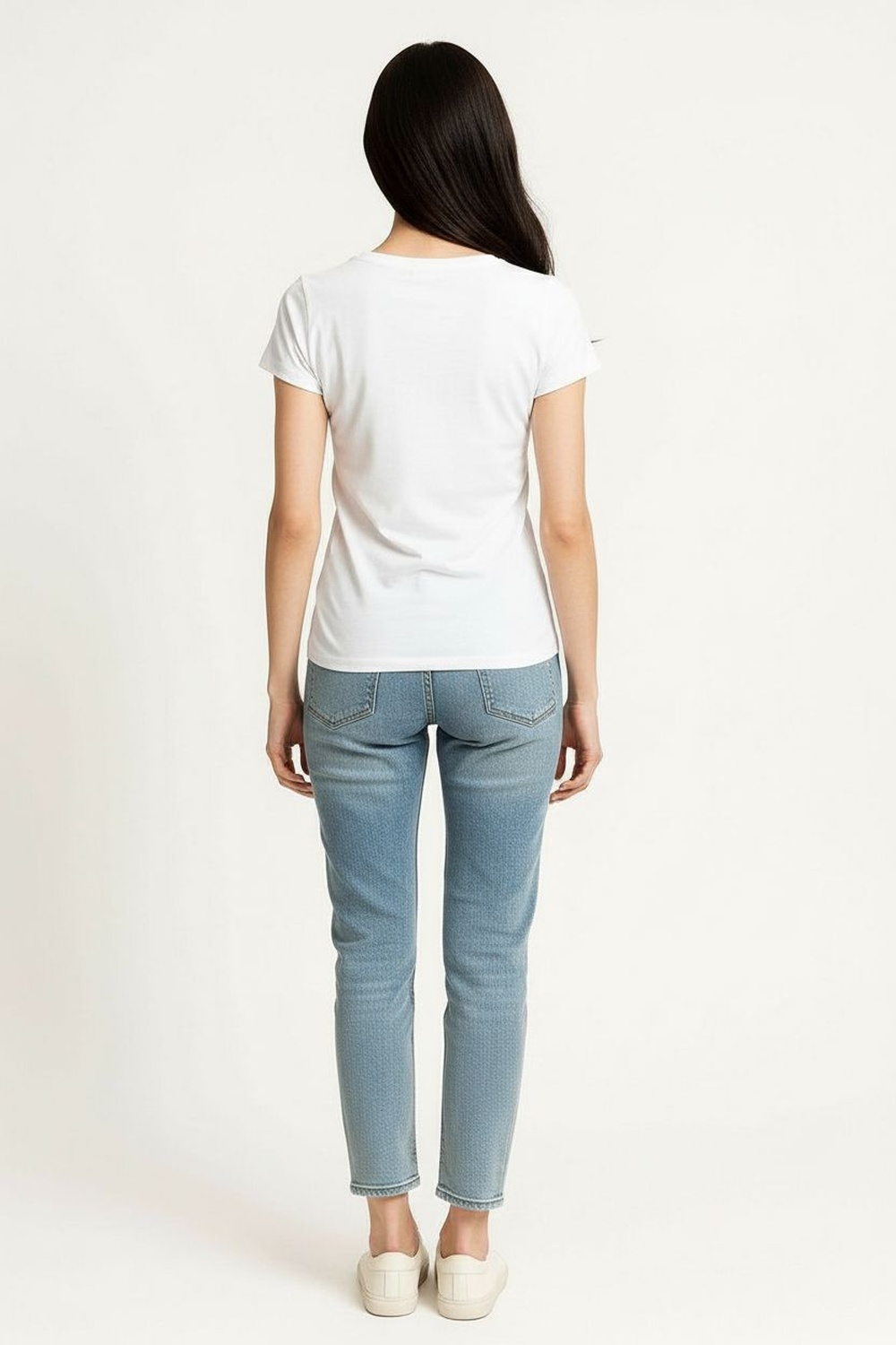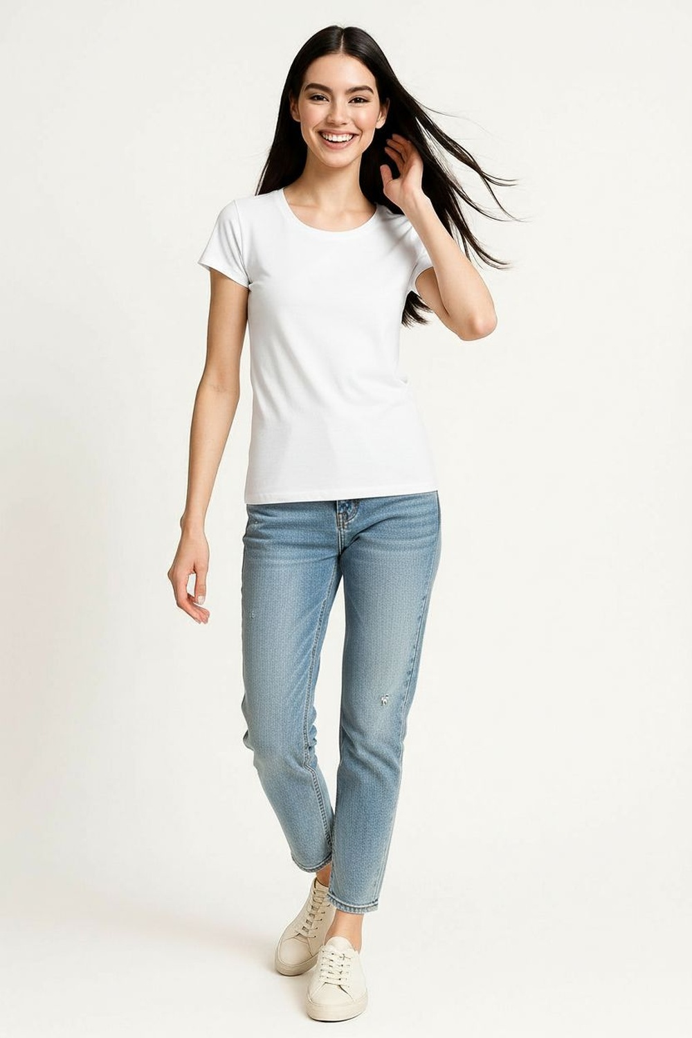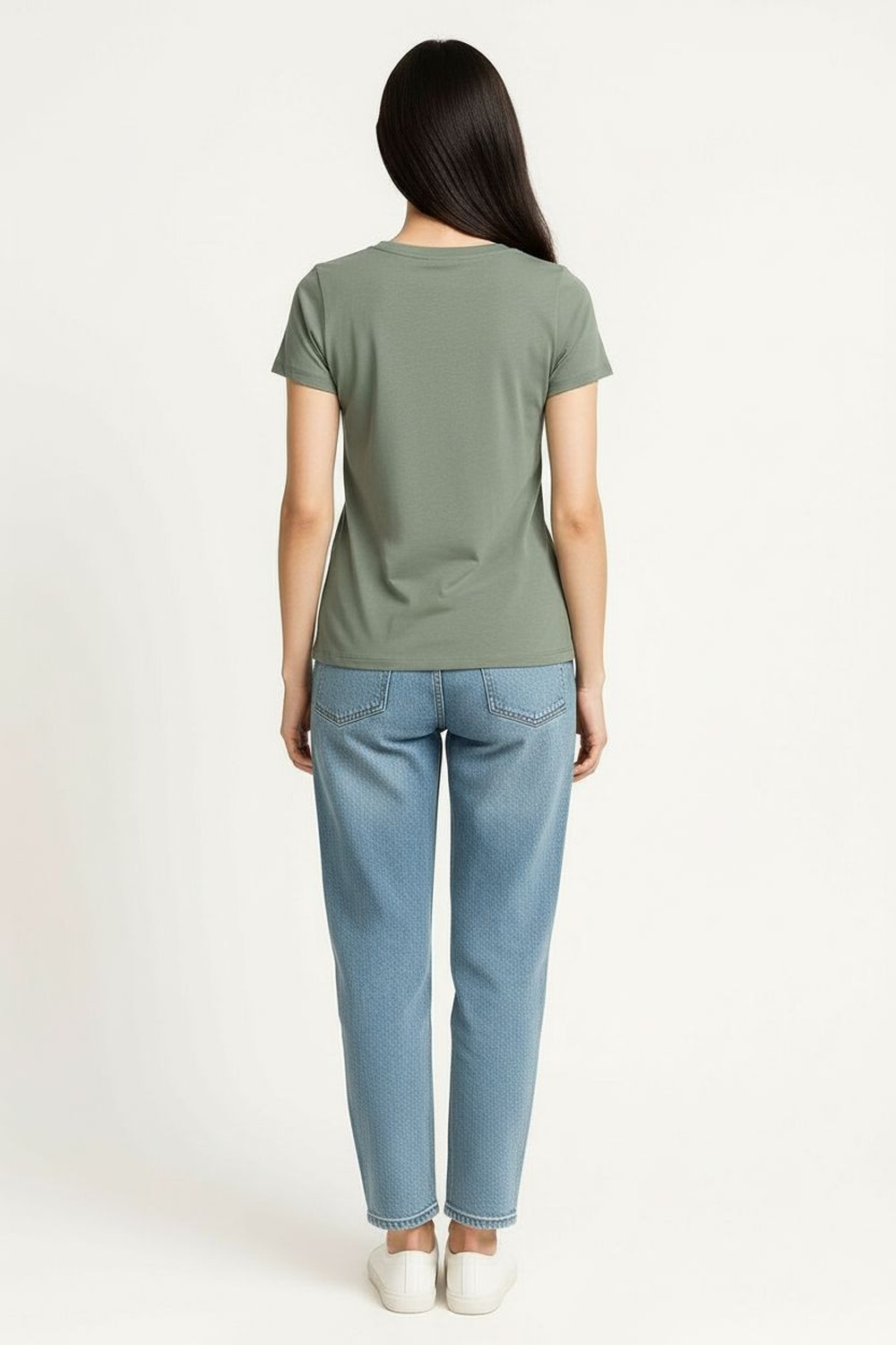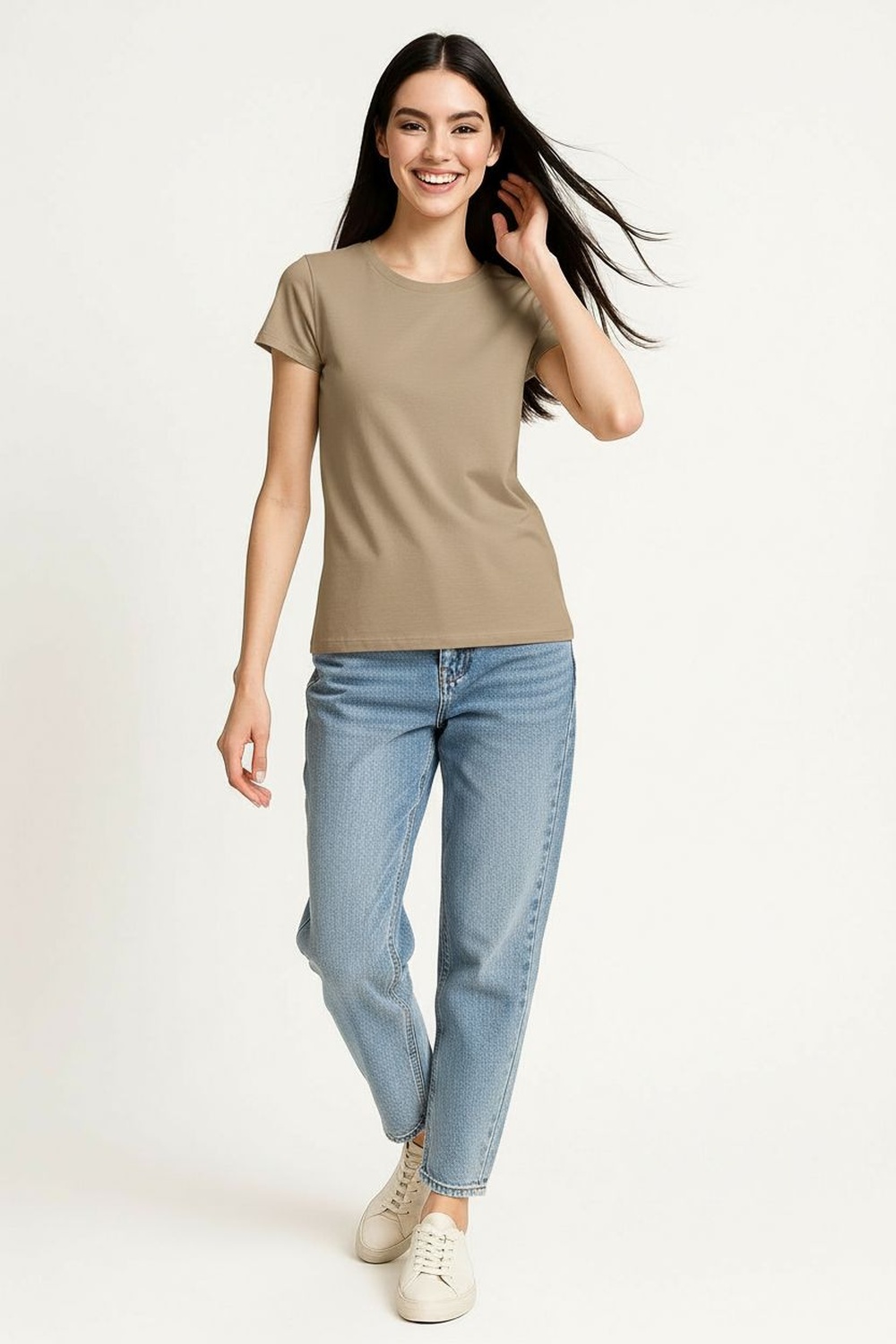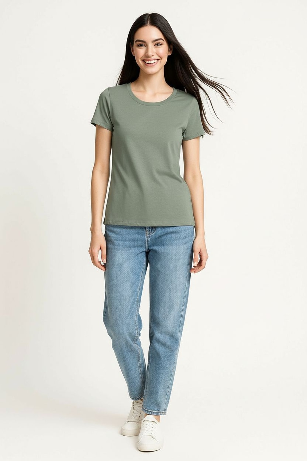 Playera de manga corta con cuello redondo clásico, hombro limpio y estructura recta que brinda ajuste cómodo, largo a la cadera con dobladillo recto, confección en tejido de punto suave y flexible que permite libertad de movimiento