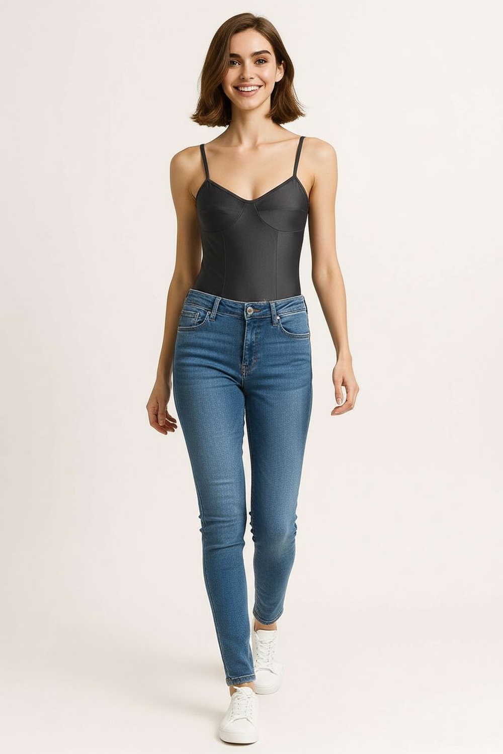 Body tipo colombiana con tirantes delgados y escote en V que estiliza la parte superior, corte ajustado que moldea la silueta, confección en tela elástica que se adapta al cuerpo, diseño de una sola pieza que brinda soporte y seguridad, acabado limpio en orillas que mantiene una apariencia definida