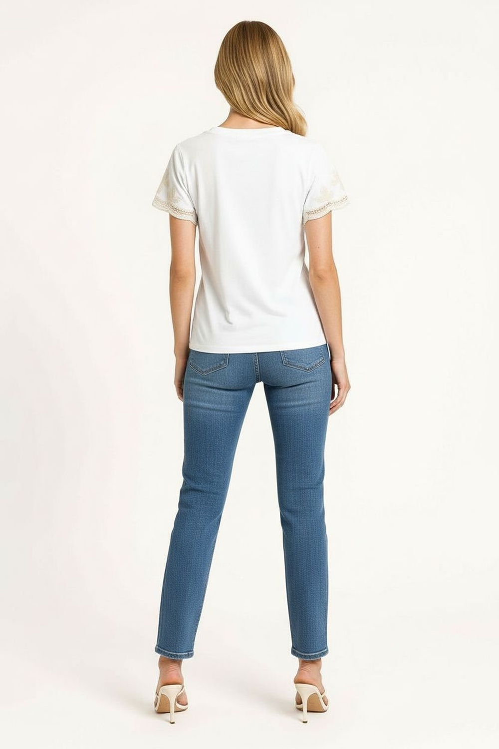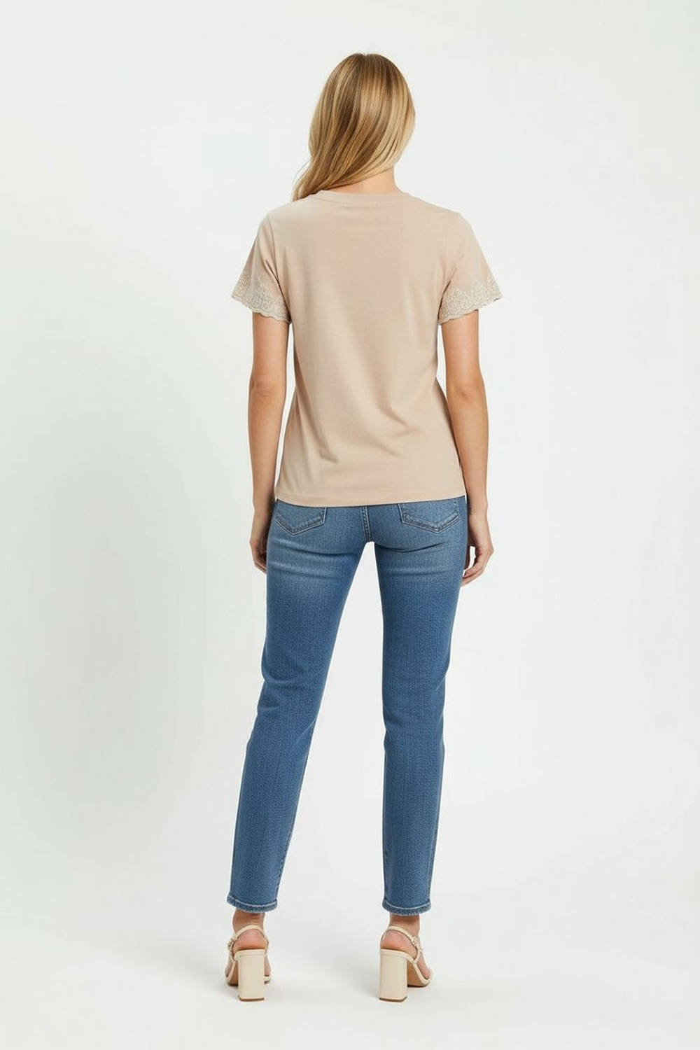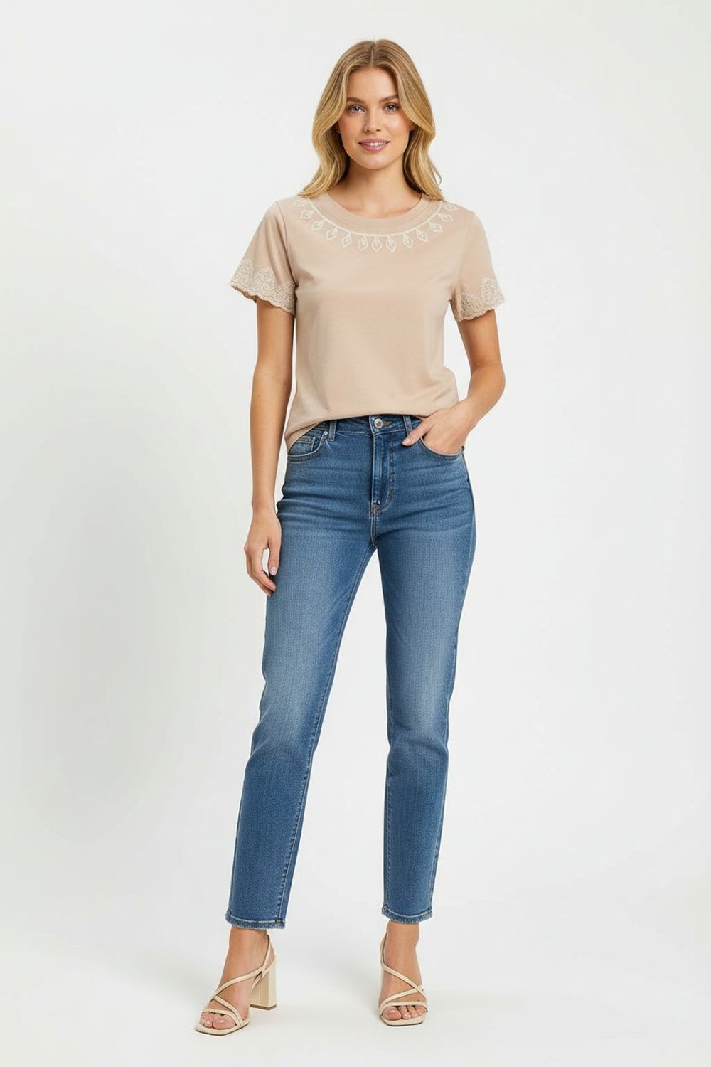 Playera de manga corta con cuello redondo, elaborada en tejido suave de tacto ligero, bordado decorativo en escote y mangas que aporta textura, silueta recta con ajuste cómodo y caída natural