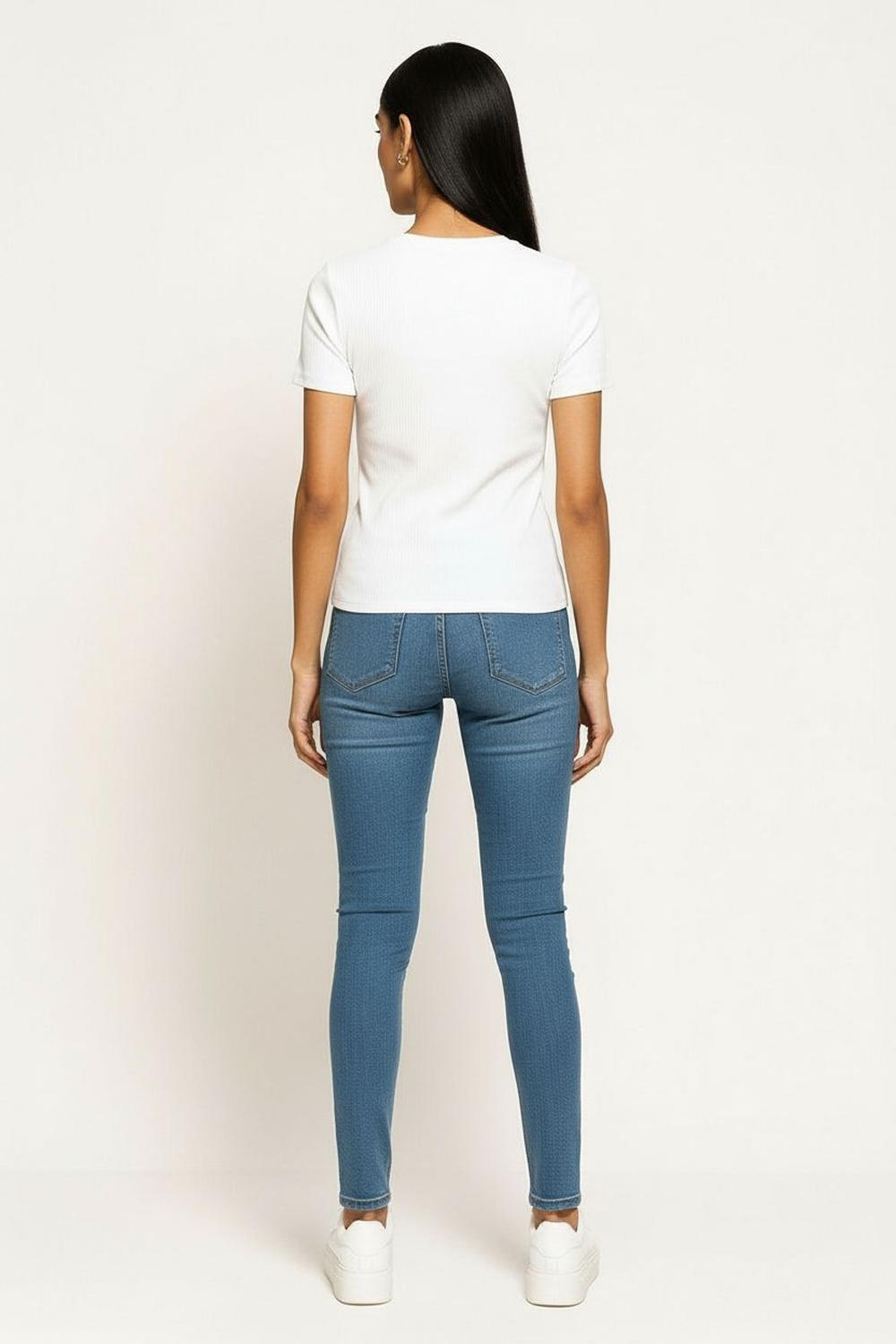 Jeans skinny de tiro medio con diseño clásico de cinco bolsas, mezclilla con elasticidad para ajuste cómodo y favorecedor, ideal para combinaciones básicas y de uso diario, costura contrastante y acabado limpio para look pulido