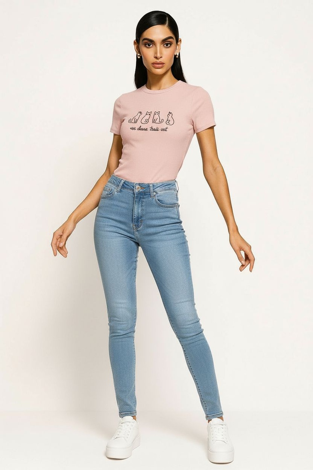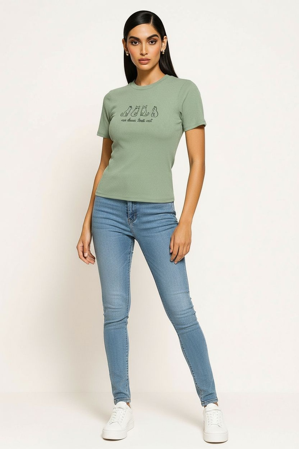 Playera de manga corta con bordado de siluetas de gatos al frente, confeccionada en tejido rib que se ajusta cómodamente al cuerpo, ideal para looks casuales con un toque divertido y original FIT REGULAR