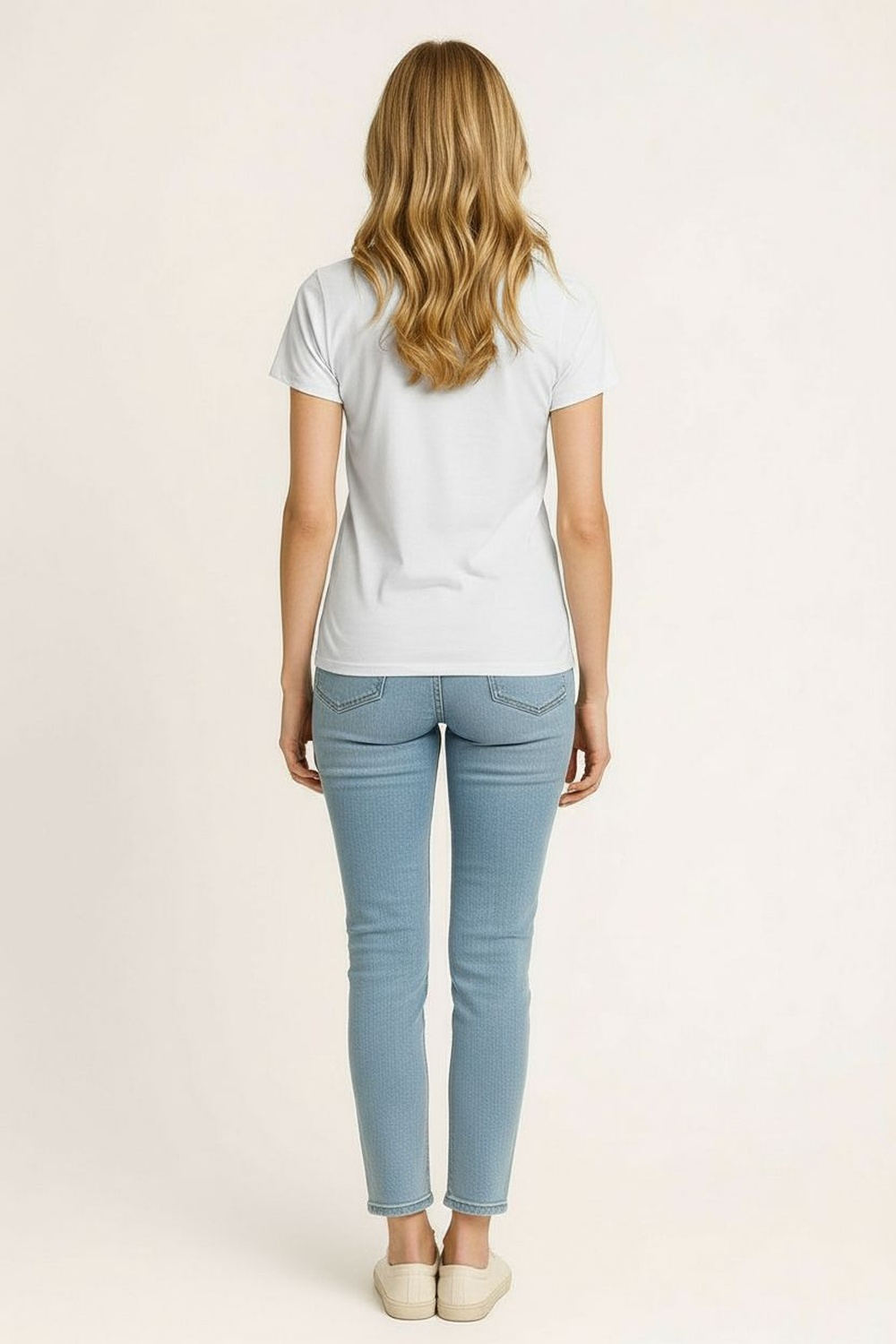 Playera de corte recto con caída natural que brinda comodidad, escote en V con abertura frontal que aporta definición al cuello, manga corta doble con ligero volumen que genera estructura en hombros, largo regular con terminación recta que mantiene proporción, confección en tejido suave que permite movilidad continua