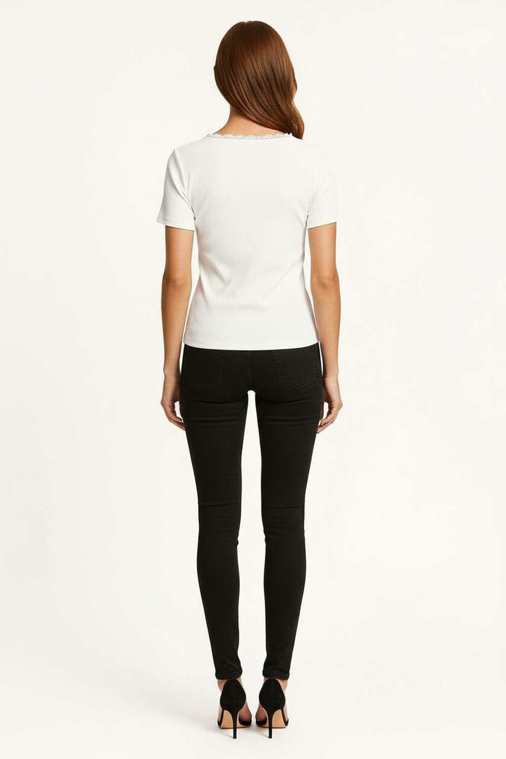 Playera de manga corta con cuello redondo y botones decorativos al frente, silueta recta que se adapta al cuerpo, largo a la cadera que permite movimiento natural, tejido acanalado de tacto suave que aporta confort, acabados delicados en cuello y mangas