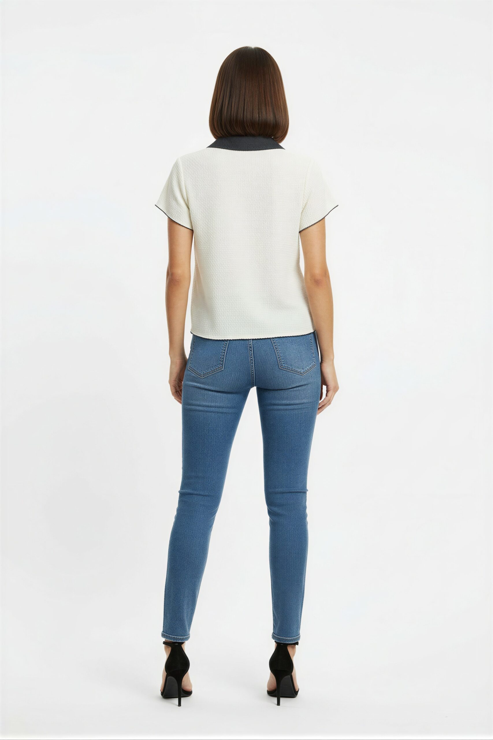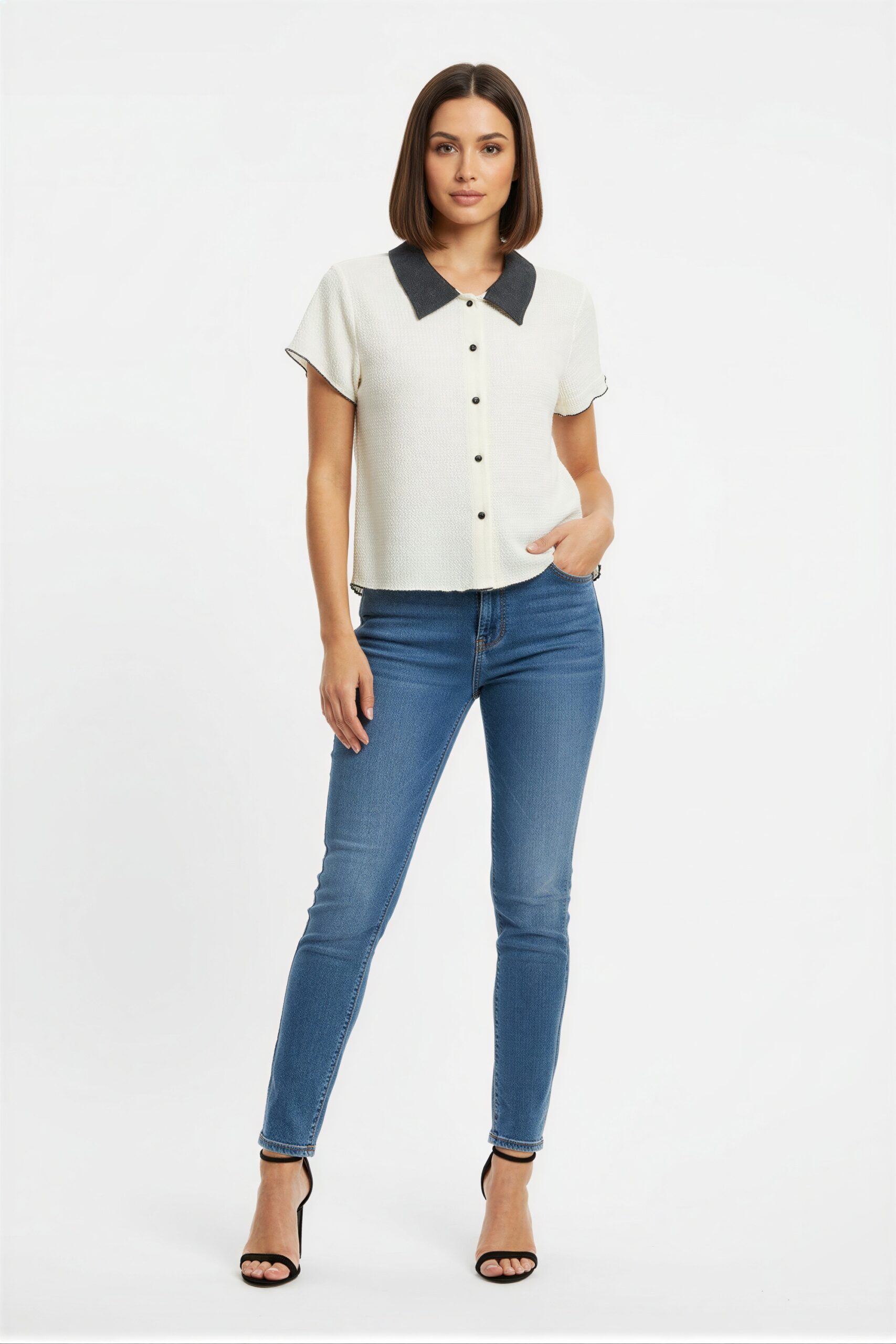 Playera con botones al frente, cuello camisero, manga corta, ajuste recto, terminado inferior con detalle ondulado, tela ligera