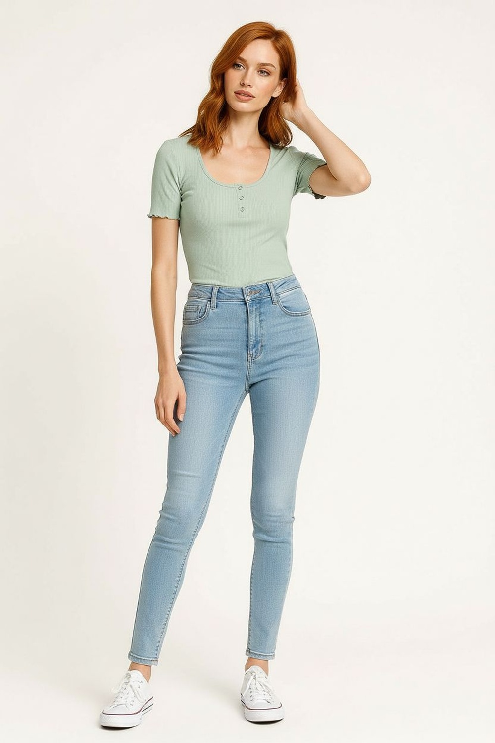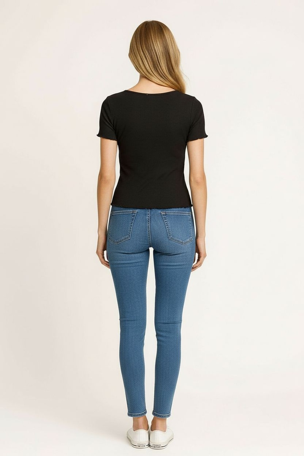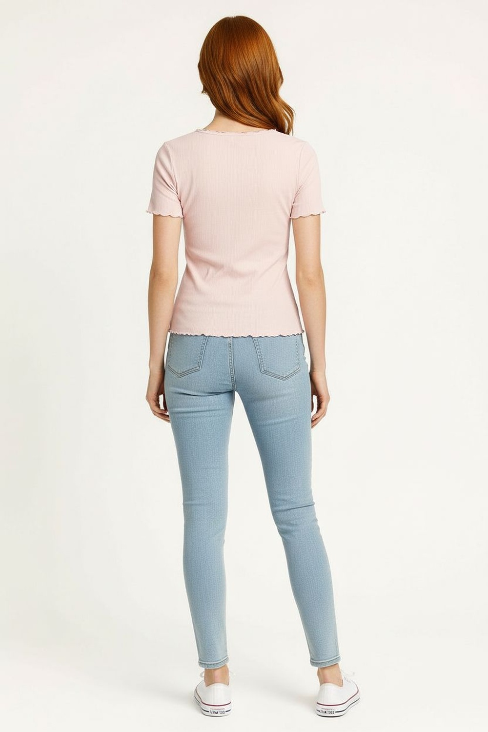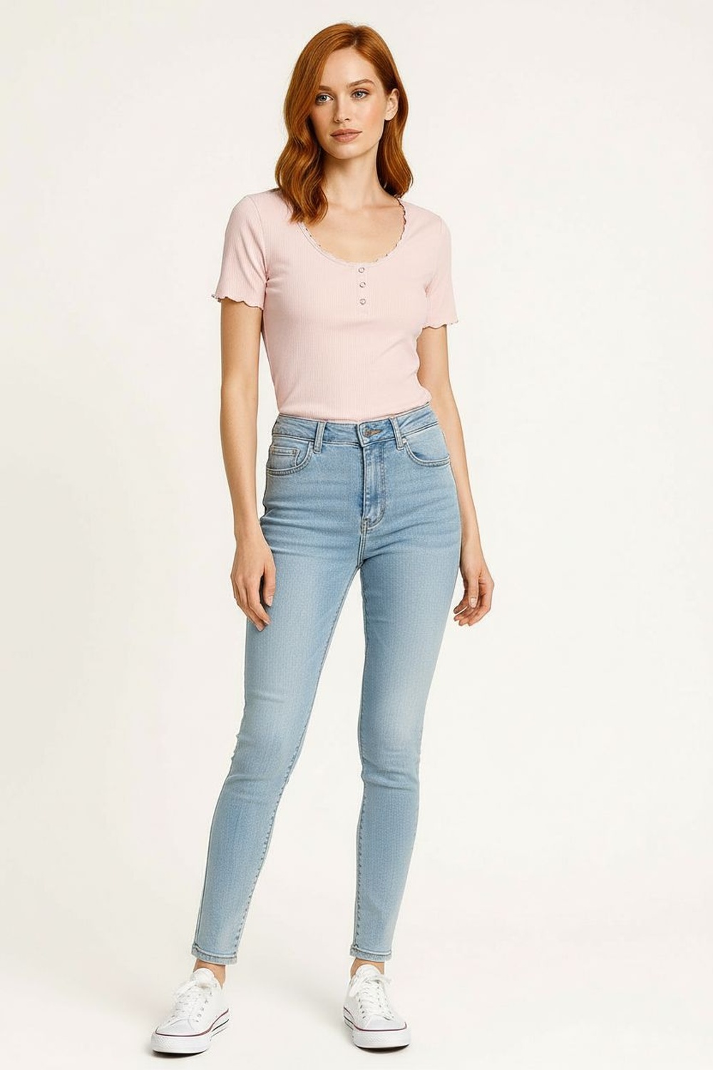 Playera de manga corta con cuello redondeado y abertura frontal funcional con botones, confección en tejido ligero de tacto suave, corte recto que permite ajuste cómodo al torso, terminación inferior ligeramente ondulada que aporta un acabado delicado, estructura versátil para uso diario