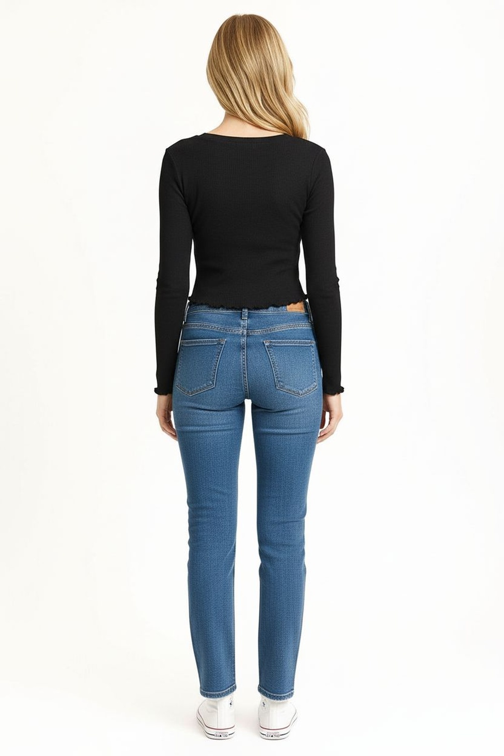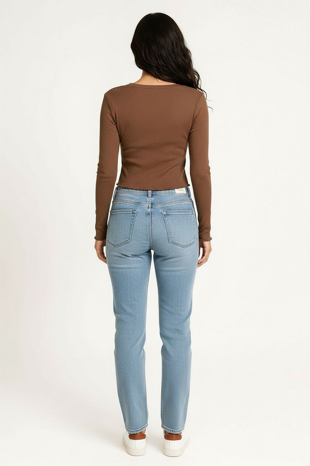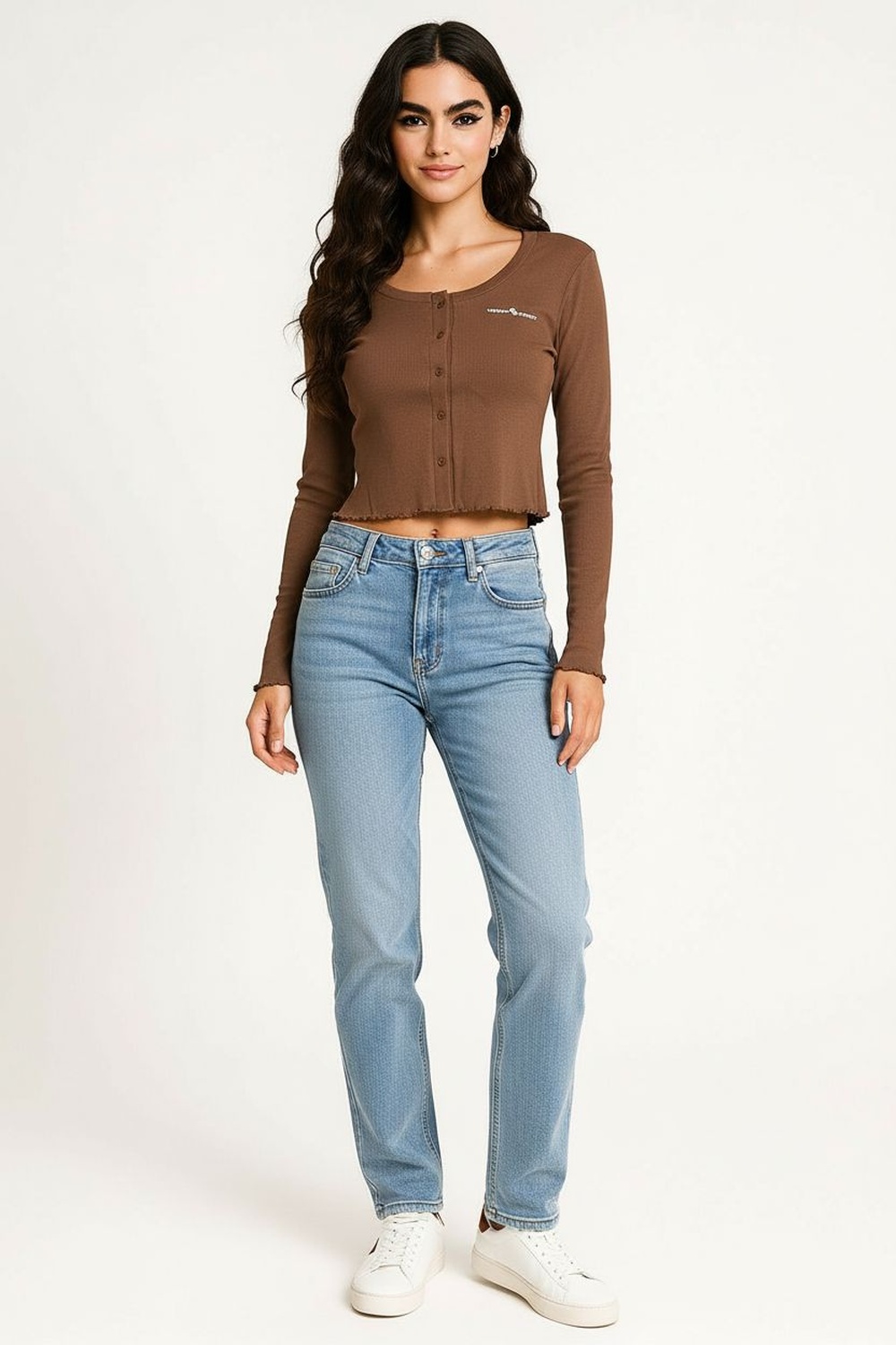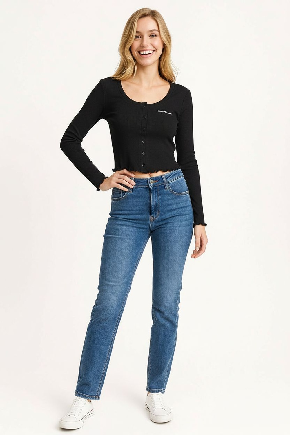 Playera de manga larga con cuello redondo, elaborada en tejido suave de tacto ligero, botonadura frontal funcional, silueta recta con ajuste cómodo, estructura flexible para uso diario prolongado
