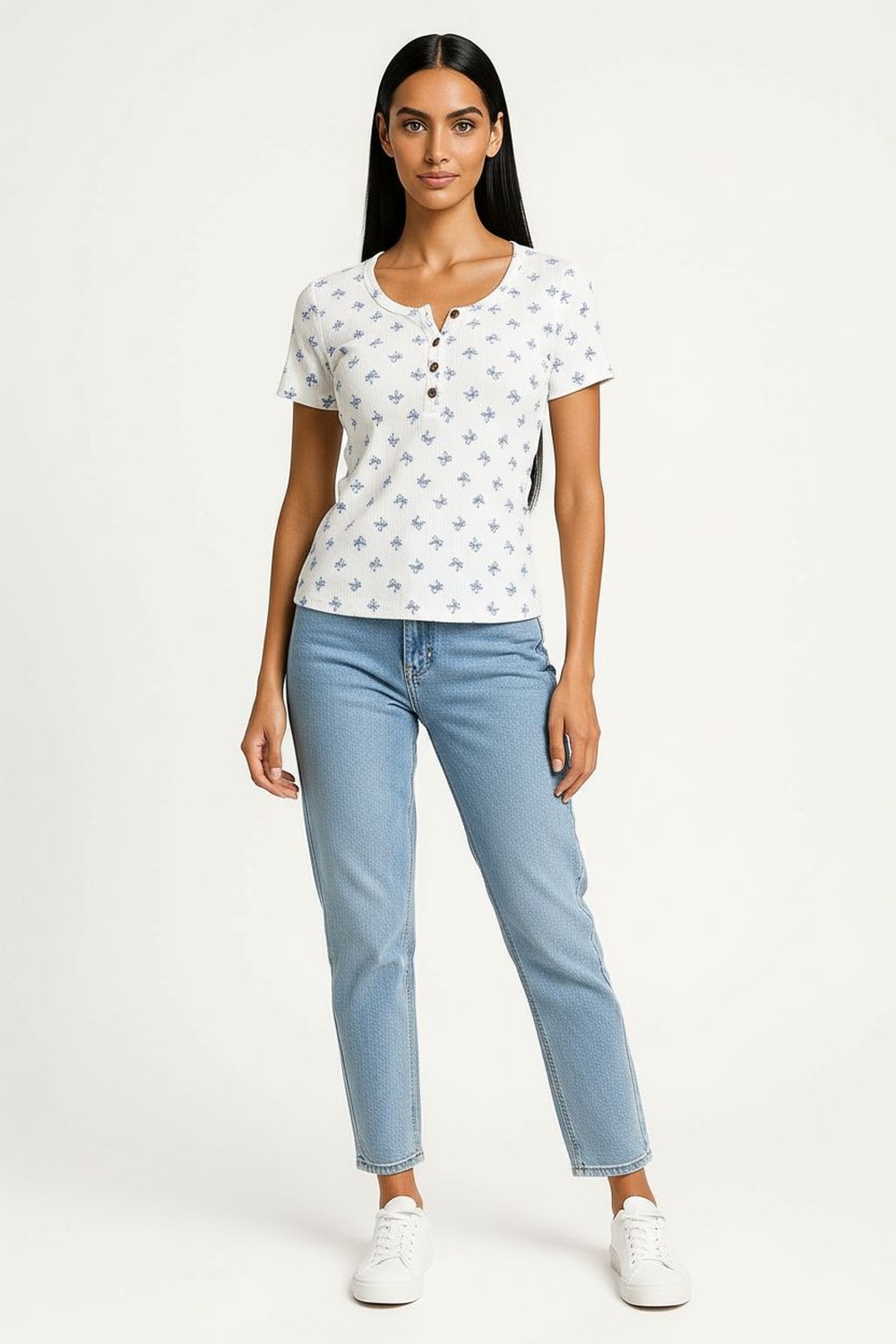 Playera de manga corta con escote en V y botonadura funcional al frente, corte recto que brinda ajuste cómodo al cuerpo, confección en tejido ligero de tacto suave que permite frescura durante el día, terminados limpios en cuello y mangas que aportan estructura y mejor caída en la silueta