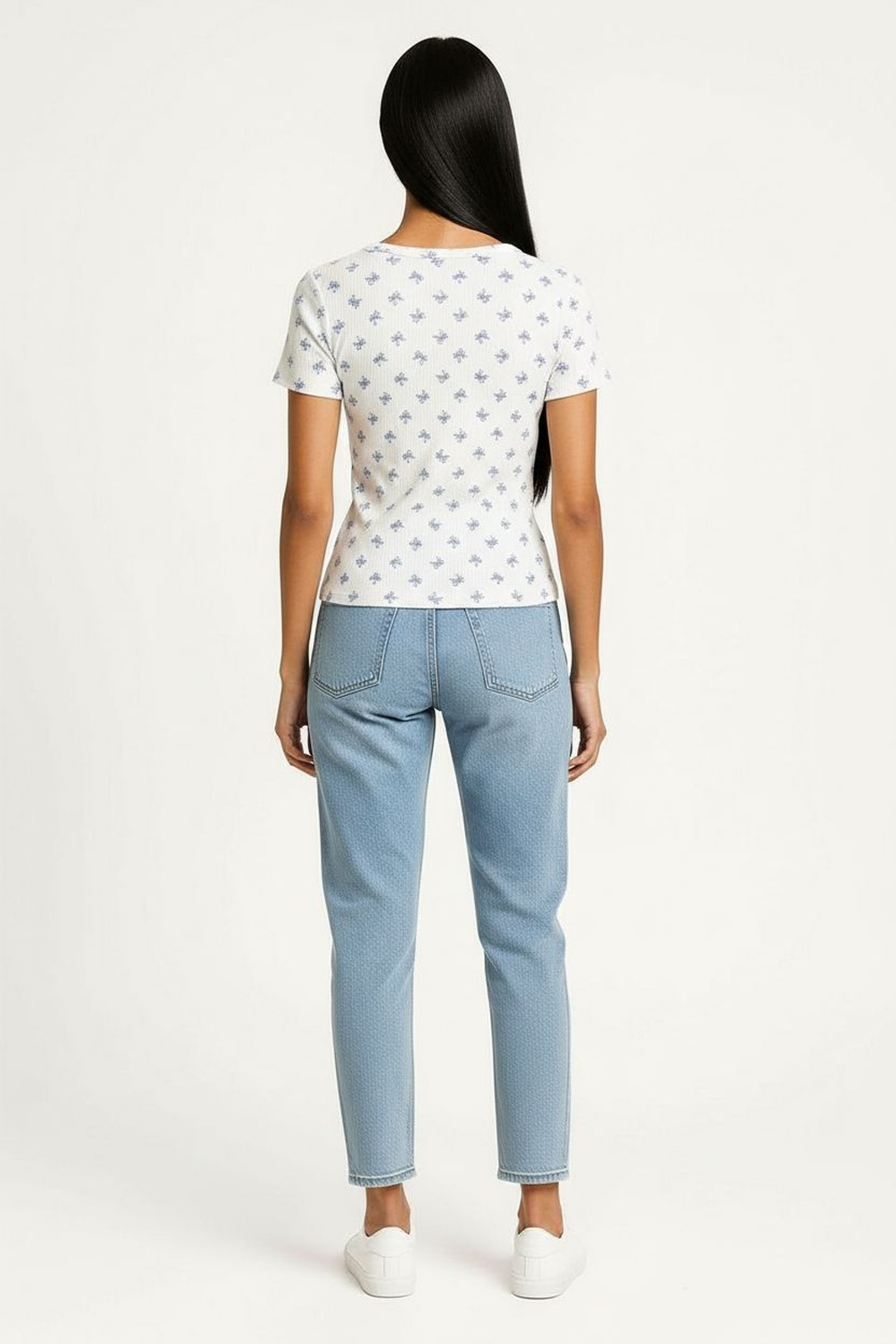 Pantalón de tiro medio con pretina ancha y botonadura frontal visible que define la cintura, corte pitillo ajustado desde cadera hasta tobillo que estiliza la silueta, diseño con bolsas traseras funcionales que aportan estructura, confección en mezclilla stretch que brinda comodidad y libertad de movimiento, acabado limpio en bajo con ajuste ceñido