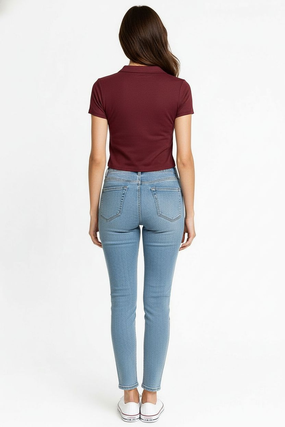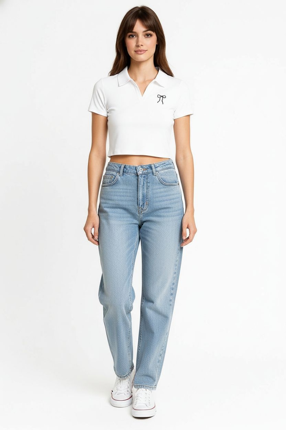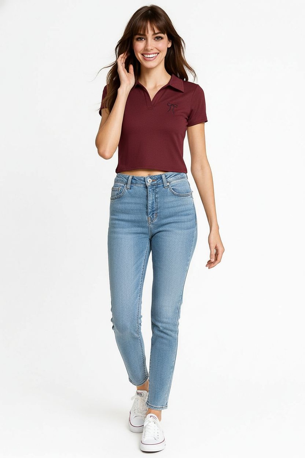 Playera corta con cuello camisero estructurado que aporta un acabado moderno, abertura frontal en forma de V que estiliza el cuello, bordado decorativo que agrega detalle distintivo, mangas cortas con caída natural, confección en tejido suave que brinda comodidad durante todo el día