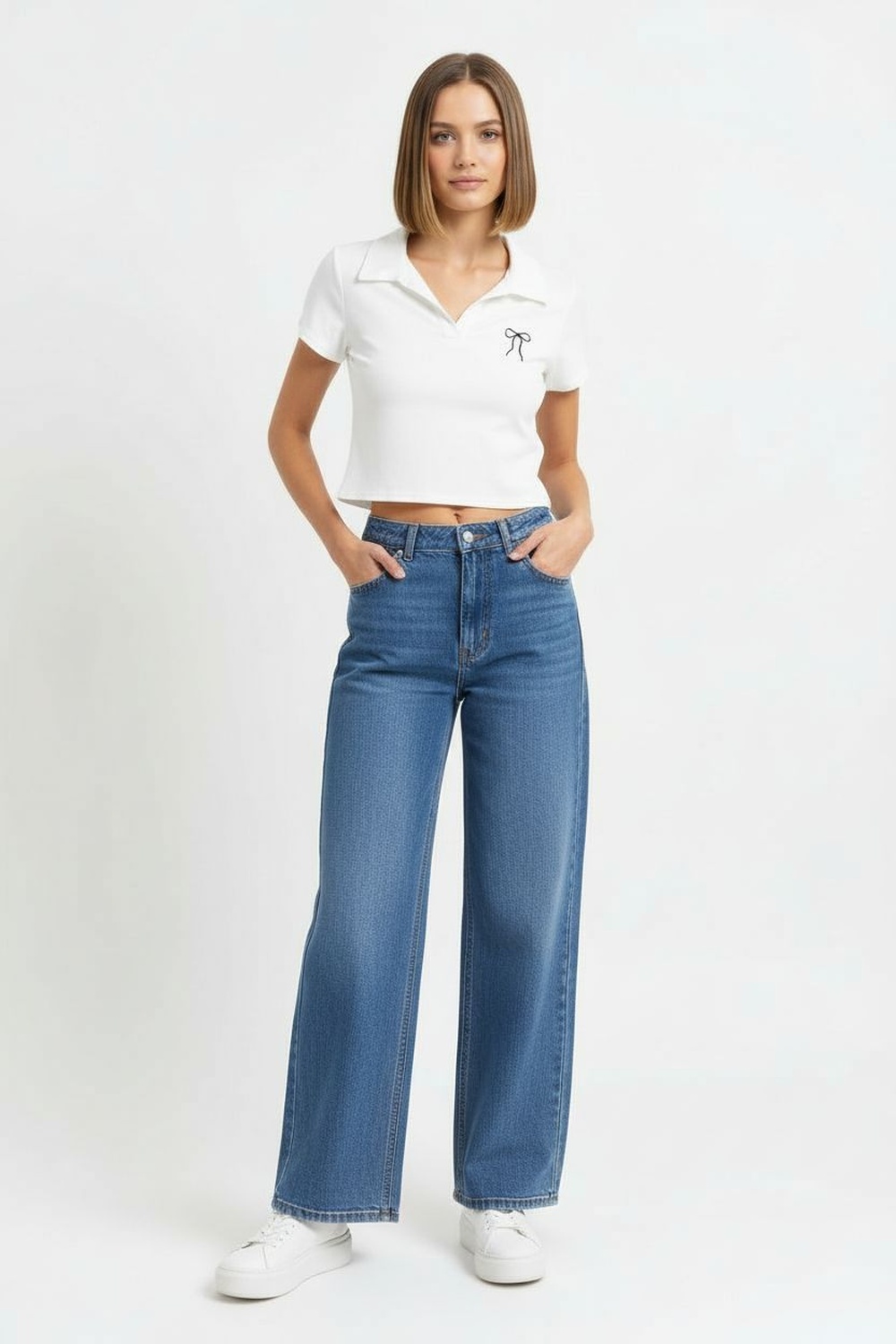 Playera de manga corta con cuello tipo polo, escote en V, ajuste al cuerpo, detalle bordado al frente, terminado recto