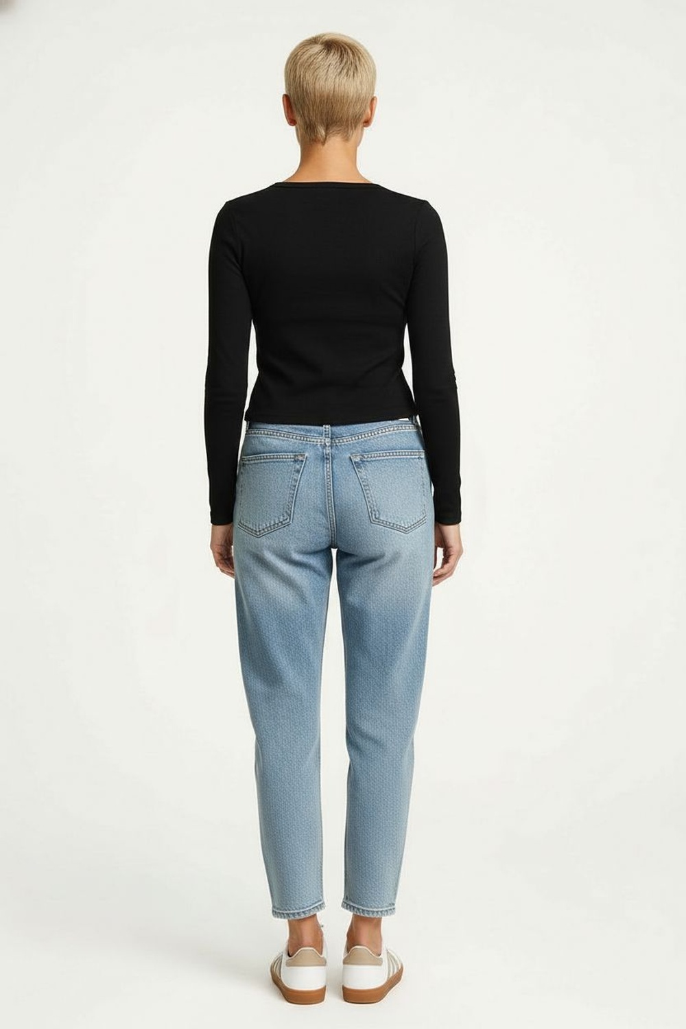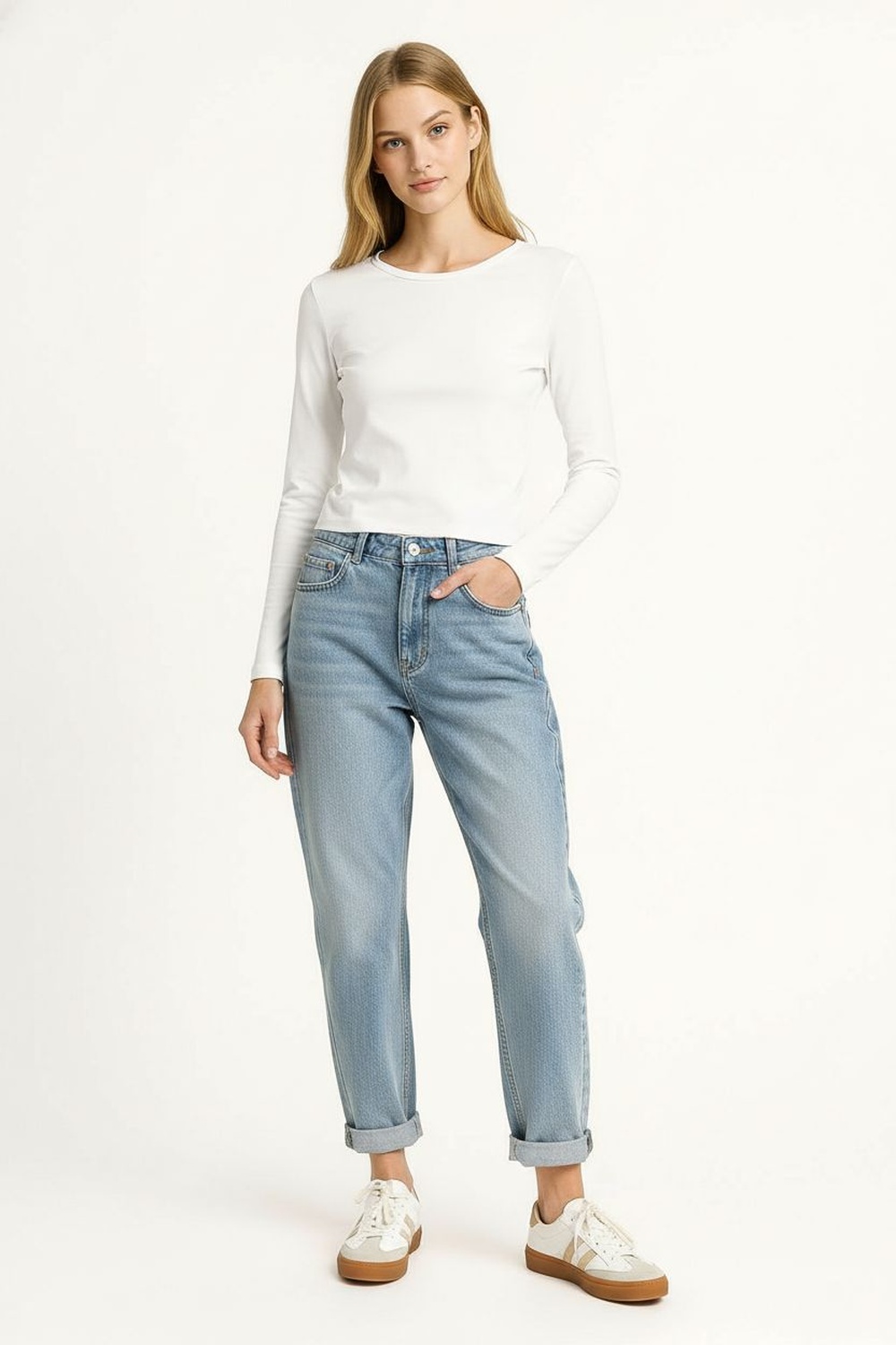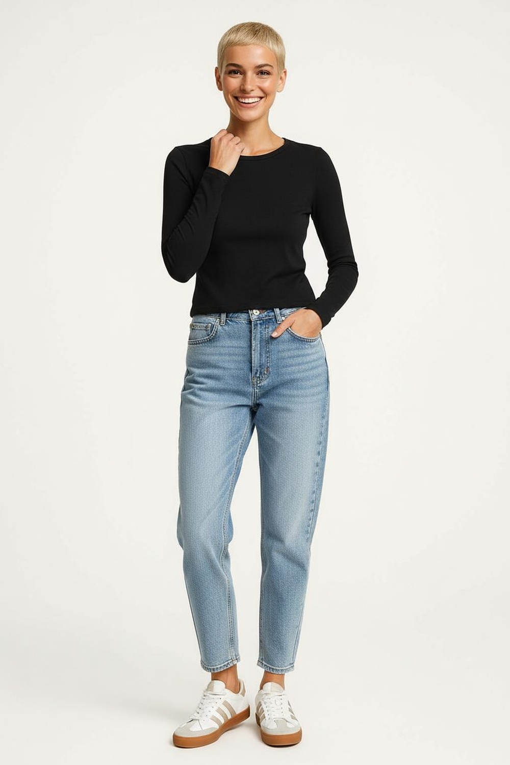 Playera de manga larga con cuello redondo y corte corto, confeccionada en tejido tipo chifón elástico de textura suave y ligera, ajuste al cuerpo que define la silueta, terminaciones limpias en cuello y puños que aseguran un acabado prolijo