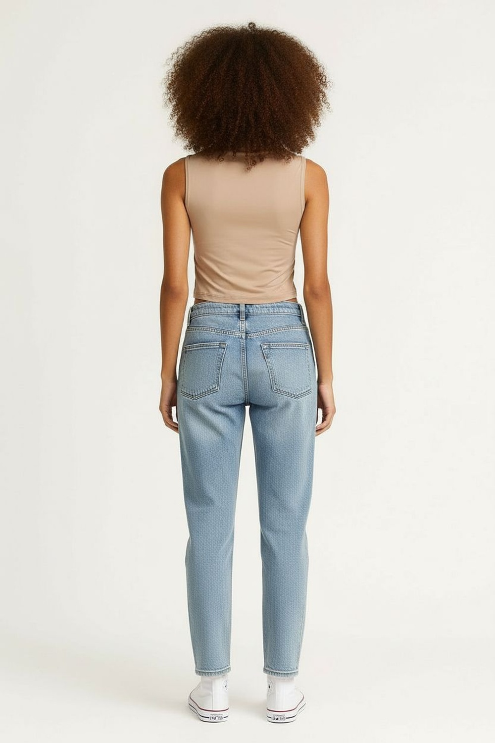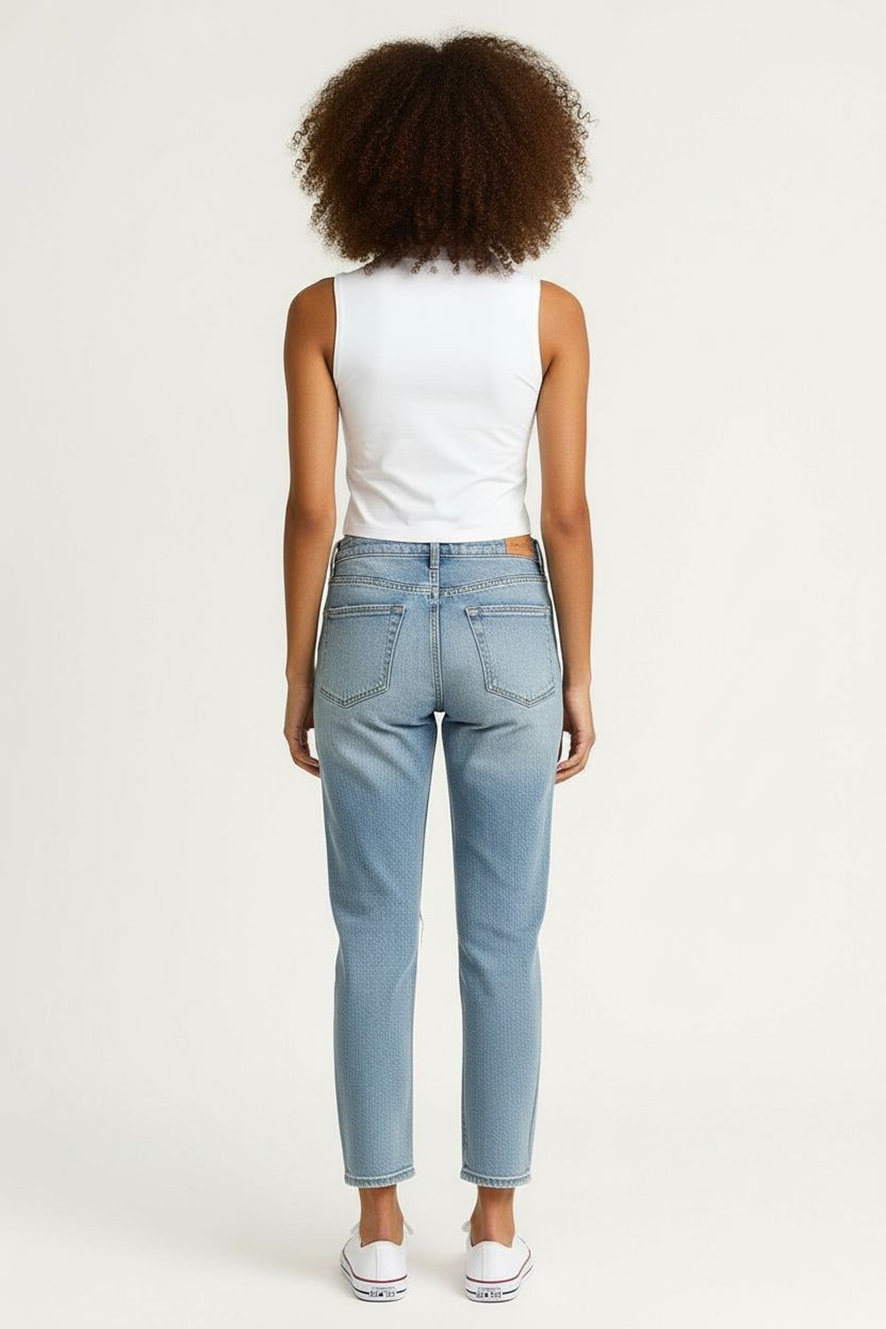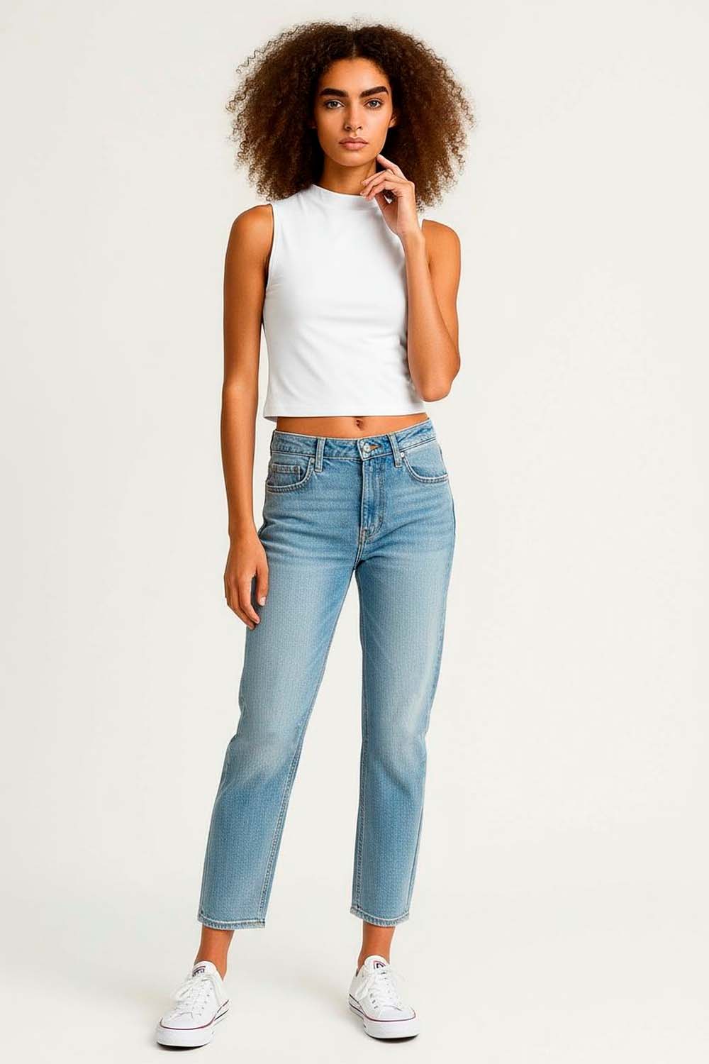 Jeans de tiro alto con doble botón frontal que asegura el ajuste, corte entallado que define la silueta, pretina estructurada con soporte firme, largo completo que alarga visualmente la pierna, confección elástica que permite movilidad constante