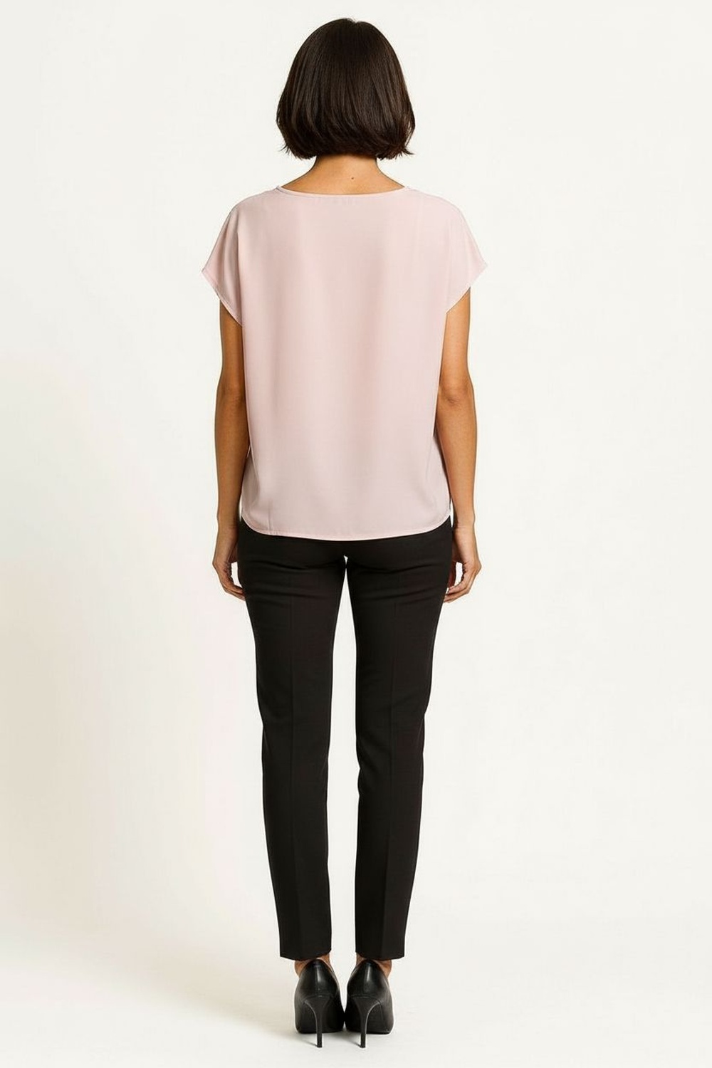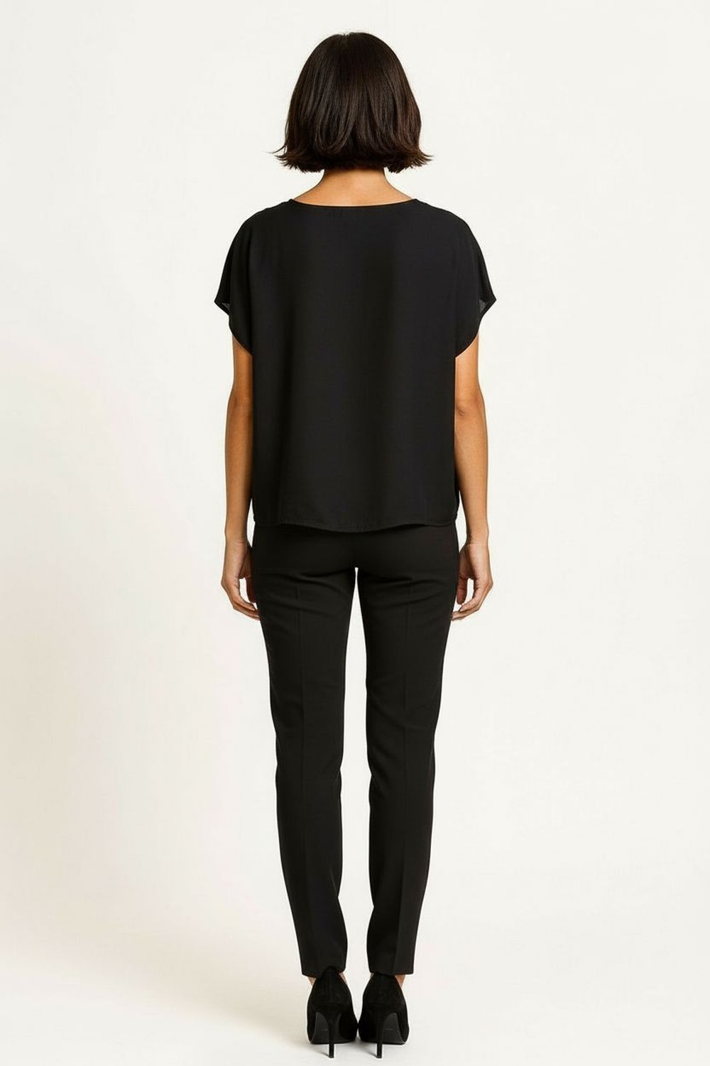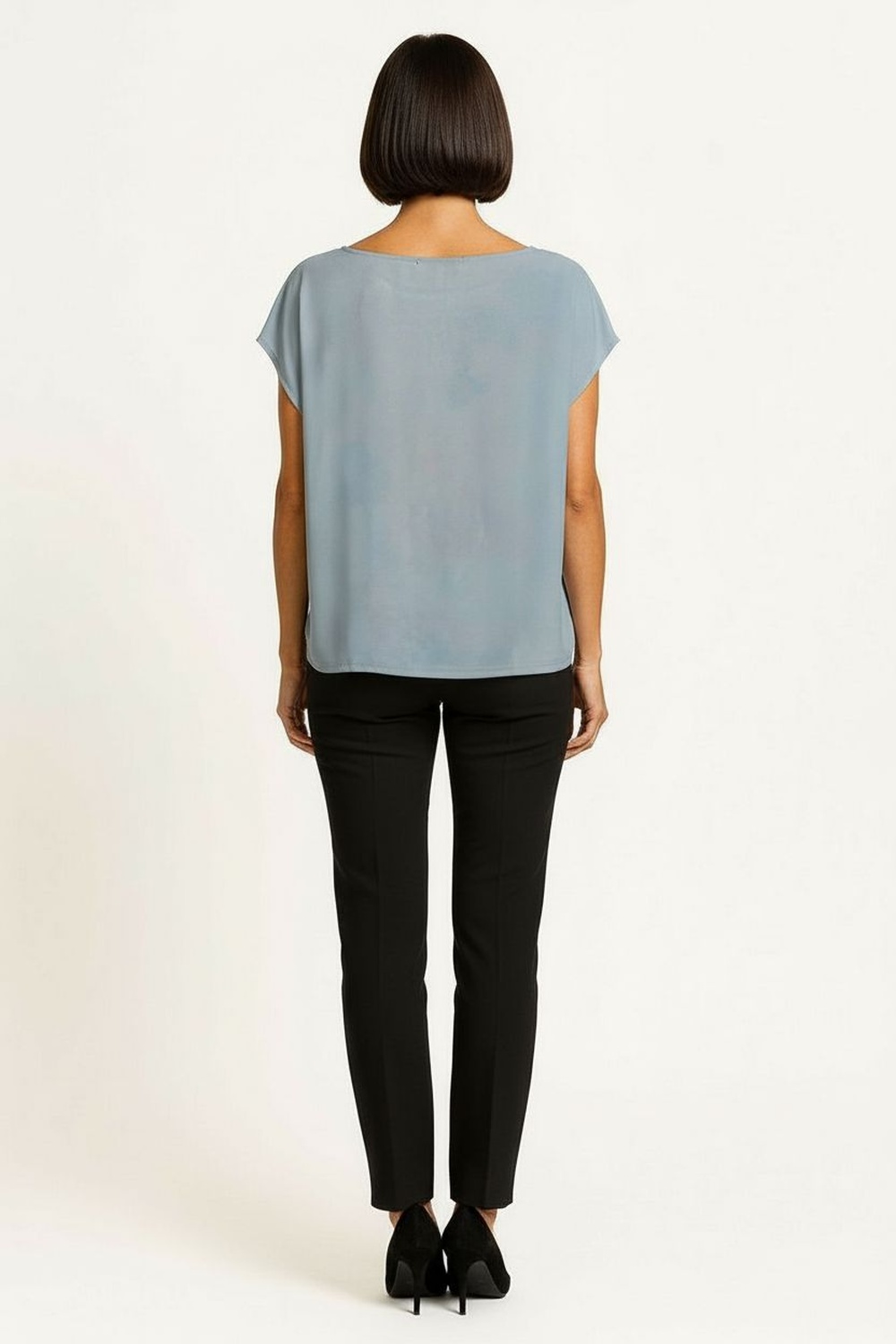 Playera de manga corta con cuello redondo amplio, corte recto que aporta soltura al cuerpo, confección en tejido ligero con caída fluida, diseño combinado en paneles que aporta contraste visual, largo regular con terminaciones limpias