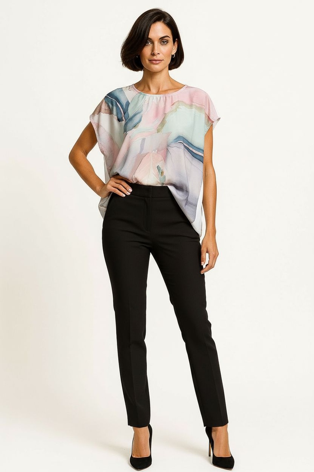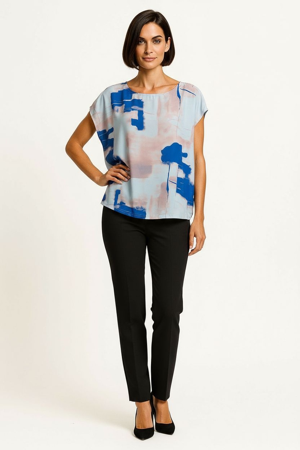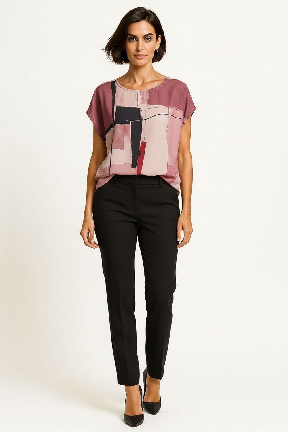 Playera de manga corta con cuello redondo amplio, corte recto que aporta soltura al cuerpo, confección en tejido ligero con caída fluida, diseño combinado en paneles que aporta contraste visual, largo regular con terminaciones limpias