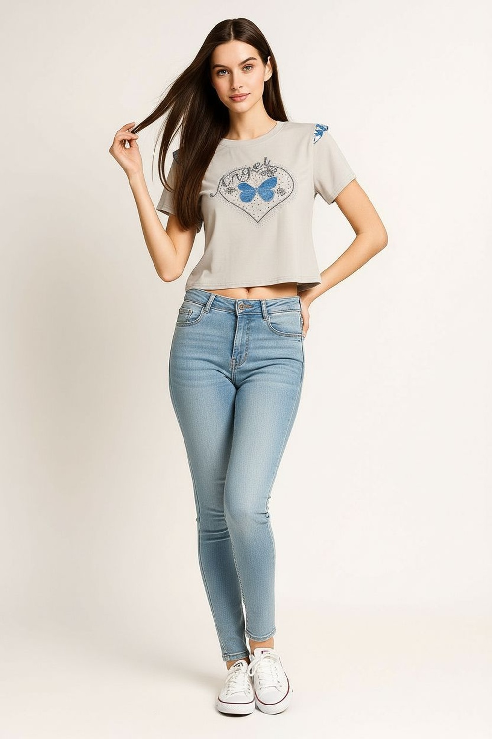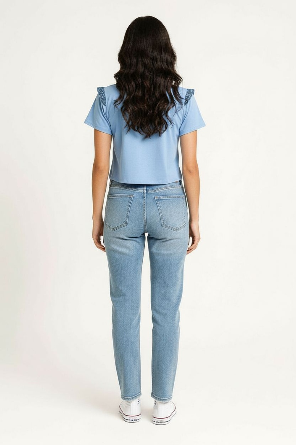 Playera de manga corta con cuello redondo, elaborada en tejido suave de tacto ligero, bordado decorativo en escote y mangas que aporta textura, silueta recta con ajuste cómodo y caída natural