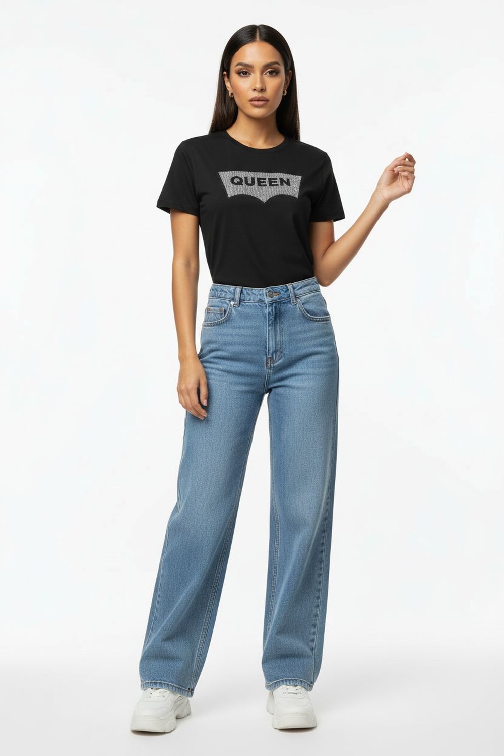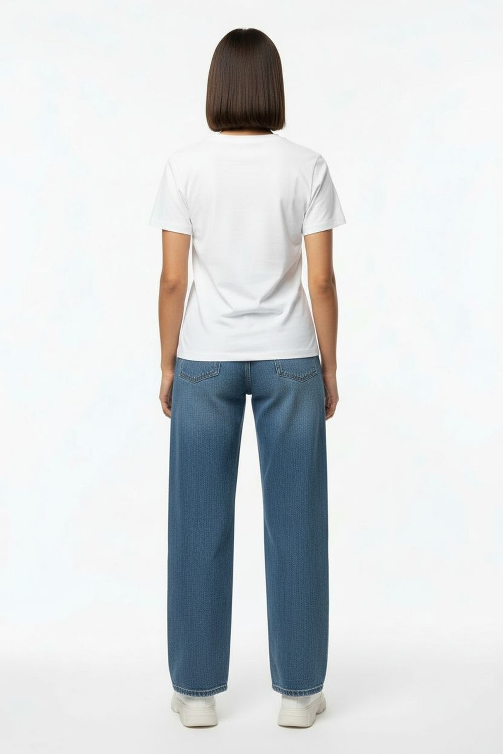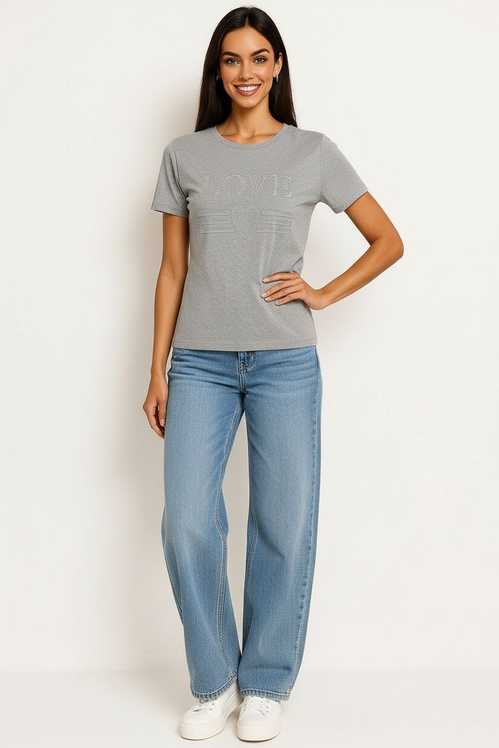 Playera cuello redondo, manga corta con olanes, corte recto, detalle gráfico al frente, textura ligera, ajuste cómodo