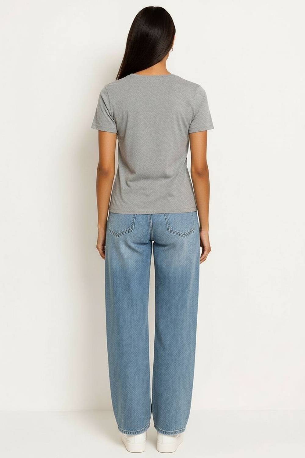 Playera de manga corta con cuello redondo, corte recto, aplicación frontal con textura, tela suave al tacto, acabado ligero y cómodo