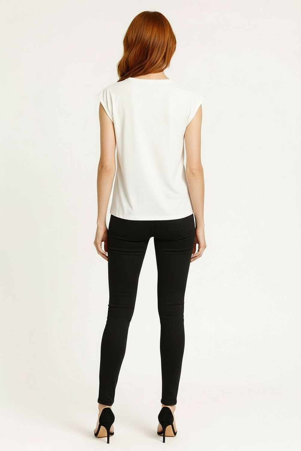 Blusa con detalle metálico en escote, manga corta con ligero volumen, textura ligera, estructura fluida, acabado uniforme