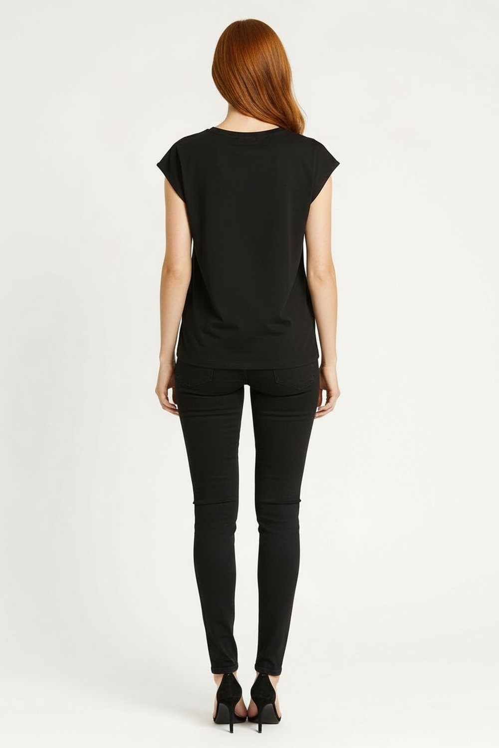 Playera de cuello redondo, manga corta, corte recto, diseño con aplicación frontal decorativa, acabado suave y estructura ligera para uso diario