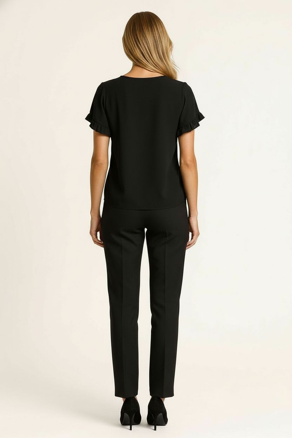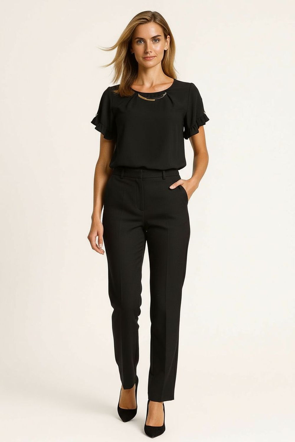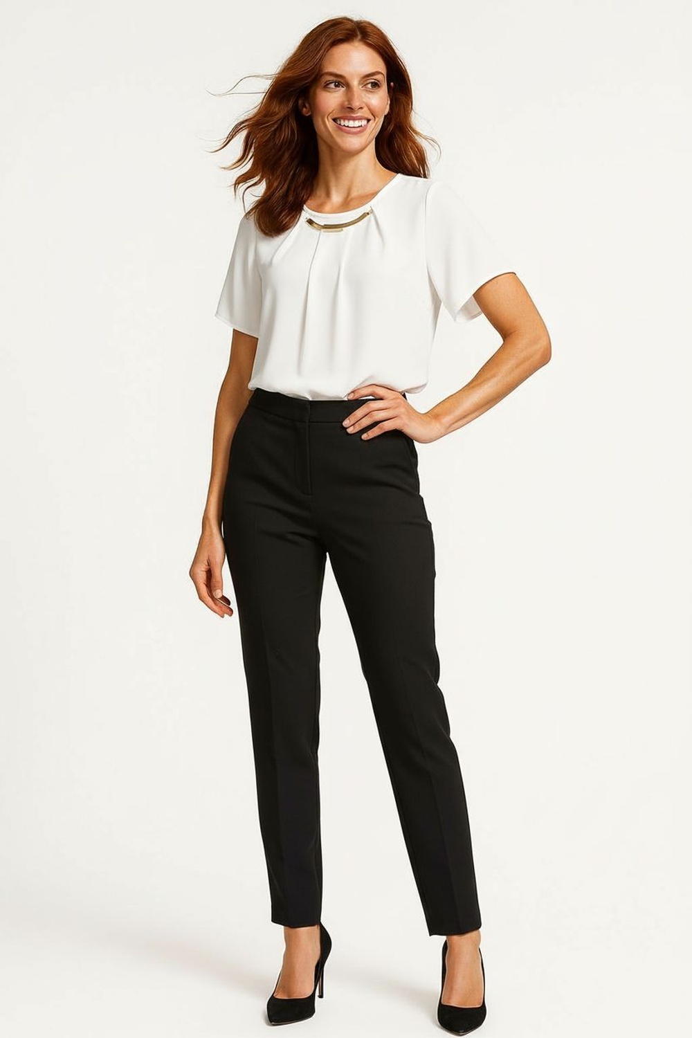 Playera de corte relajado con escote en V favorecedor, mangas cortas con detalle de botonadura en dobladillo, incluye collar decorativo desmontable que aporta un toque moderno, confección ligera en tejido suave y elástico ideal para temporada de calor y ocasiones casuales