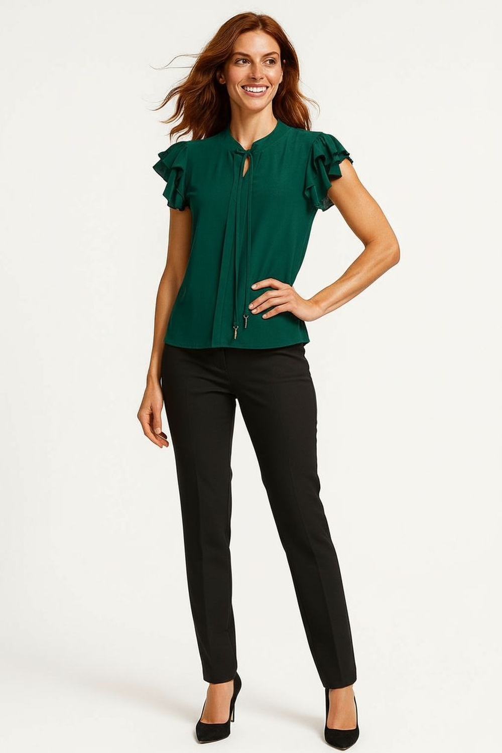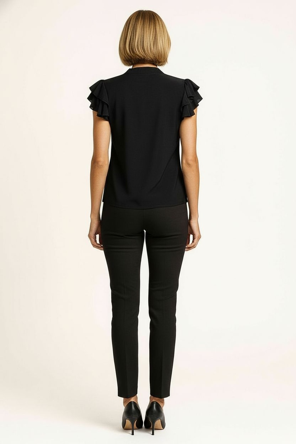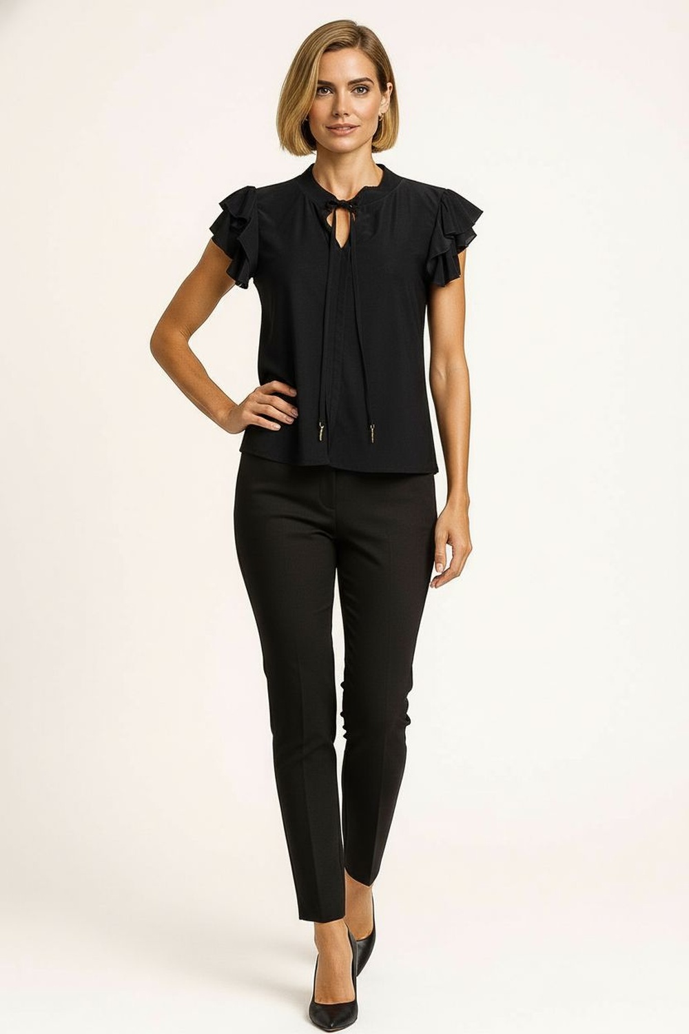 Playera con cuello redondo y jareta ajustable que permite personalizar el escote, manga corta con doble vuelo que aporta dinamismo, confección en tela ligera con caída natural, detalle de aplicación metálica al final de las cintas que añade un acabado sofisticado