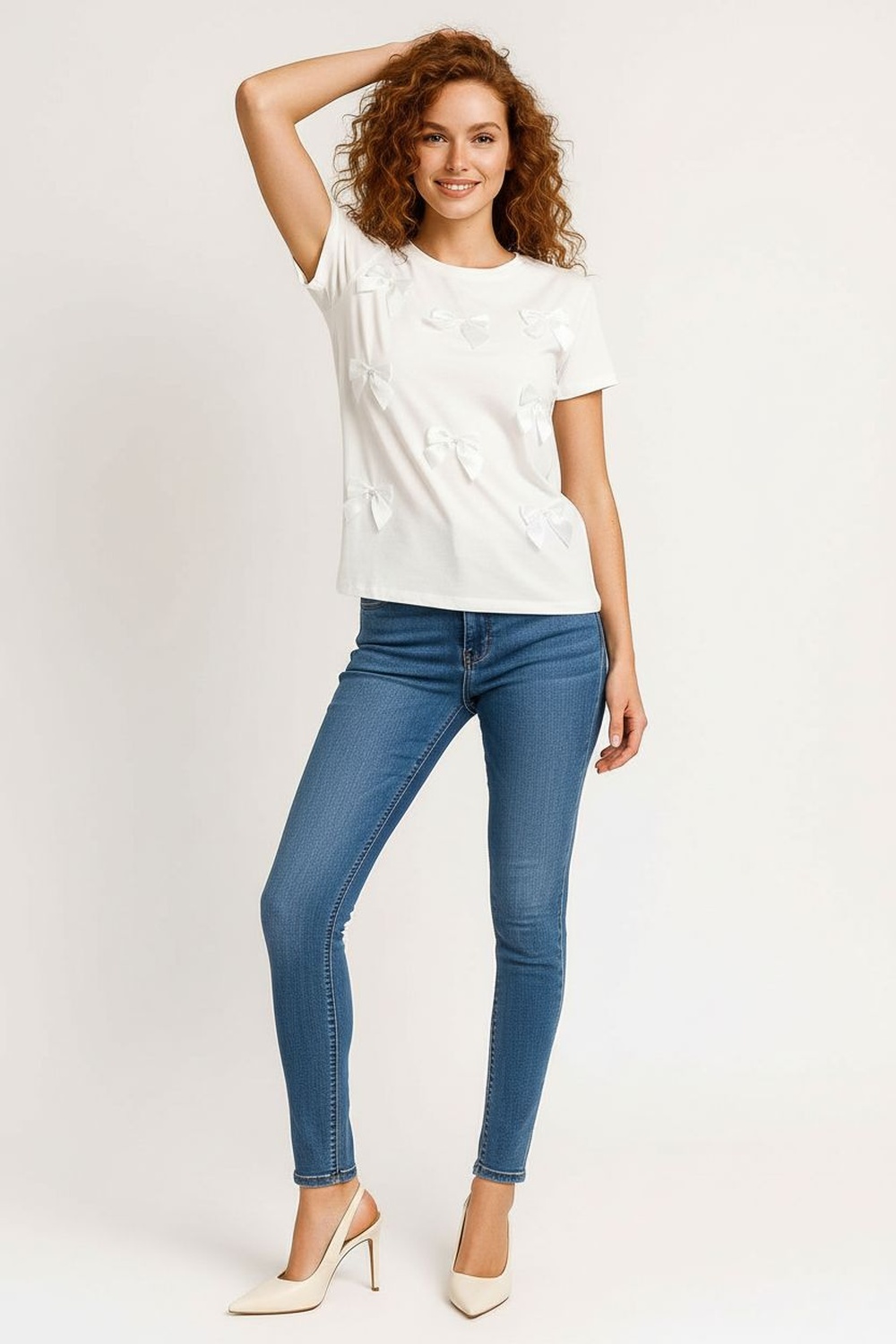 Playera de manga corta con cuello redondo y corte recto, confección en tejido suave de peso ligero que brinda comodidad, aplicaciones de listones colocados de forma uniforme que aportan detalle visual, largo clásico que cubre la cadera, acabados limpios en cuello y mangas que mantienen la forma de la prenda