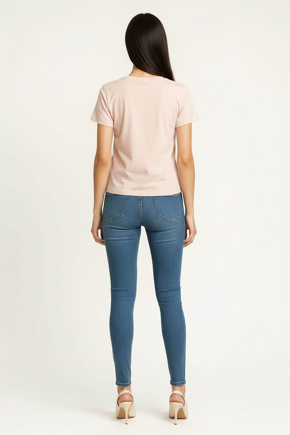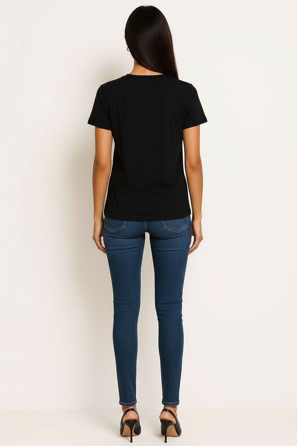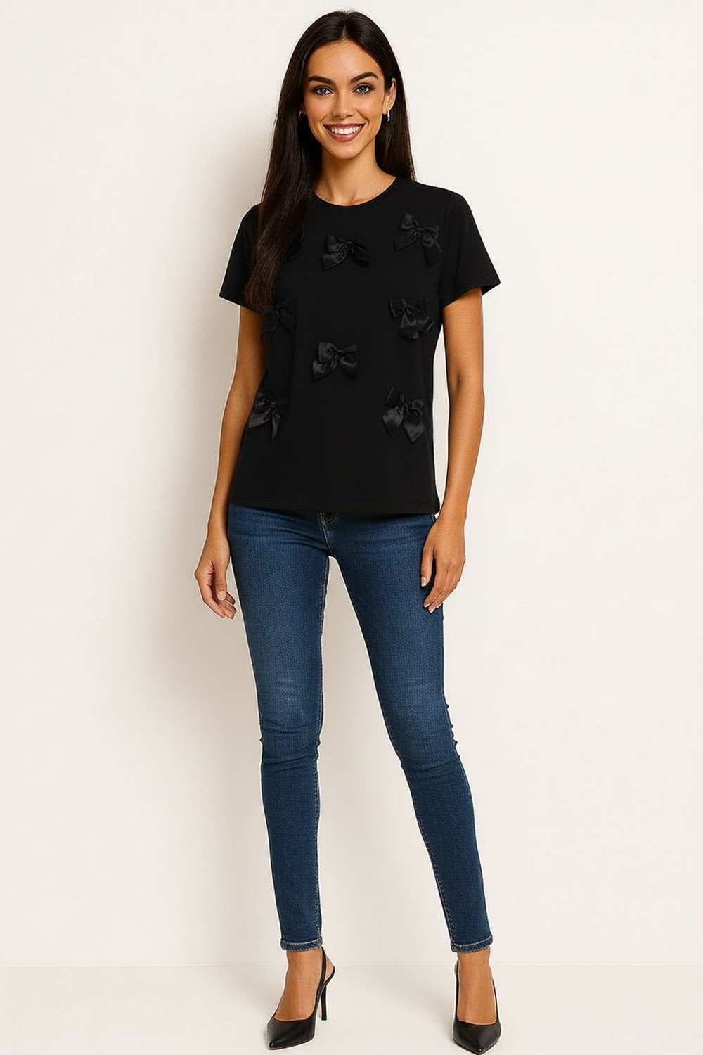 Playera de manga corta con cuello redondo y silueta recta, confección en tejido suave al tacto con aplicaciones brillantes colocadas de manera uniforme, estructura ligera que se adapta al cuerpo, terminaciones limpias en cuello mangas y bajo para mejor presentación