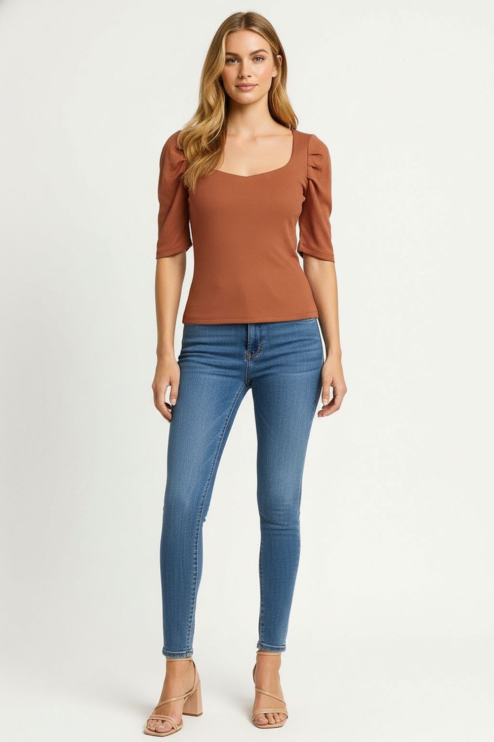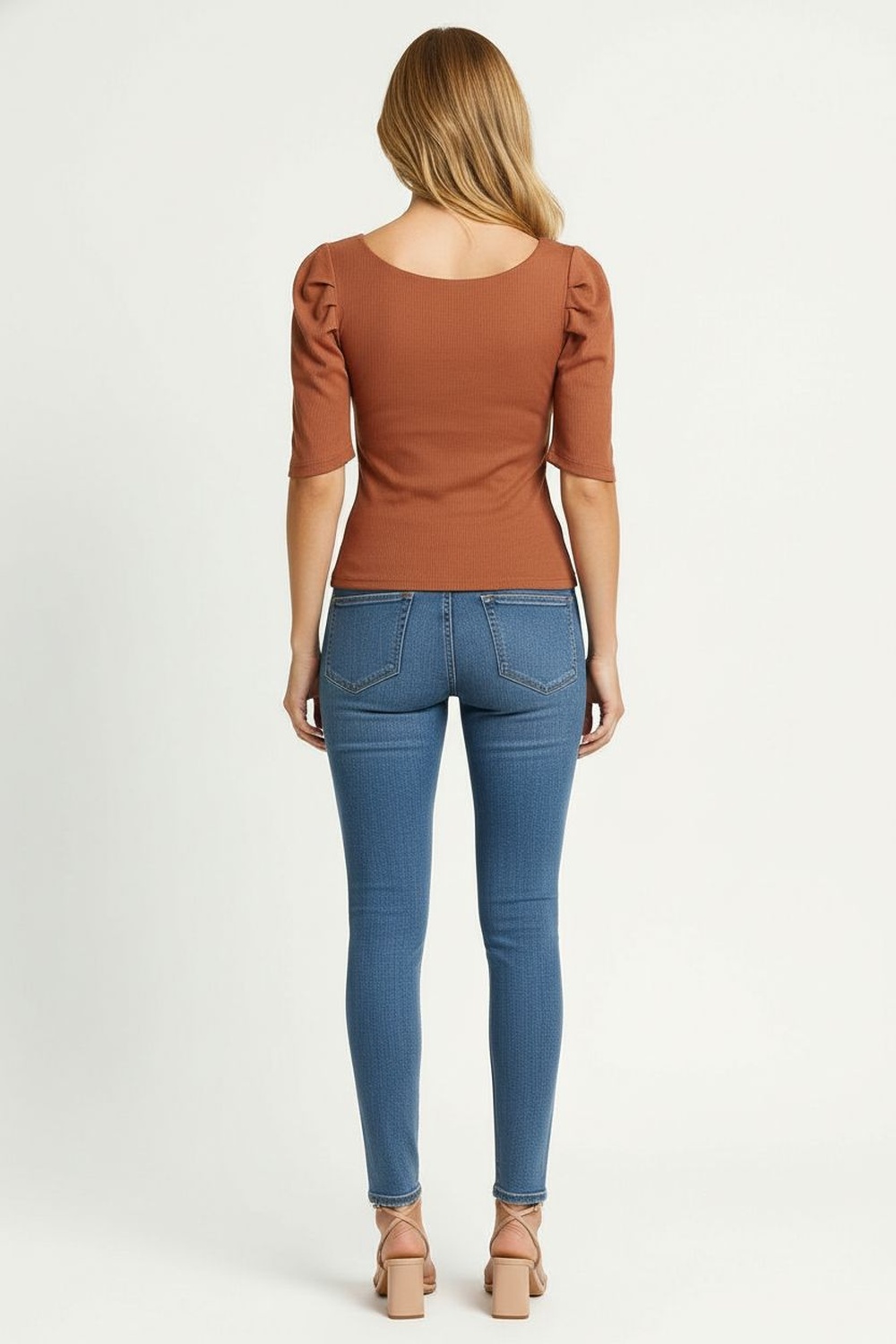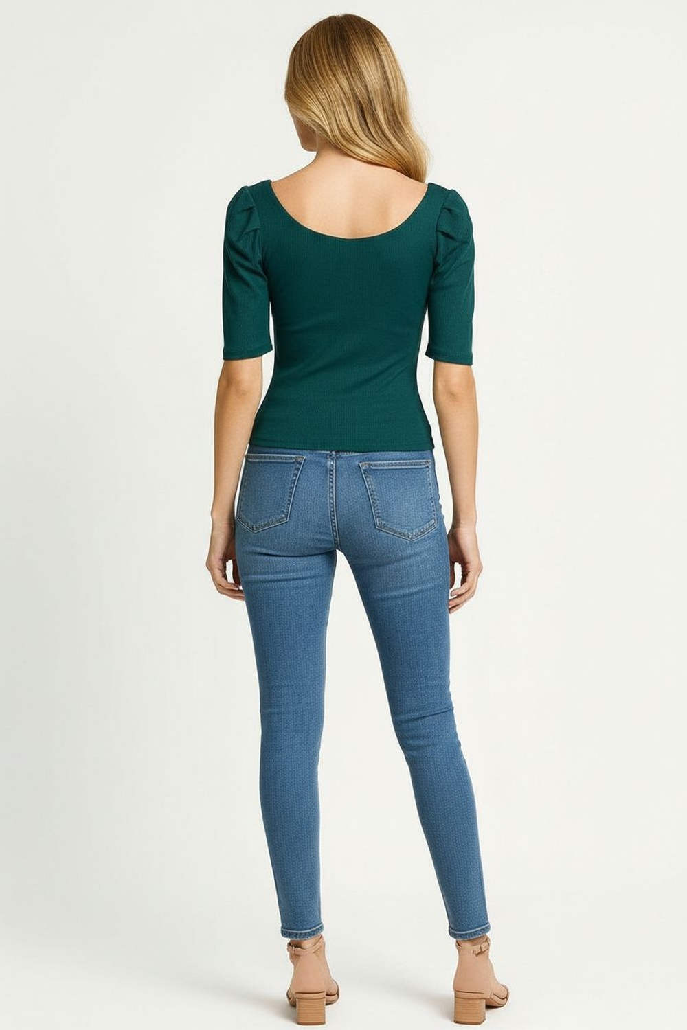 Playera de escote cuadrado con diseño acanalado que aporta textura y comodidad, mangas con tablones que crean volumen sutil y realzan el diseño, corte ajustado que define la silueta y ofrece un look moderno, terminaciones limpias que brindan un acabado pulido y actual, prenda versátil confeccionada en tejido suave y elástico que proporciona confort durante todo el día