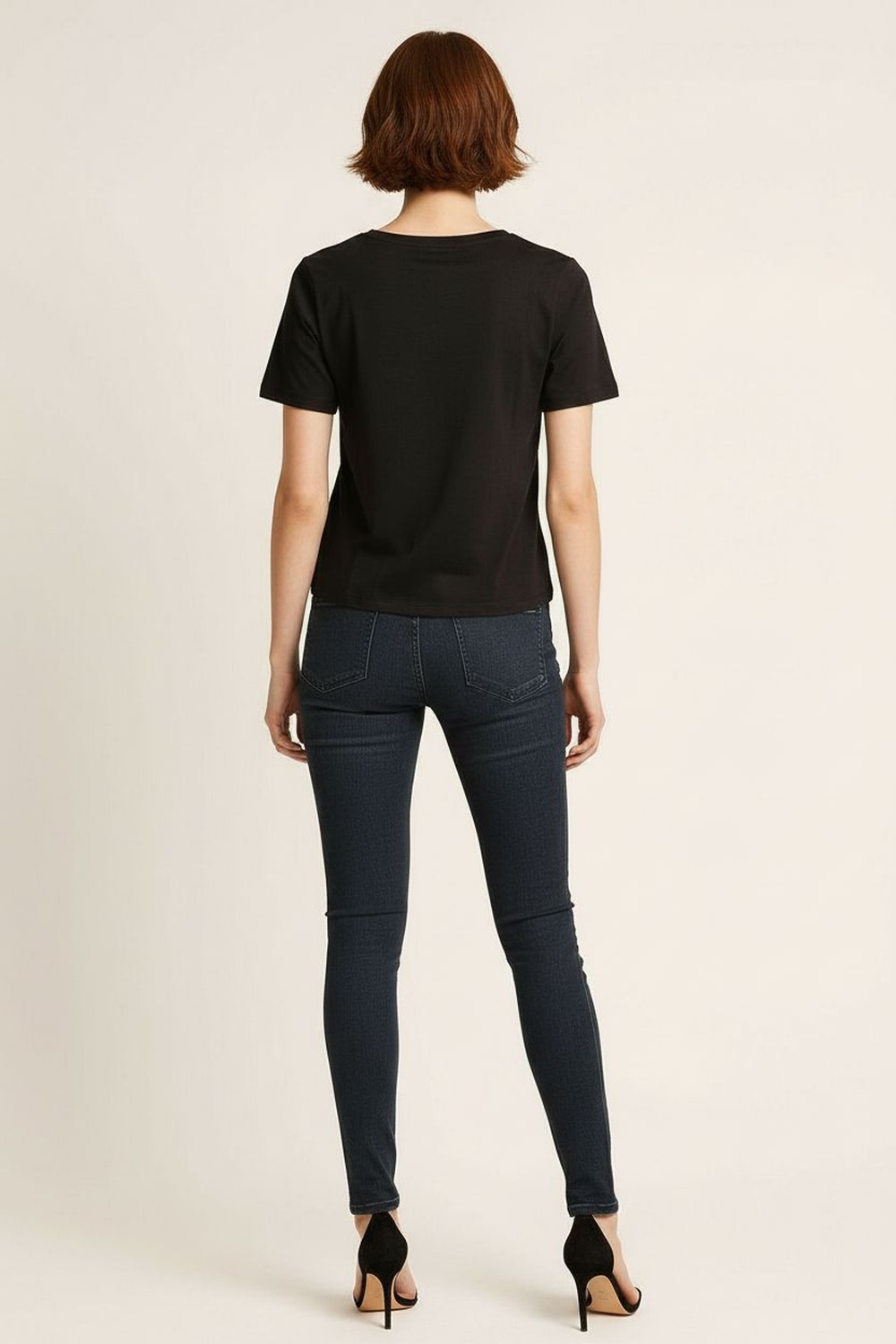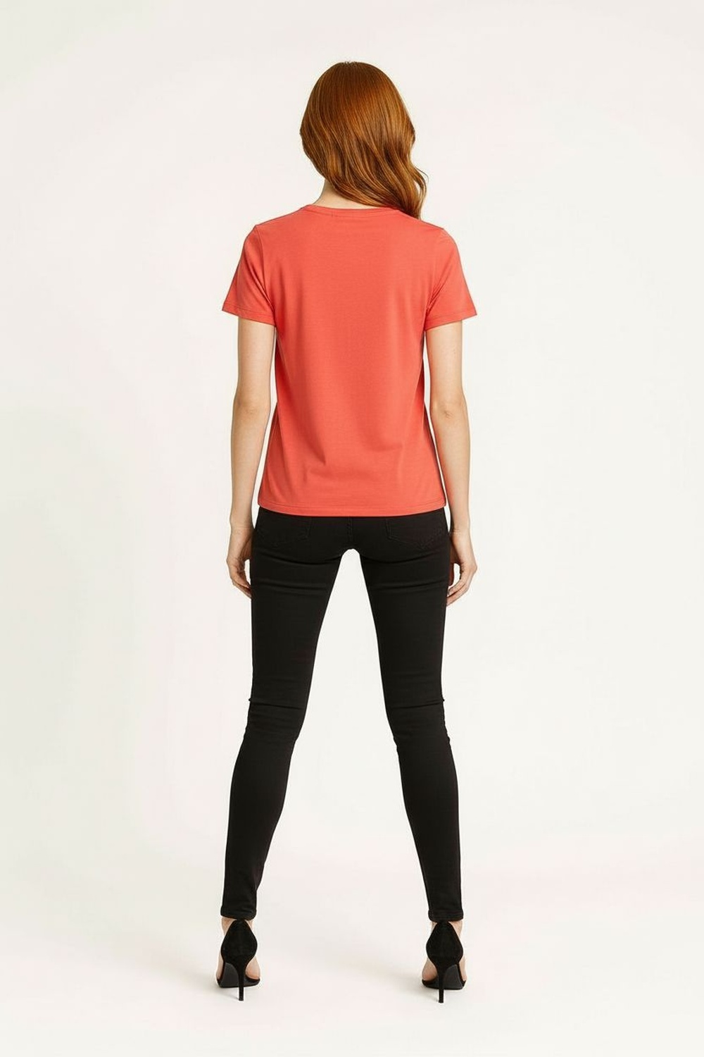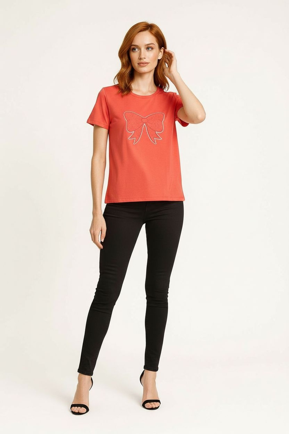 Playera de cuello redondo, manga corta, corte recto, diseño con aplicación frontal en forma de moño, acabado suave al tacto y confección ligera