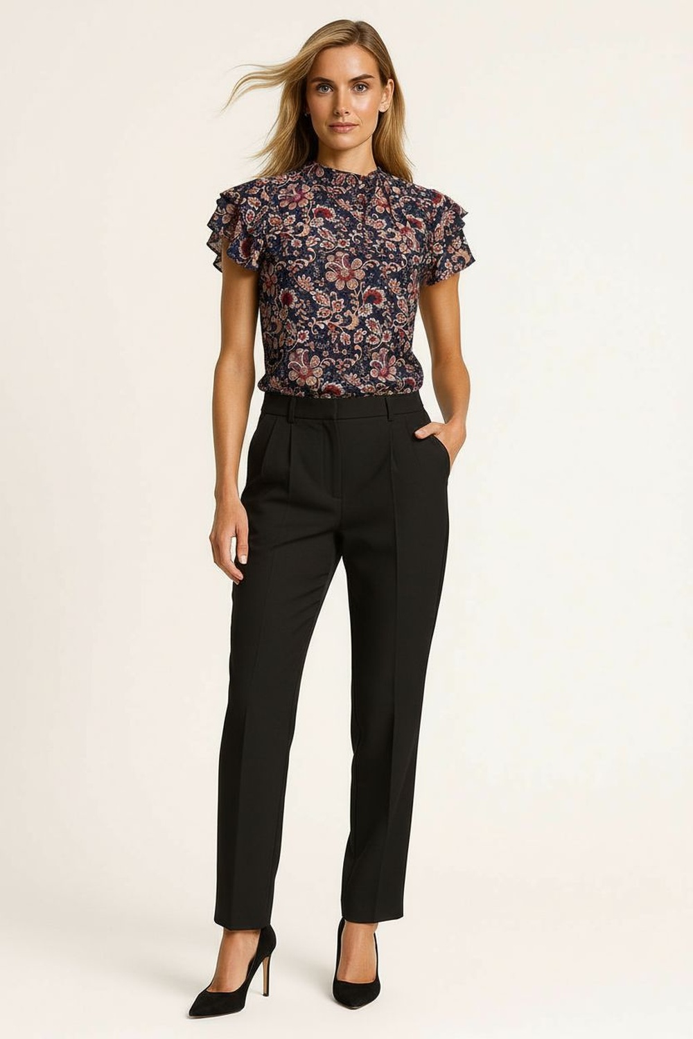 Playera con diseño full print de mariposas contraste, cuello redondo y manga corta, jaretas laterales con detalle fruncido
